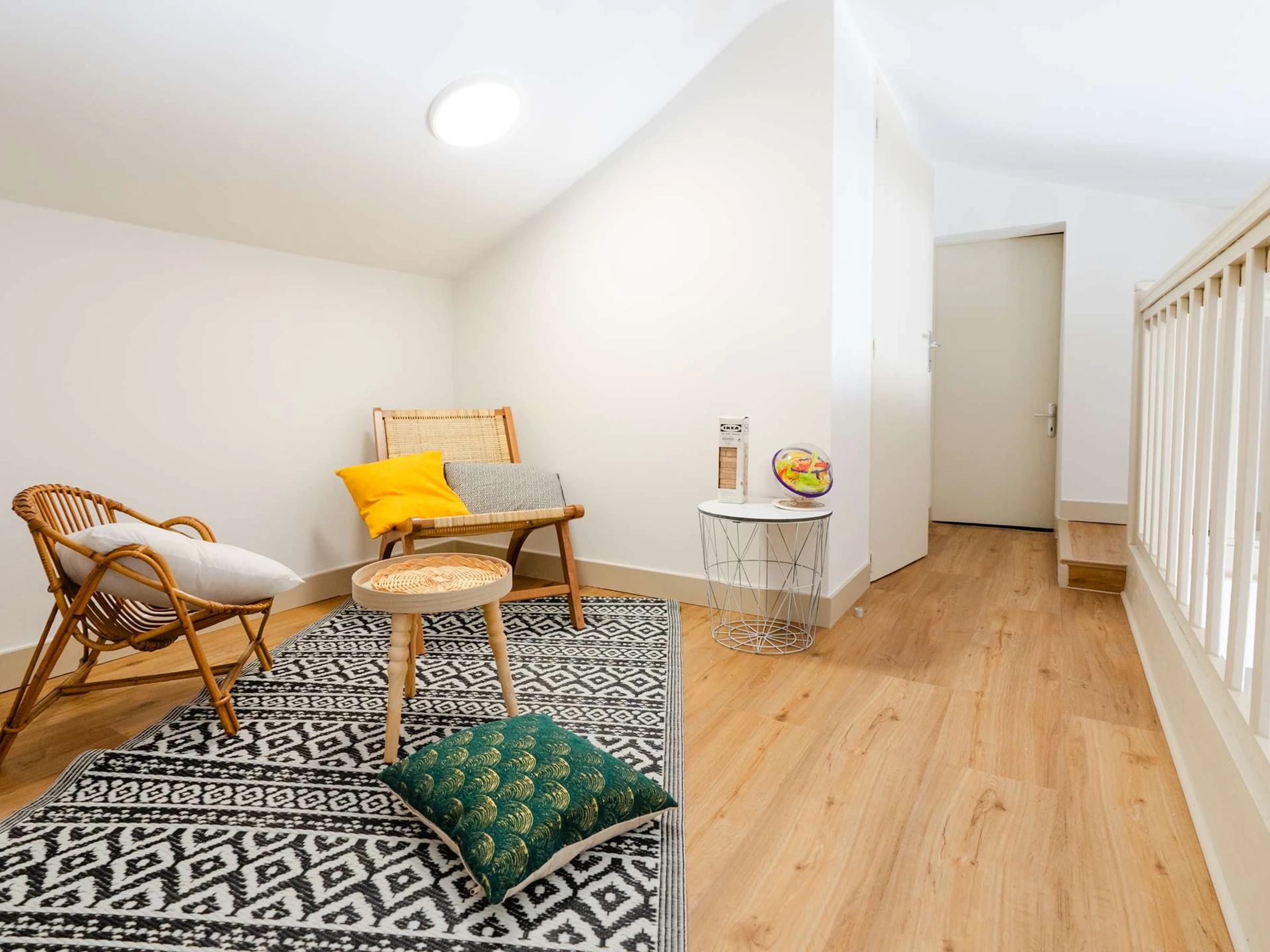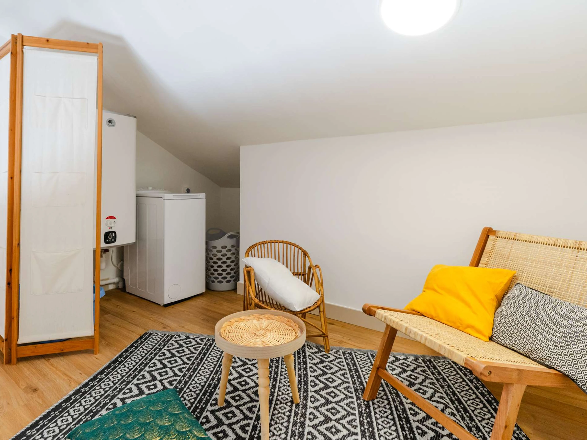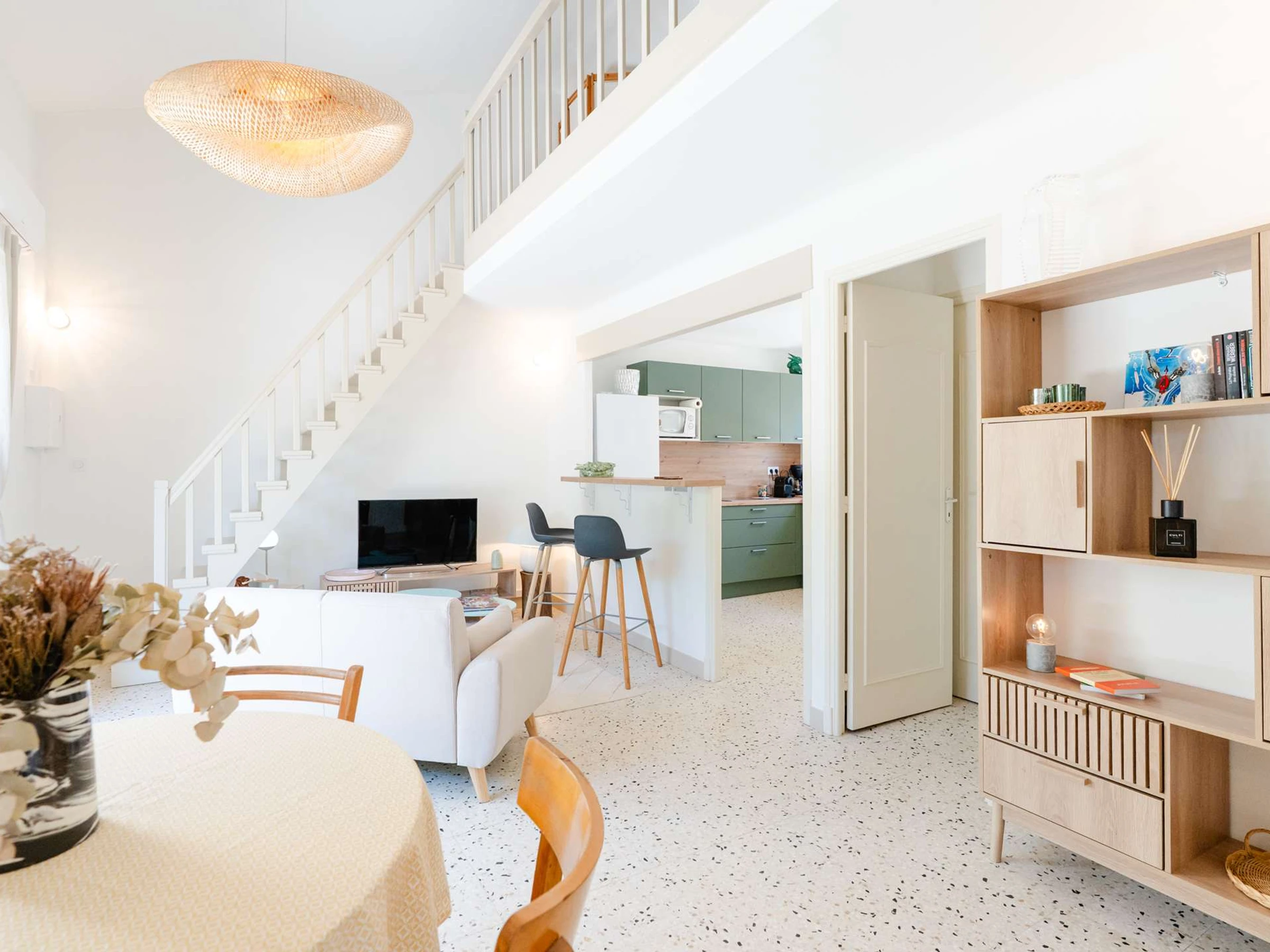 Der Eingang befindet sich auf der Rückseite des Hauses und führt in eine zum Wohnzimmer hin offene, sehr gut ausgestattete Küche (Kühlschrank mit Gefrierfach, Geschirrspüler, Backofen, Mikrowelle, klassische Kaffeemaschine und Nespresso, Induktionskochfeld mit 3 Kochstellen, Dunstabzugshaube, Wasserkocher). Das klimatisierte Wohnzimmer verfügt über einen runden Tisch für 4 Personen, ein Sofa für 2 Personen und einen Fernseher (französische Sender) mit Zugang zur Terrasse vor dem Haus.