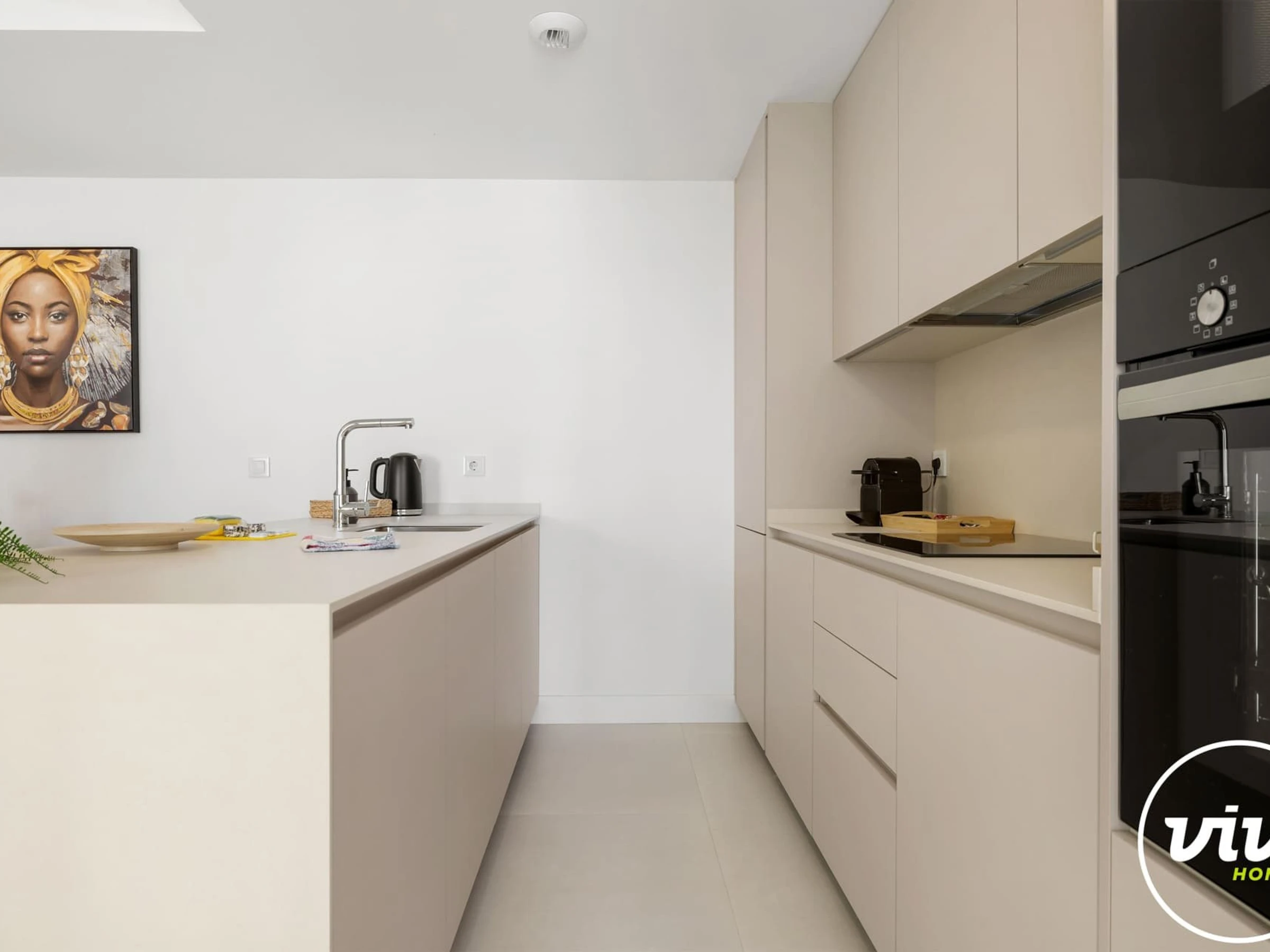 Dieses offene küche, mit induktions-kochfeld, ist ausgestattet in kühlschrank, mikrowelle, backofen, gefrierschrank, spülmaschine, geschirr/besteck, kochutensilien, kaffeemaschine, toaster und wasserkocher.