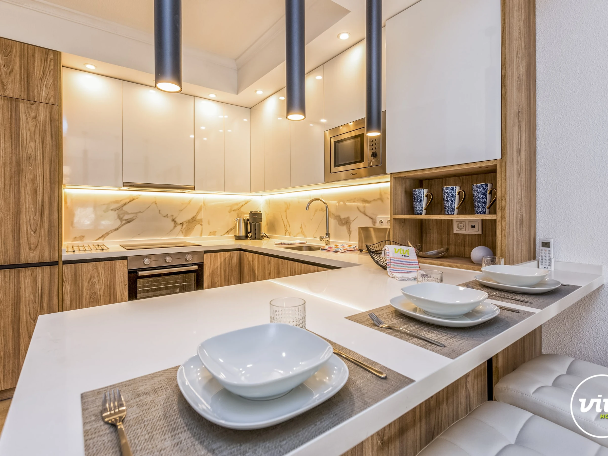 Dieses offene küche, mit induktions-kochfeld, ist ausgestattet in kühlschrank, mikrowelle, backofen, gefrierschrank, spülmaschine, geschirr/besteck, kochutensilien, kaffeemaschine, wasserkocher, küchengeschirr, teller und schüsseln.