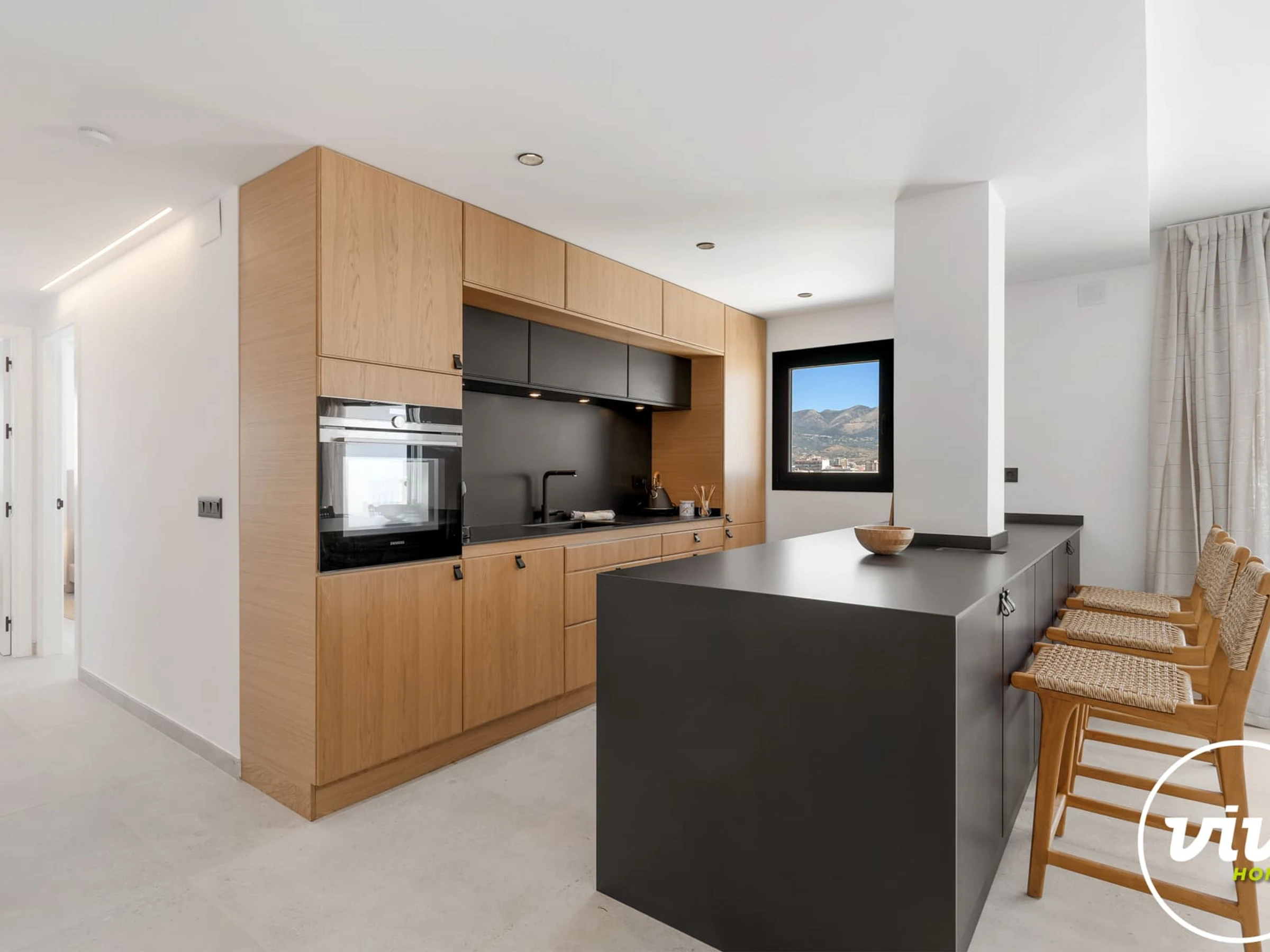 Dieses offene küche, mit induktions-kochfeld, ist ausgestattet in kühlschrank, mikrowelle, backofen, gefrierschrank, spülmaschine, geschirr/besteck, kochutensilien, kaffeemaschine, toaster, wasserkocher, saftpresse und küchengeschirr.