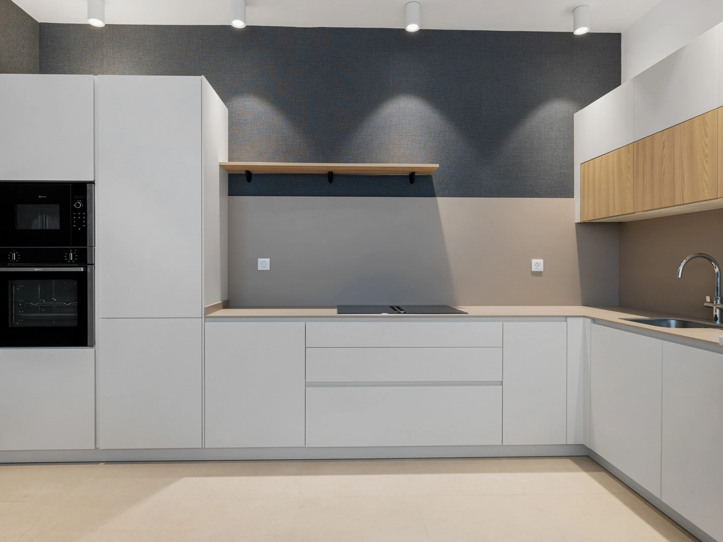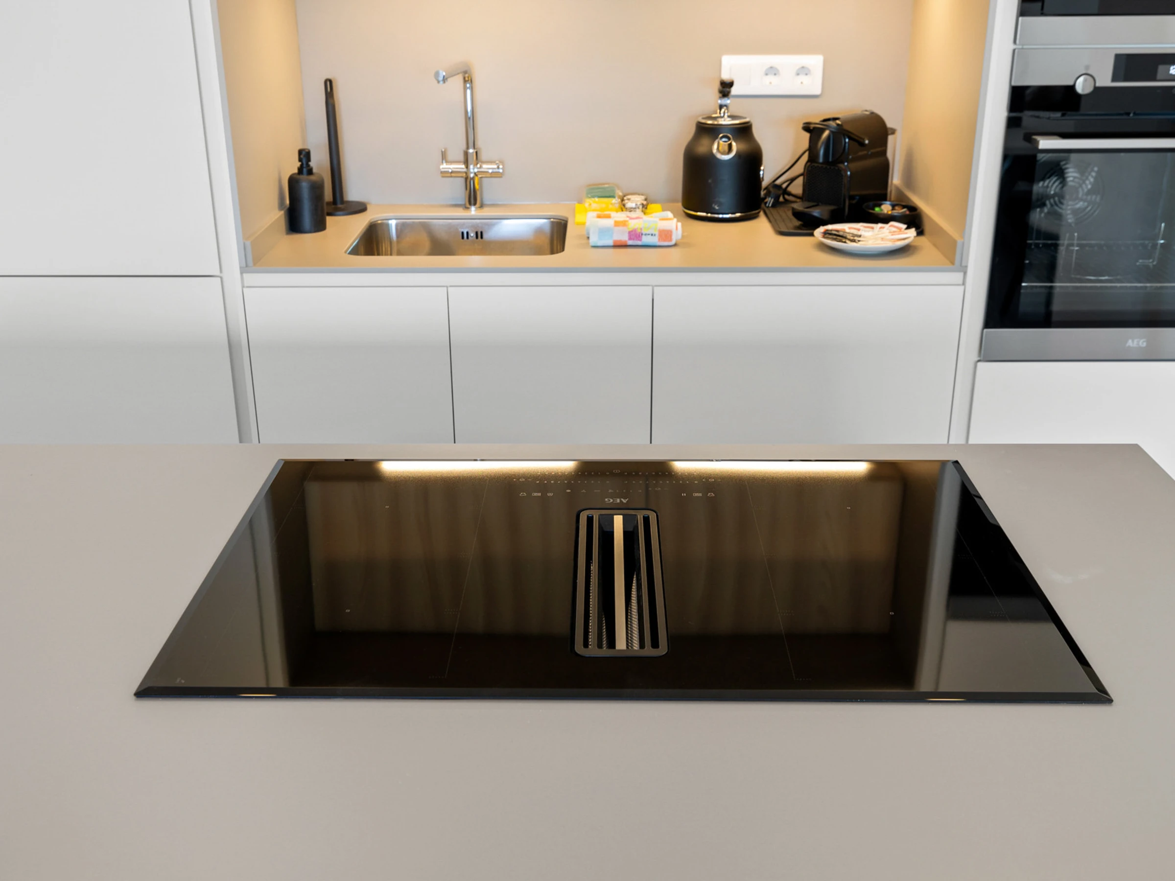 Dieses offene küche, mit induktions-kochfeld, ist ausgestattet in kühlschrank, mikrowelle, backofen, gefrierschrank, spülmaschine, geschirr/besteck, kochutensilien, kaffeemaschine, toaster, wasserkocher, saftpresse und küchengeschirr.
