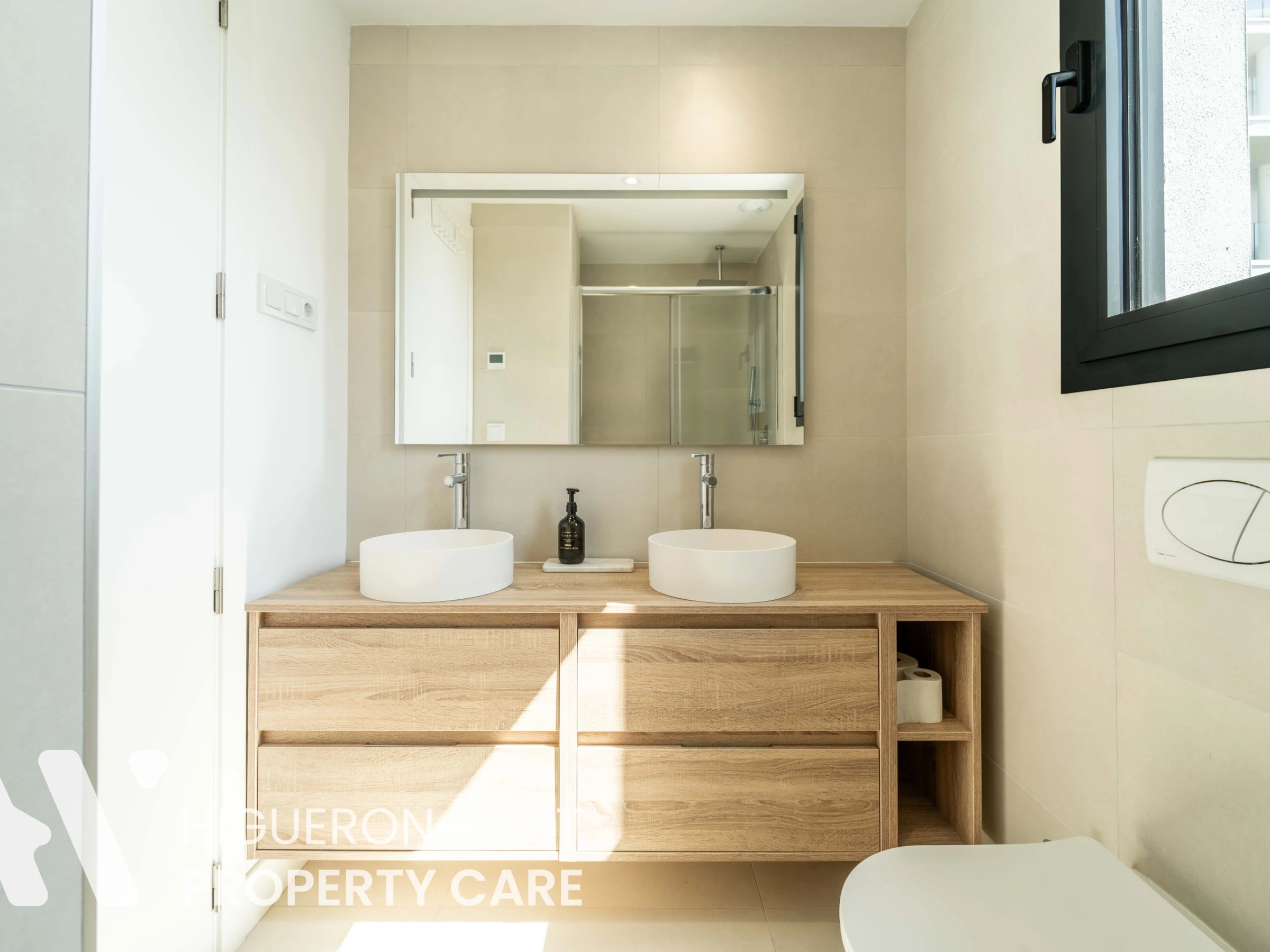 Die Wohnung verfügt über drei geräumige Schlafzimmer und zwei moderne Badezimmer, beide mit begehbaren Duschen. Der helle und luftige Wohnbereich, eingerichtet mit nordisch inspirierter Möblierung, führt auf einen privaten Balkon — perfekt für den Morgenkaffee oder das Abendglas Wein. Die offene Küche ist vollständig ausgestattet, und es gibt einen gemütlichen Loungebereich mit einem Smart-TV im Wohnzimmer.