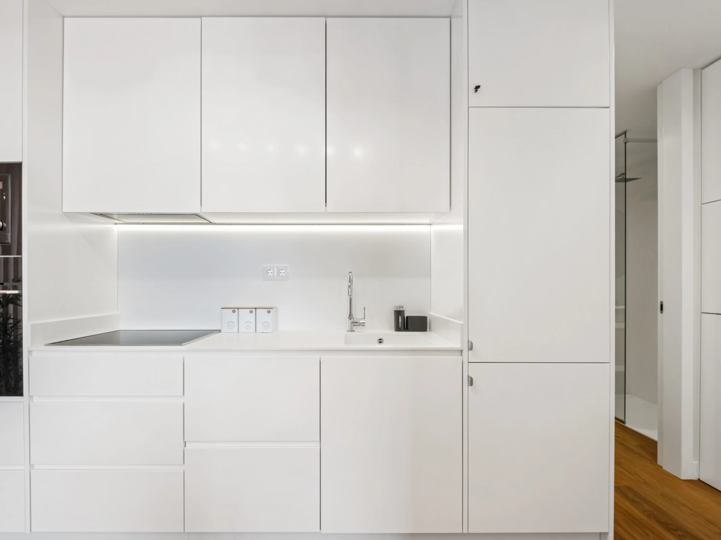 Dieses offene küche, mit induktions-kochfeld, ist ausgestattet in kühlschrank, mikrowelle, backofen, gefrierschrank, spülmaschine, geschirr/besteck, kochutensilien, kaffeemaschine, toaster, wasserkocher, teller und schüsseln, küchengeschirr.