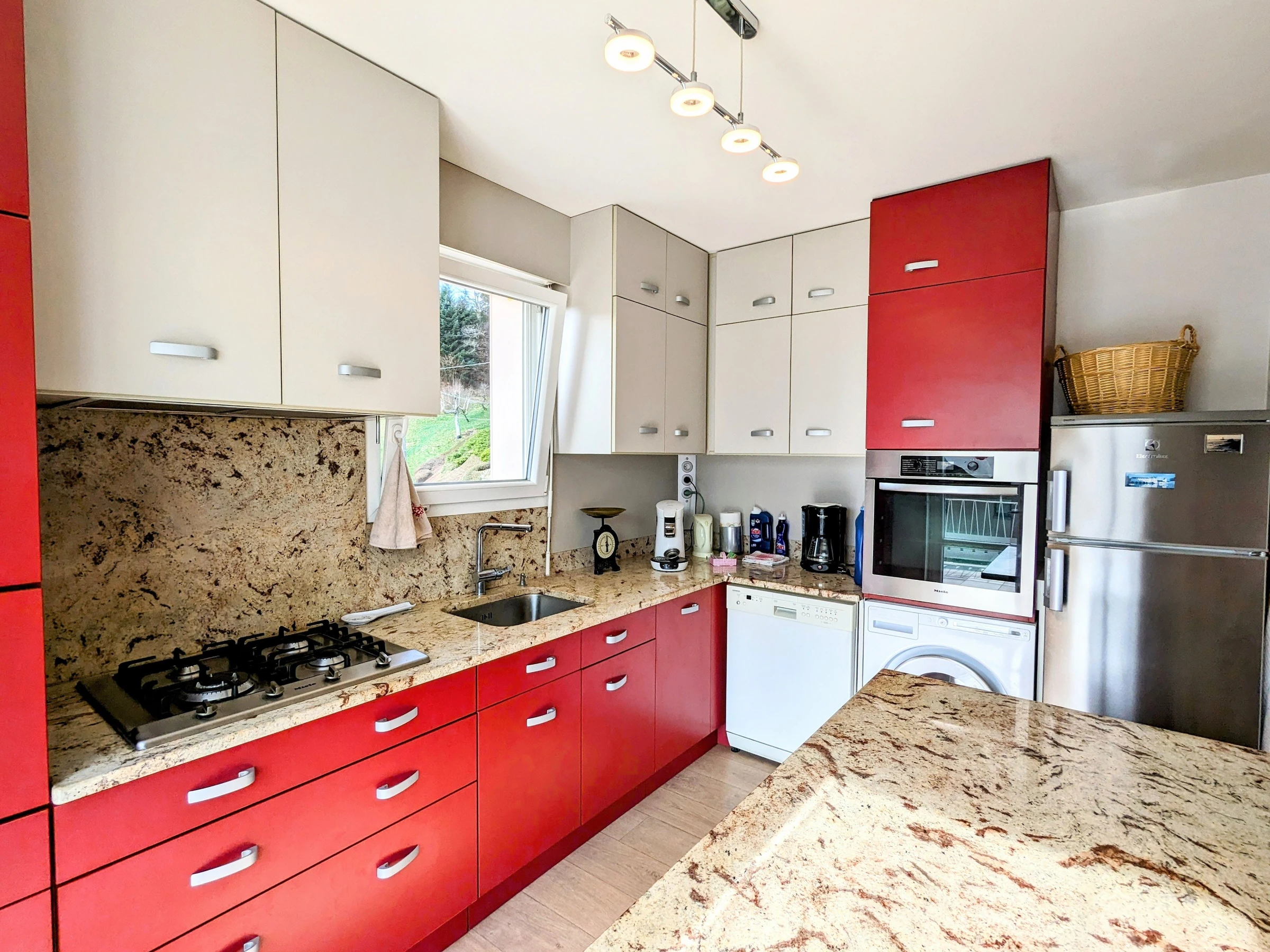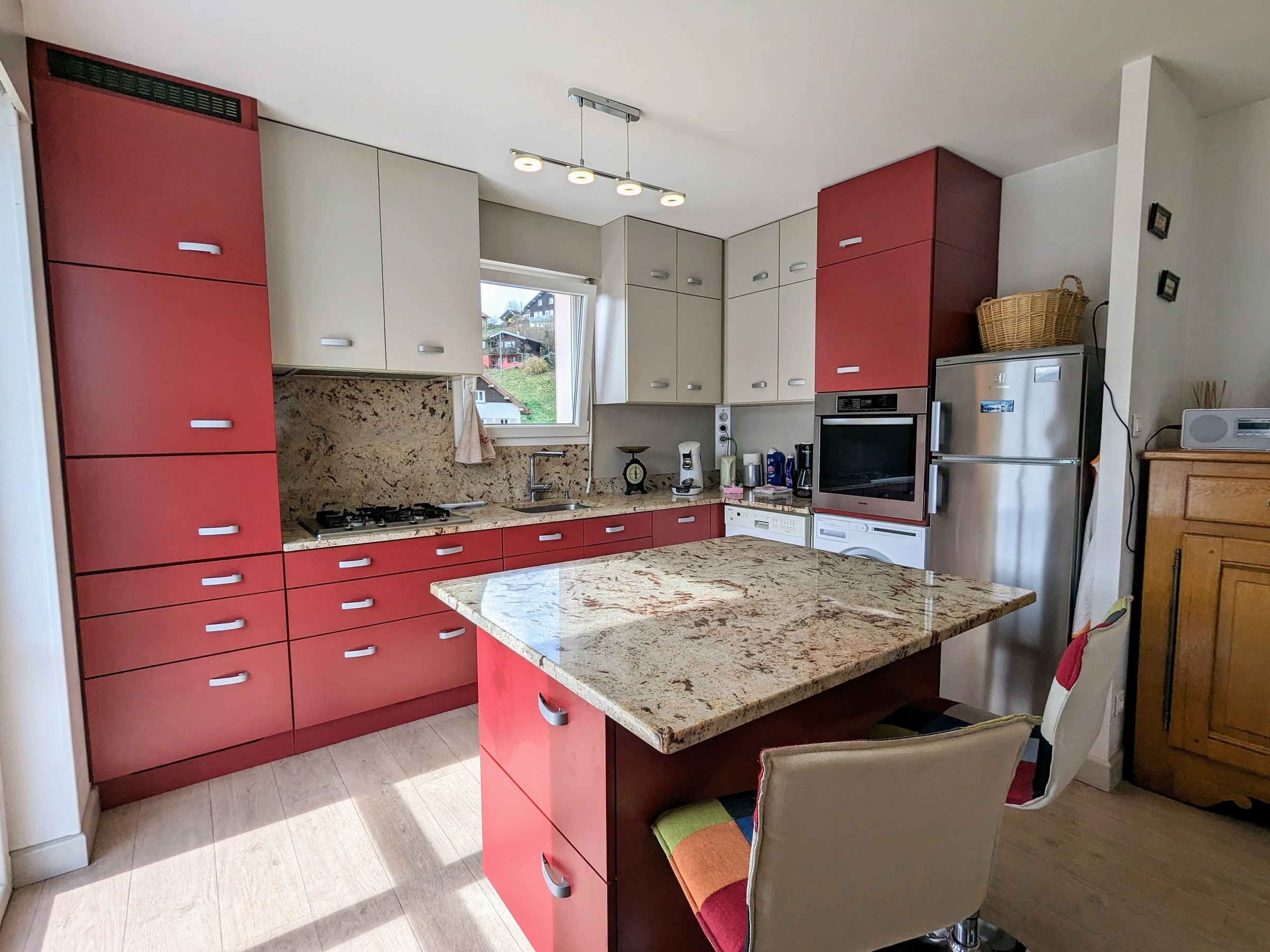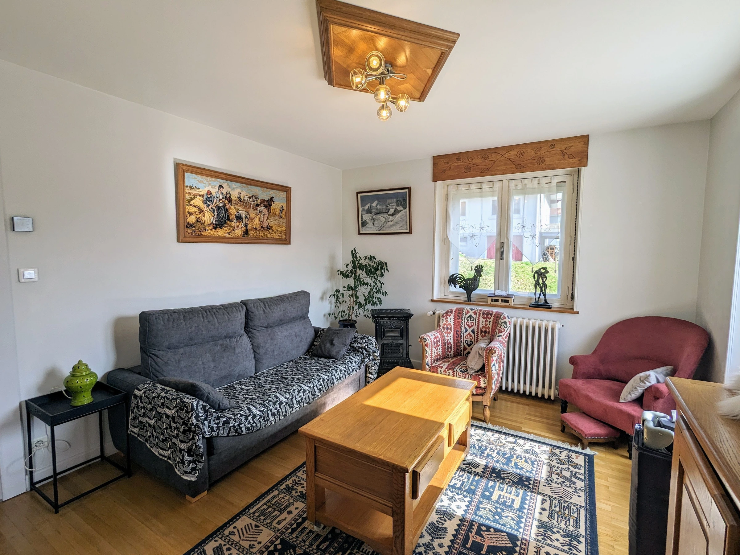 - Ein Wohnzimmer mit: einer ausgestatteten Küche, 4 Gasbrennern, Backofen, Kühlschrank mit Gefrierfach. Spülmaschine. Mikrowelle. Filter- und Senseo-Kaffeemaschine, Toaster, Wasserkocher. Waschmaschine. Küchenset. Raclettegerät, Stabmixer, elektrischer Zerkleinerer und Waffeleisen. Ein Essbereich, der Platz für bis zu 4 Personen bietet. Ein Loungebereich mit 140/190 umwandelbarem Sofa (Lattenrost mit 10 cm dicker Matratze). FERNSEHER. W-LAN.