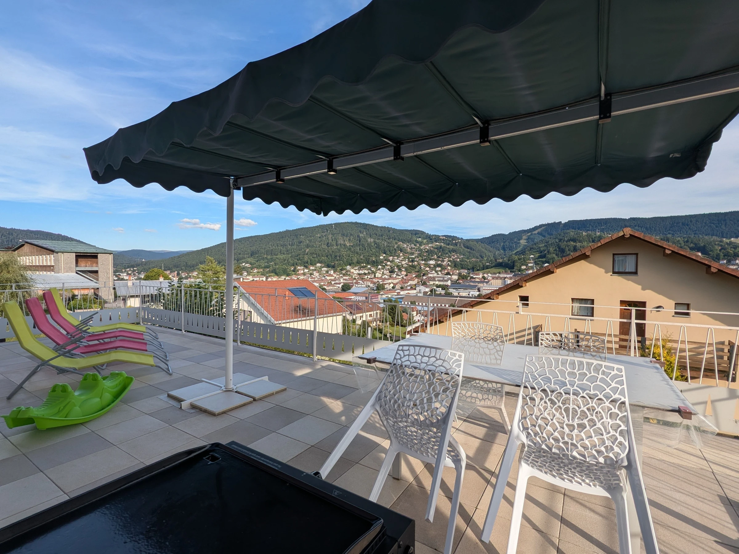 - Eine große Terrasse mit Gartenmöbeln, Sonnenschirm und elektrischer Plancha.