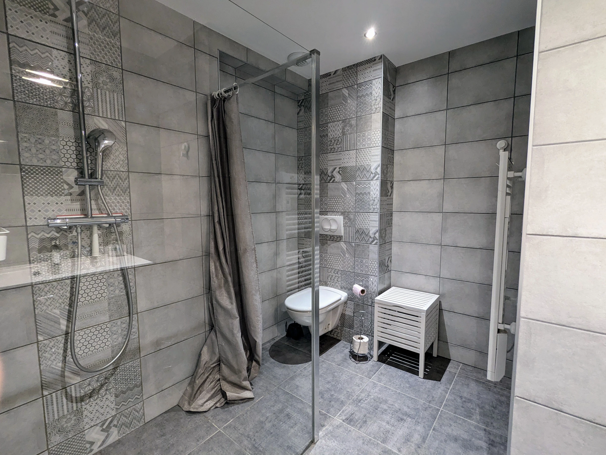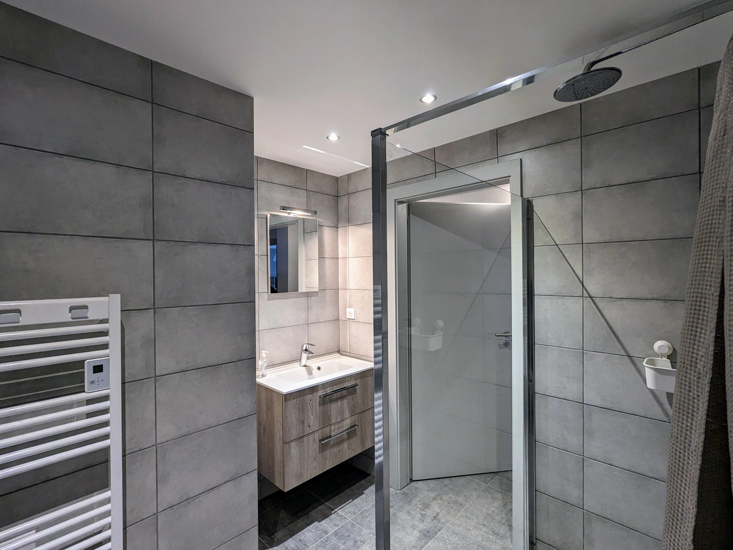 Badezimmer mit ebenerdiger Dusche (120/100 cm), Waschbecken, Föhn und beheiztem Handtuchhalter.