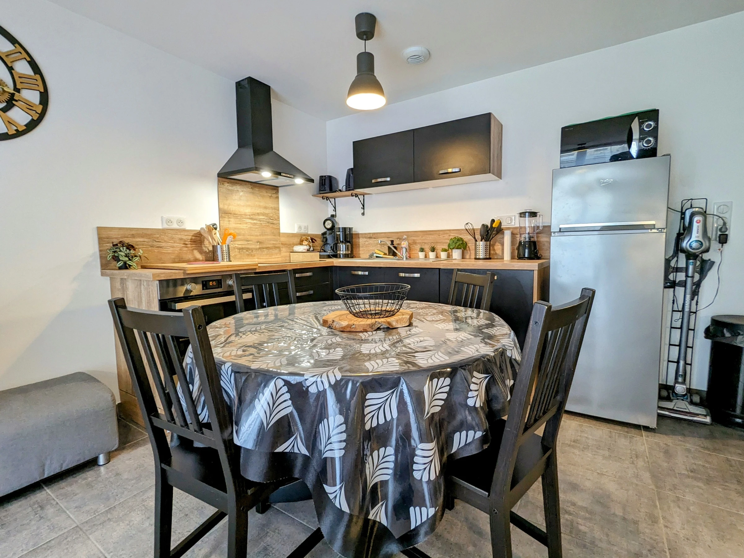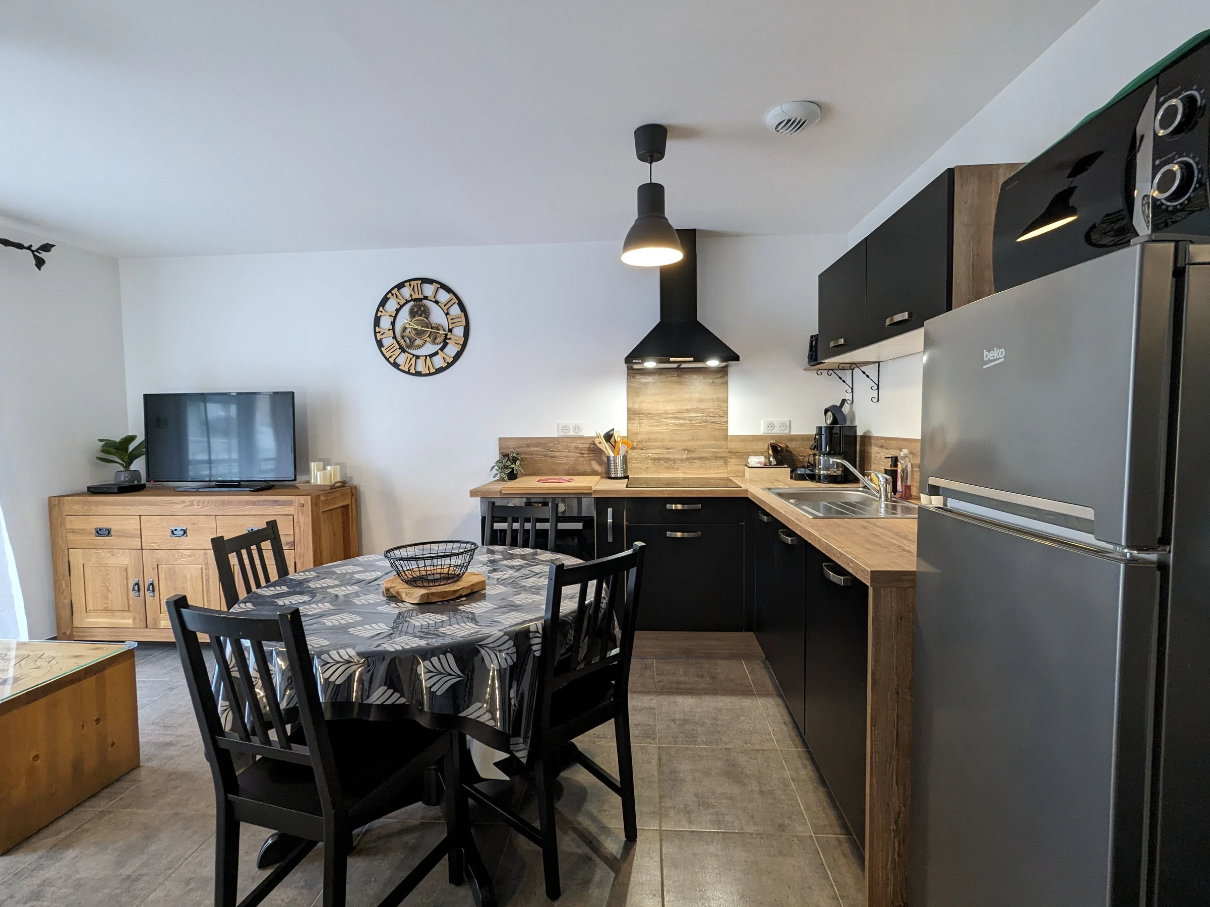 - Ein Wohnzimmer mit: Einer voll ausgestatteten Küche mit 3 Induktionskochfeldern, Backofen und Kühlschrank mit Gefrierfach. Geschirrspüler. Mikrowelle. Filterkaffeemaschine und Senseo-Maschine, Toaster, Wasserkocher. Küchenutensilien. Raclettegrill, Fondue-Set, Zitruspresse, Stabmixer, elektrische Küchenmaschine und Waffeleisen.