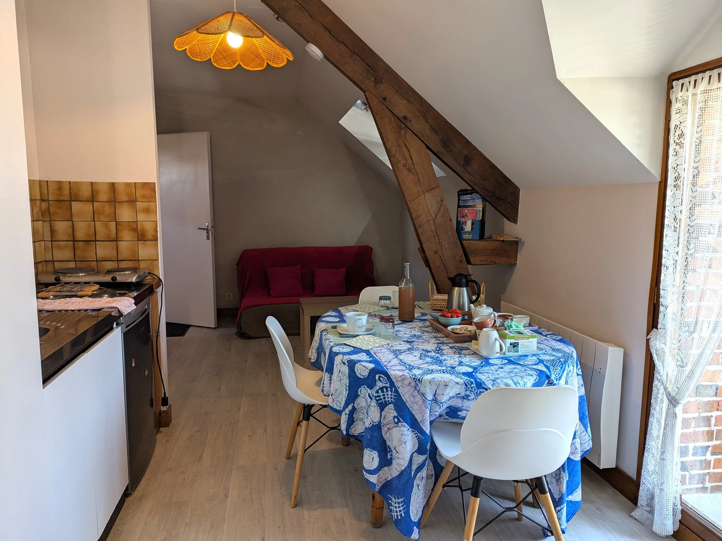 Gemeinsam mit den anderen Zimmern: Gemeinsamer Speisesaal mit Kochnische (Spüle, Mikrowelle, Minibackofen, Elektroherd), in dem das Frühstück serviert wird. Das Frühstück ist im Mietpreis inbegriffen.