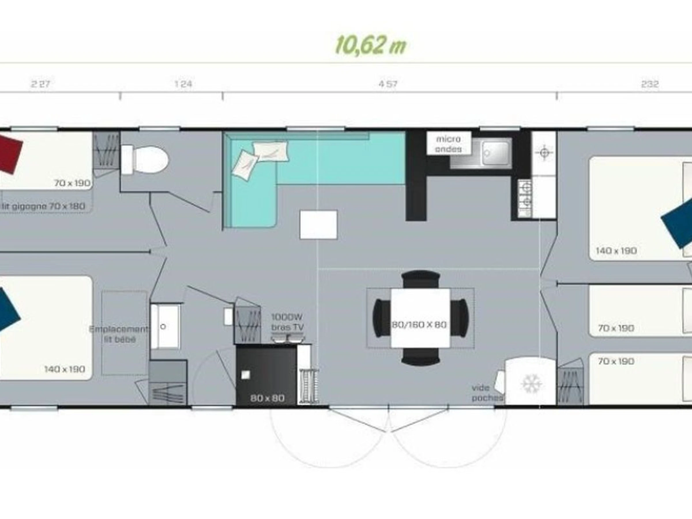 42 m² großes Mobilheim für 8 Personen: