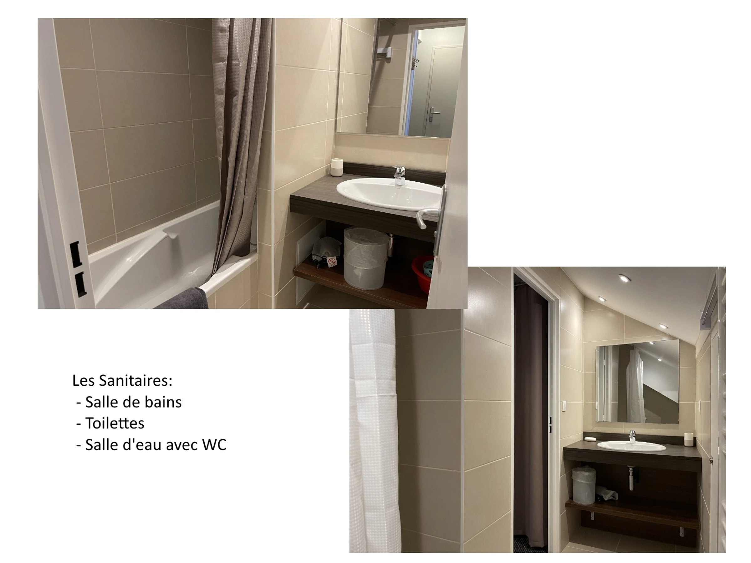 Badezimmer: Waschbecken, Badewanne und Föhn. Separates WC.