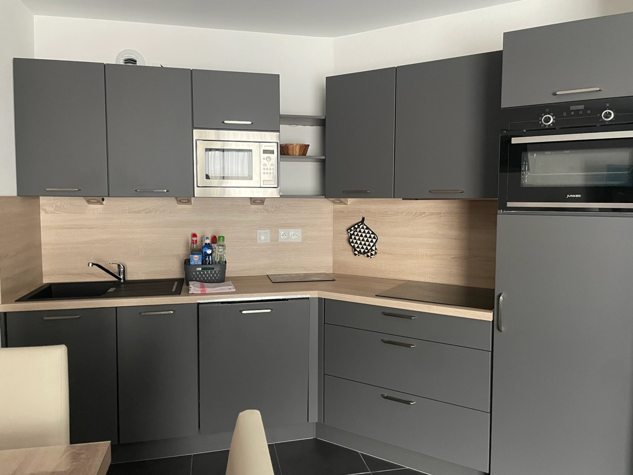 Offene Küche: Kühlschrank mit Gefrierfach, 4-Platten-Herd, Backofen, Mikrowelle, Geschirrspüler, Filterkaffeemaschine, Toaster, Wasserkocher, Küchenmaschine.