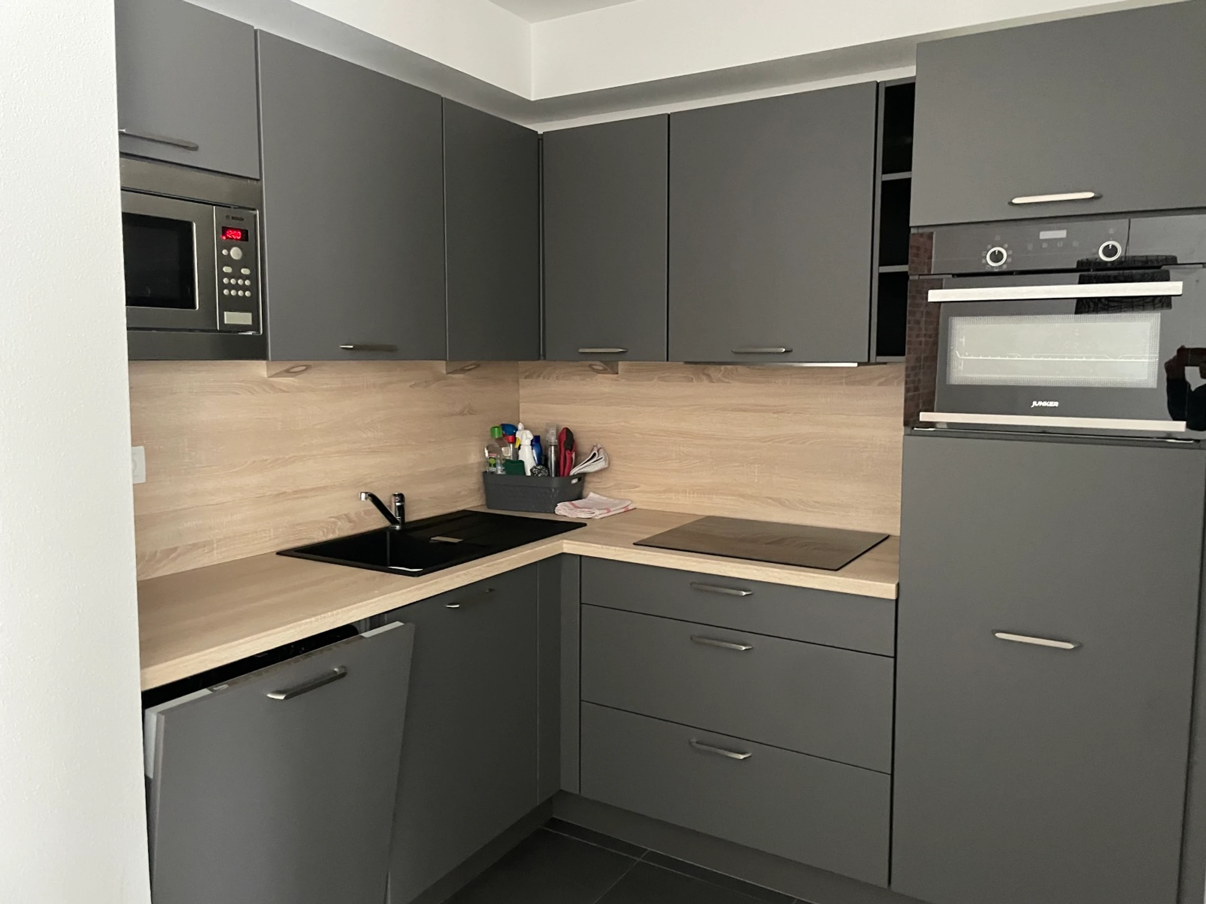 Offene Küche: Kühlschrank mit Gefrierfach, 4-Platten-Herd, Backofen, Mikrowelle, Geschirrspüler, Filterkaffeemaschine, Toaster, Wasserkocher, Küchenmaschine.