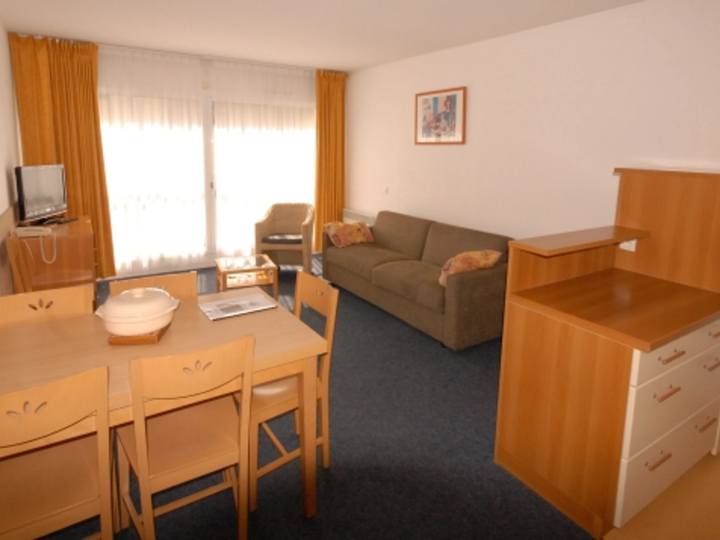 Wohnzimmer mit Doppelschlafsofa und Fernseher.