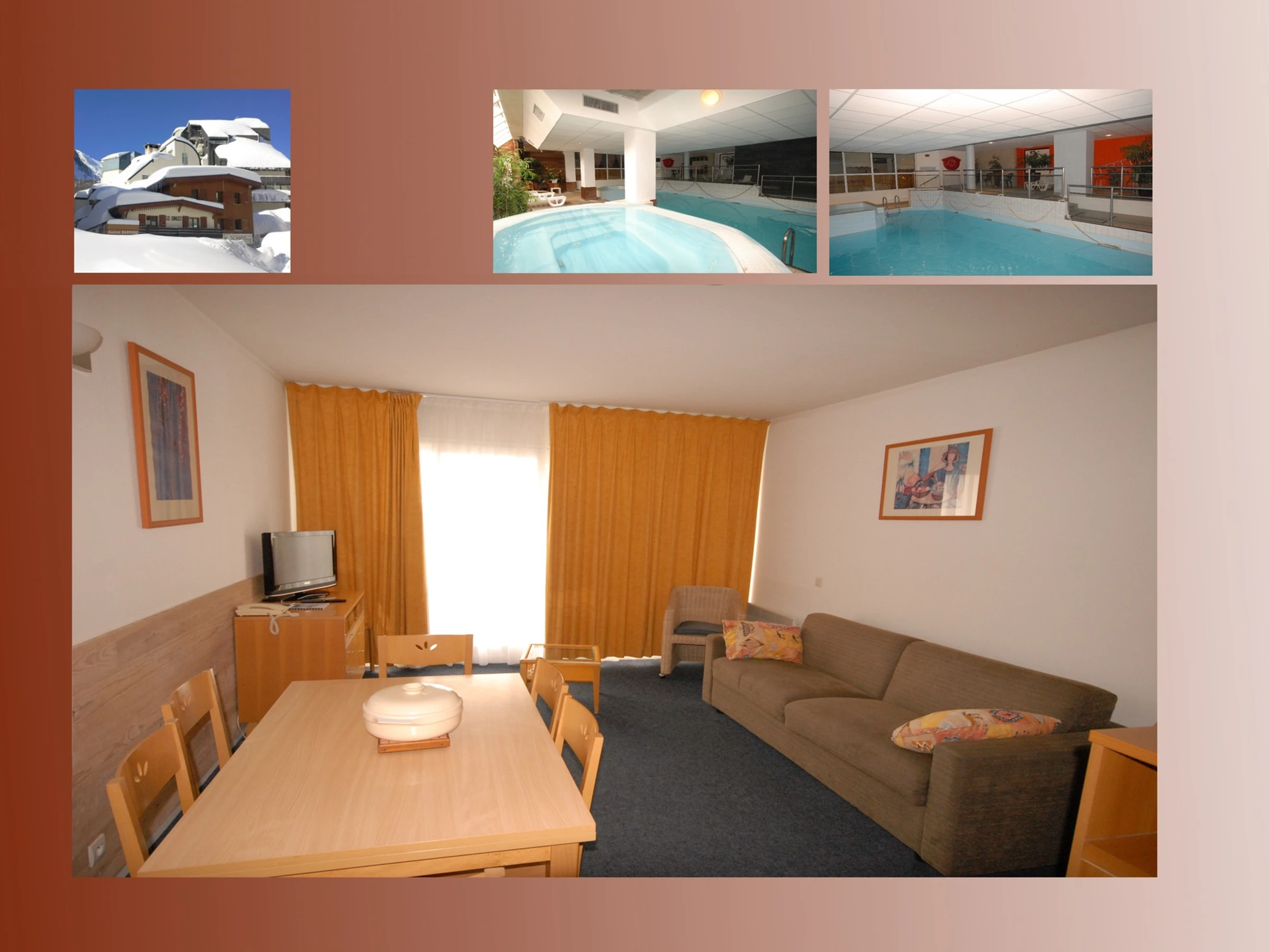 Ferienhaus LE CHALET mit Pool, 2-Zimmer-Apartment für 6 Personen, 2. Etage, Blick auf die Piste, 48 m², Südwestlage, beheizter Skiraum, Elektroheizung.
