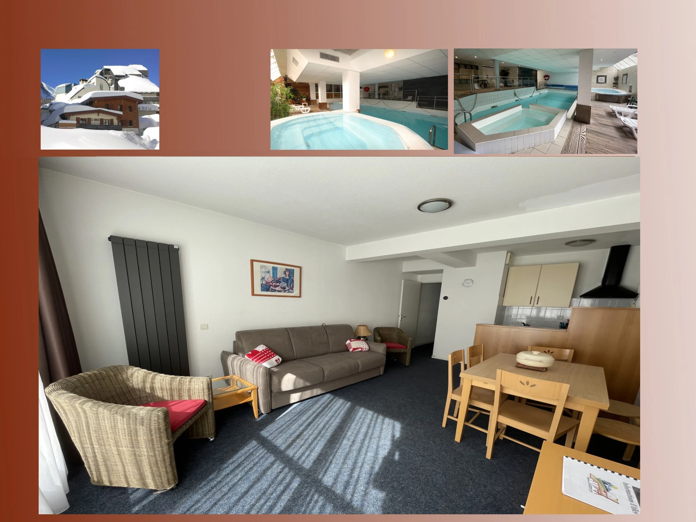 LE CHALET-Residenz mit Pool, 2-Zimmer-Apartment für 6 Personen, 1. Etage, Blick auf die Piste, 42 m², Südwestlage, beheizter Skiraum, Elektroheizung.