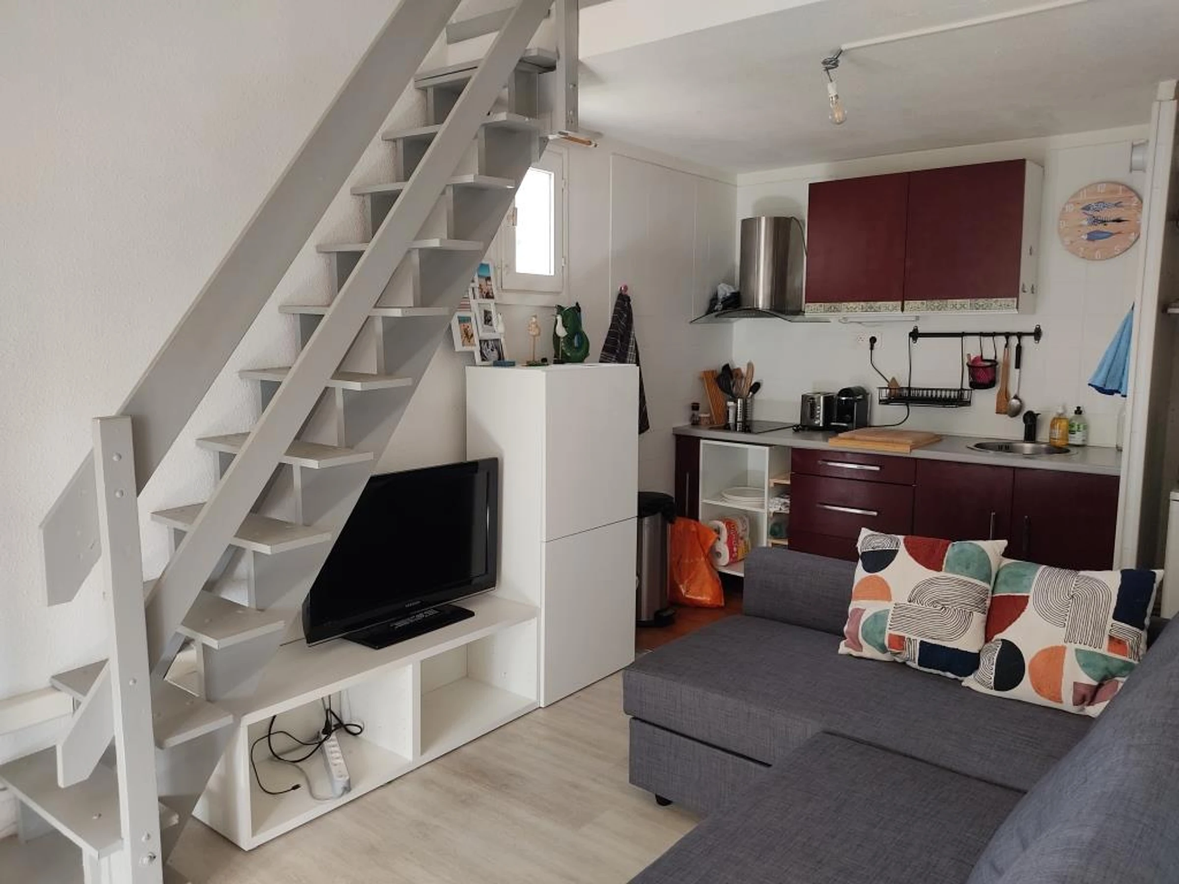 Ausgestattete Küche mit Zugang zum Wohnzimmer (Doppelschlafcouch, TV), komfortables Schlafzimmer (Doppelbett), Galerie mit Blick auf das Wohnzimmer (2 Betten à 90 cm), Duschbad (WC).
