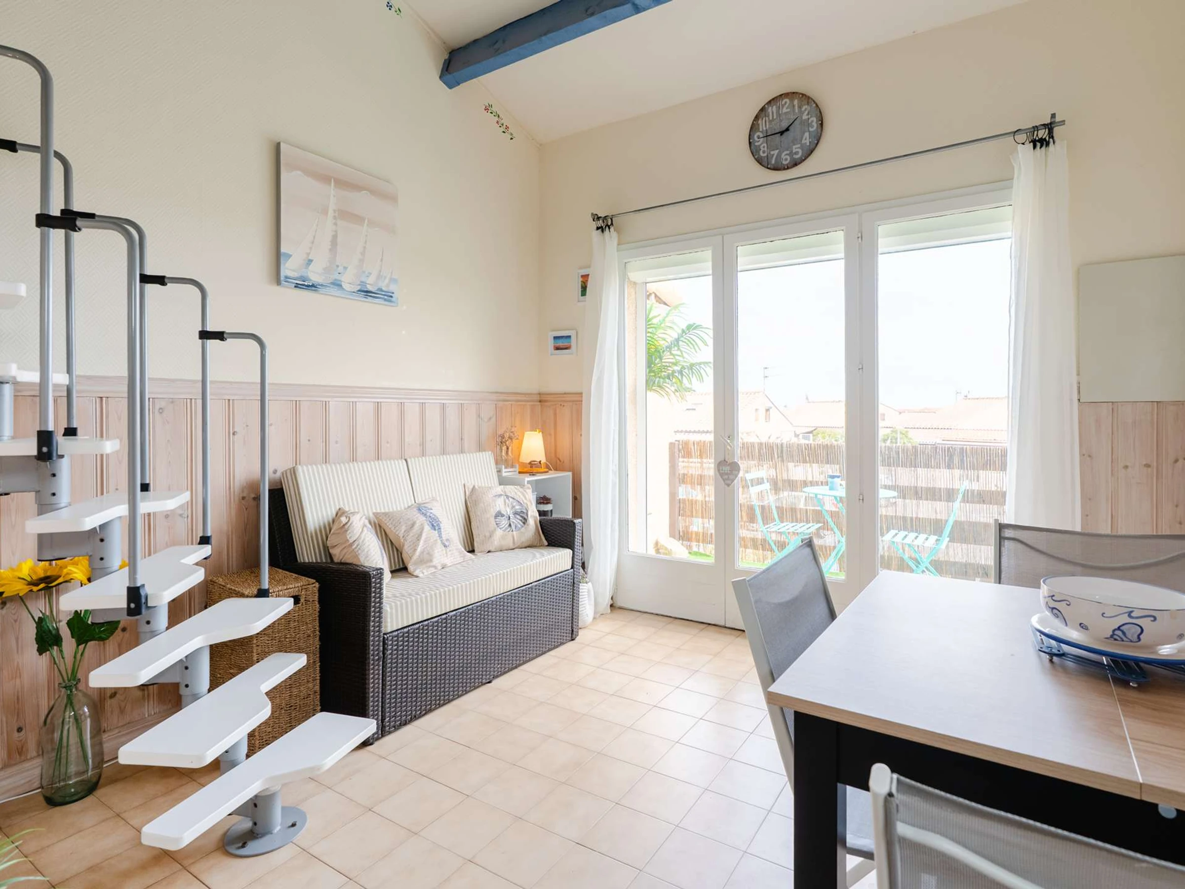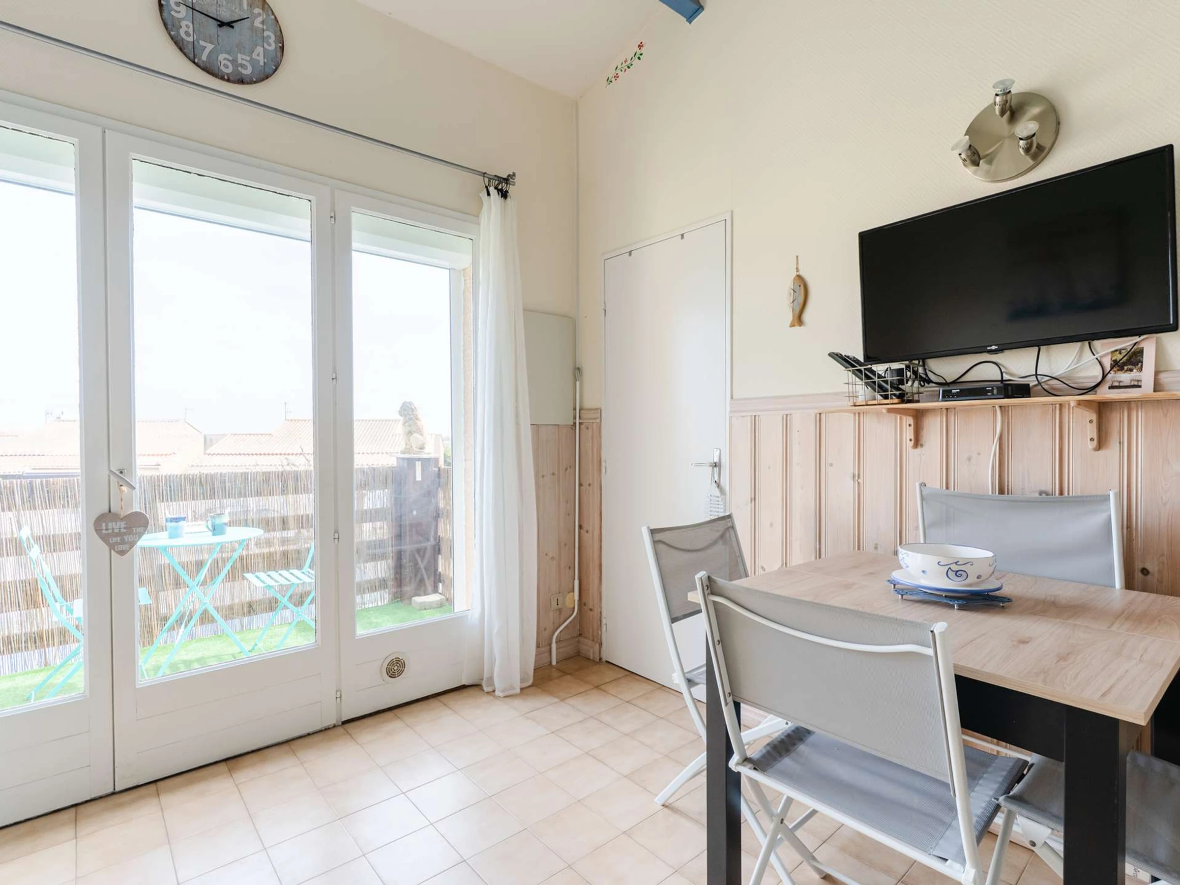 Sie verfügt über einen gemütlichen Wohnbereich mit einem 2-Sitzer-Sofa, Fernseher (DVB-T) und einem Tisch für 4 Personen.