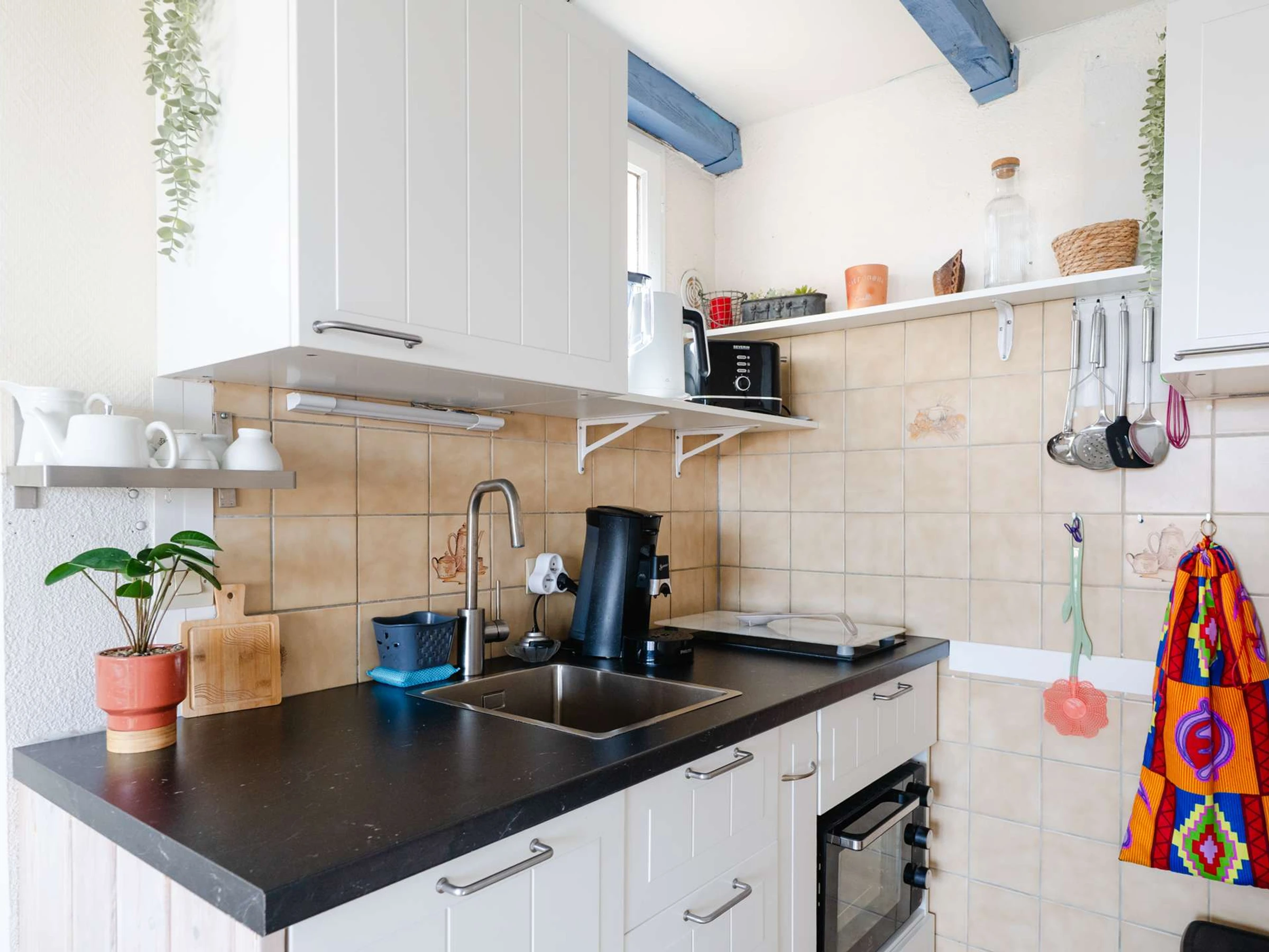 Die Küchenzeile verfügt über einen Induktionsherd mit 2 Kochfeldern, eine Senseo-Kaffeemaschine, einen Toaster, einen Wasserkocher, einen Backofen, einen großen Kühlschrank mit Gefrierfach und einen Geschirrspüler.