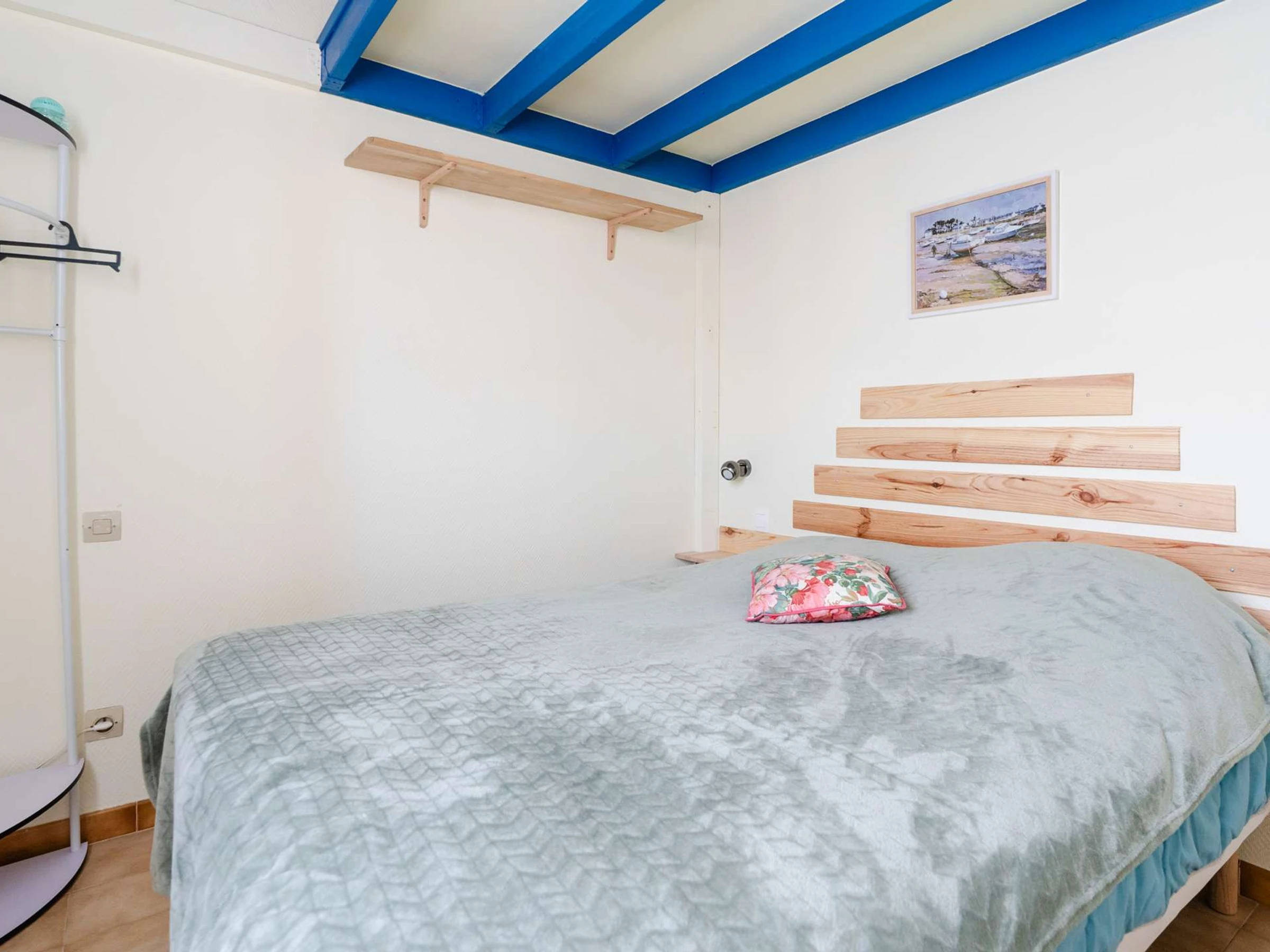 Ein separates Schlafzimmer ist mit einem Doppelbett und einem Hochbett zur Aufbewahrung Ihrer sperrigen Gegenstände ausgestattet.