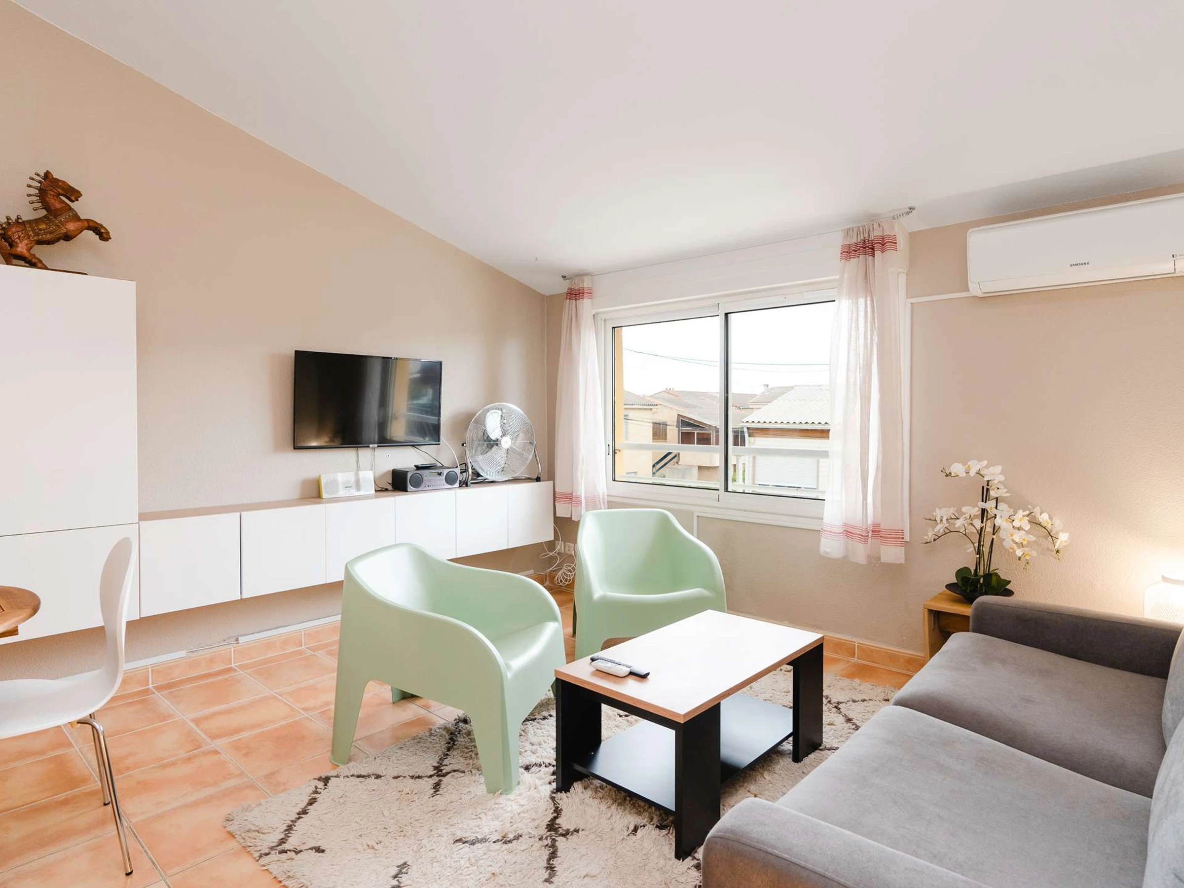 Der Wohnbereich besteht aus einer voll ausgestatteten Küchenzeile (Glaskeramik-Kochfeld mit 4 Kochstellen, Nespresso-Kaffeemaschine und klassische Kaffeemaschine, Toaster, Wasserkocher, großer Kühlschrank mit Gefrierfach, Mikrowelle - Mini-Backofen, Geschirrspüler und Waschmaschine), einem Esstisch mit Zugang zum Wohnzimmer mit Sofa und Flachbildfernseher (französische Kanäle) mit Dockingstation für das I-Phone.