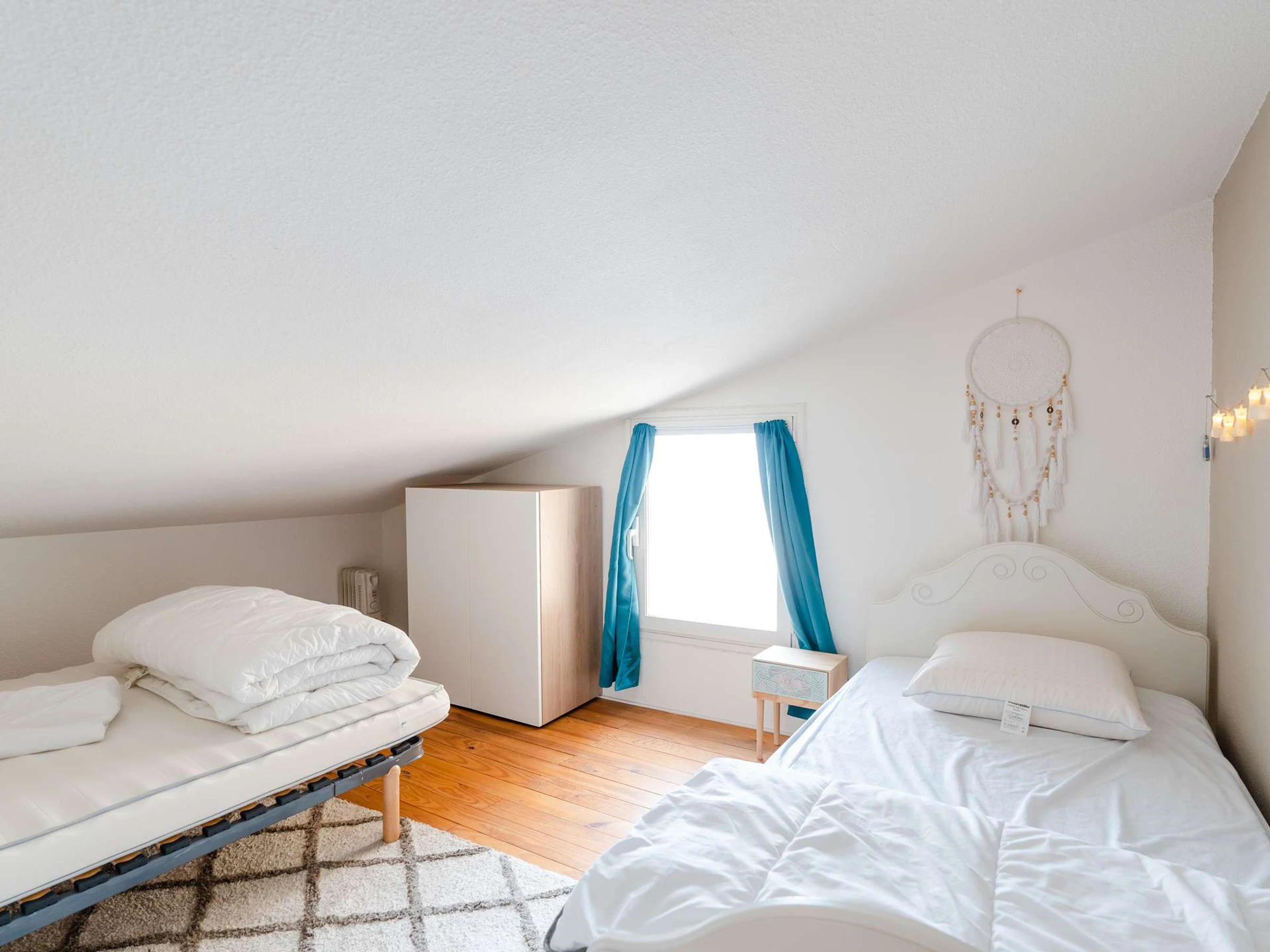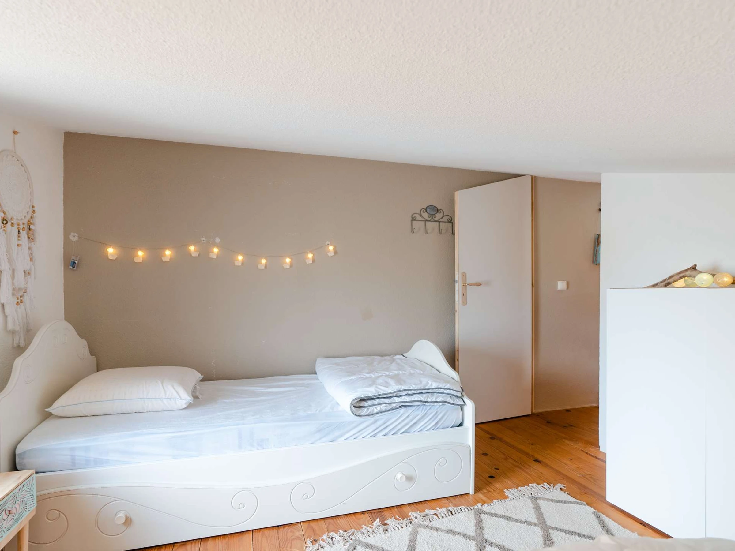 Im Obergeschoss befindet sich ein großes Zwischengeschoss mit einer Leseecke und TV und einem separaten Schlafzimmer mit Schlafbereich (1 Doppelbett (140x190) und 1 Einzelbett).