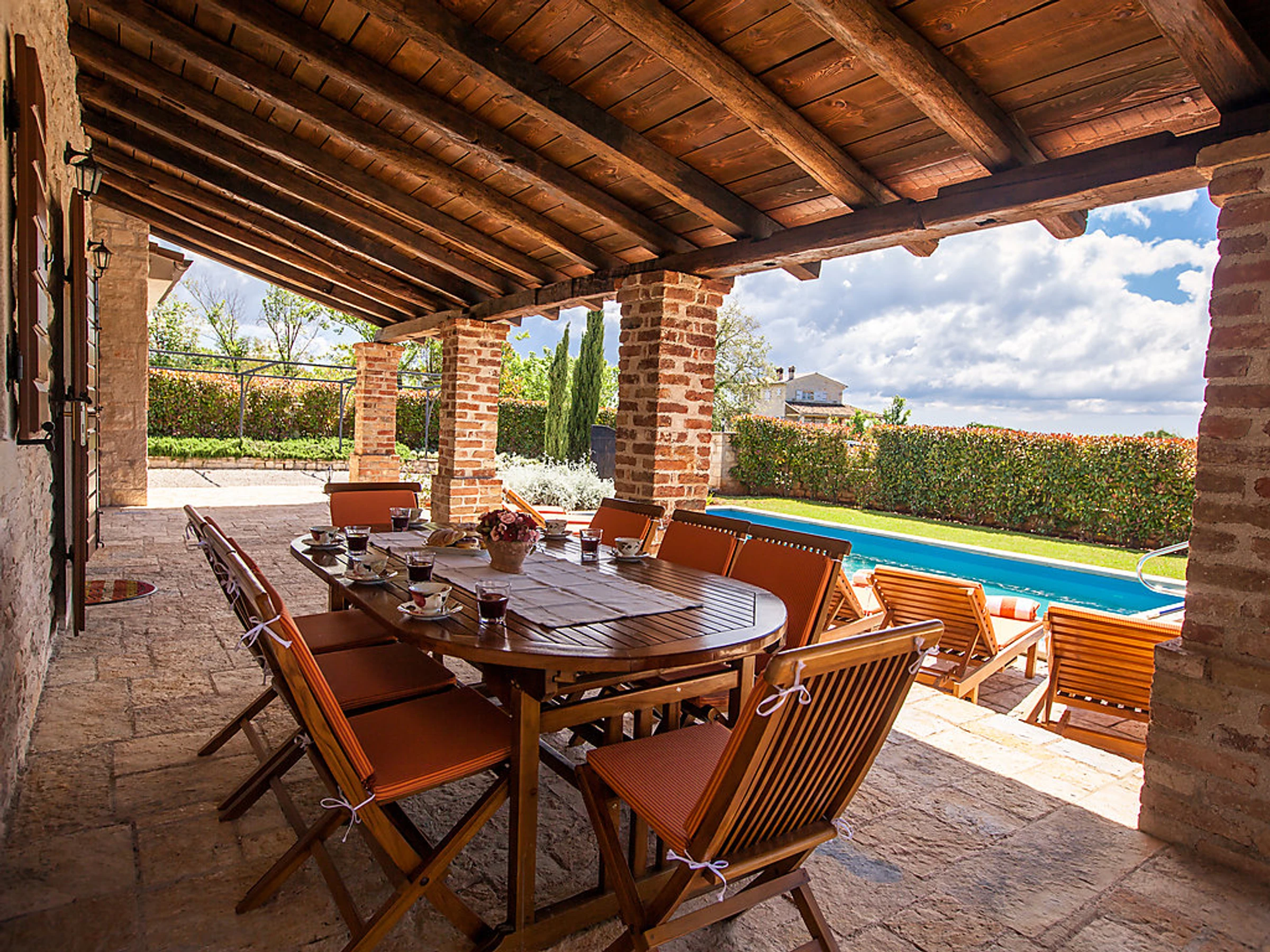 Heraki 14 km von Poreč: Die Villa Fragaria ist Teil des Weilers Heraki mit 12 Villen, umgeben von einer Naturlandschaft mit Reben, Olivenbäumen und Wäldern. Jede Villa befindet sich auf einem umzäunten Grundstück mit privatem Zugang und privatem Schwimmbad. Komfortable Villa "Fragaria", auf 2 Stockwerken, Baujahr 2006. Im Weiler Heraki, 2 km vom Zentrum von Sv.Lovreč, ruhige, sonnige Lage, 14 km vom Meer, im Grünen. Zur Alleinbenutzung: Grundstück 888 m2 (eingezäunt), gepflegter Garten, Schwimmbad eckig (8 x 4 m, 150 cm tief,[hidden].) mit Innentreppe. Terrasse, Gartenmöbel. Im Hause: Internetzugang, Wireless LAN, Alarmanlage. Wohnungsreinigung 1 mal wöchentlich (inkl.). Parkplatz beim Haus auf dem Grundstück. Einkaufsgeschäft 2 km, Restaurant 7 km, Café 2 km, Kieselstrand 14 km, Strandbad 14 km. Sporthafen 14 km, Sportzentrum 14 km.