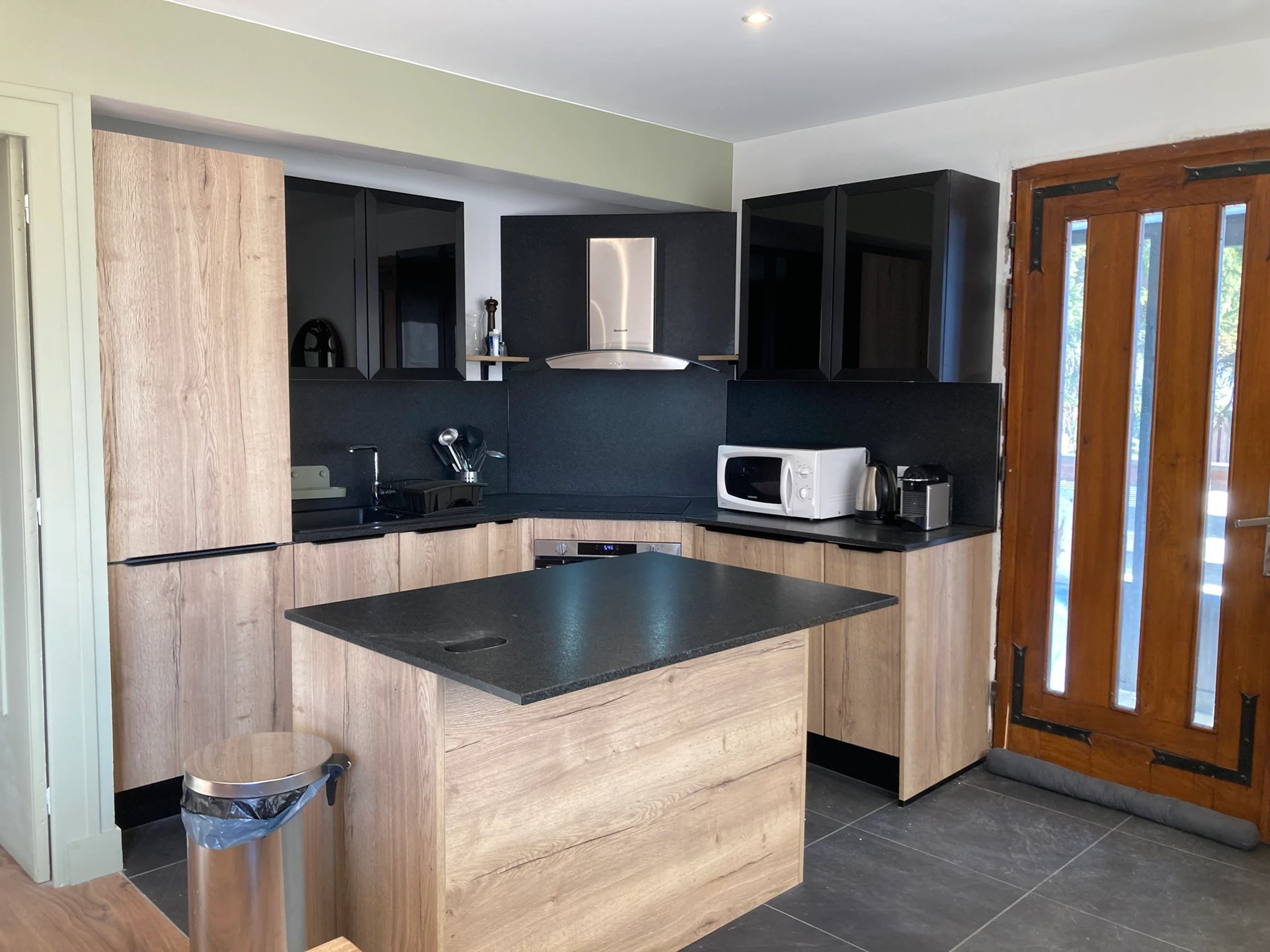 Küchenbereich: 4 Kochplatten, Backofen, Mikrowelle, Geschirrspüler und Kaffeemaschine