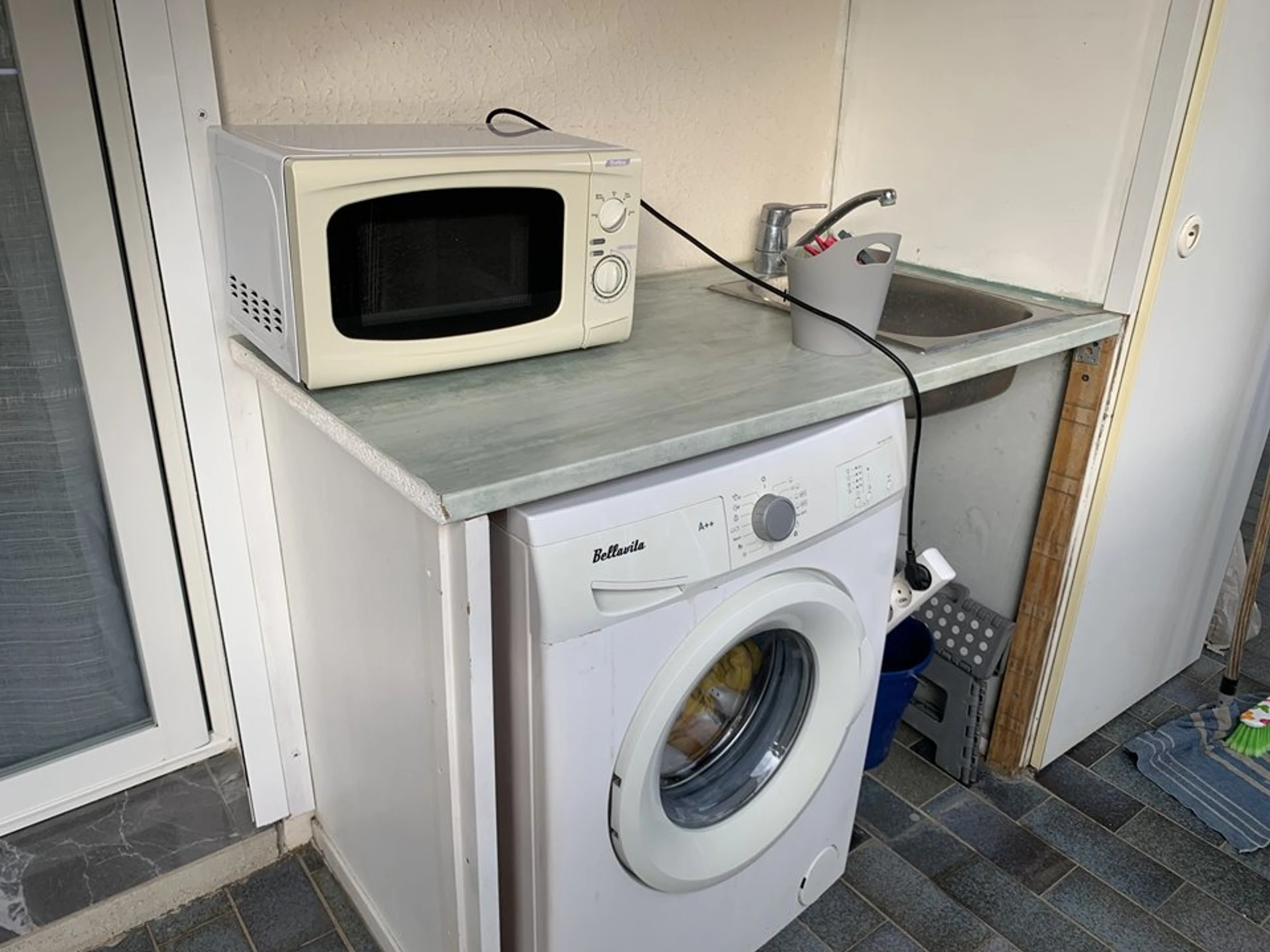 Eine voll ausgestattete Küche mit Kühl-/Gefrierschrank, Backofen, Induktionskochfeld und Geschirrspüler. Auf der Terrasse befinden sich eine Waschmaschine und eine Mikrowelle.