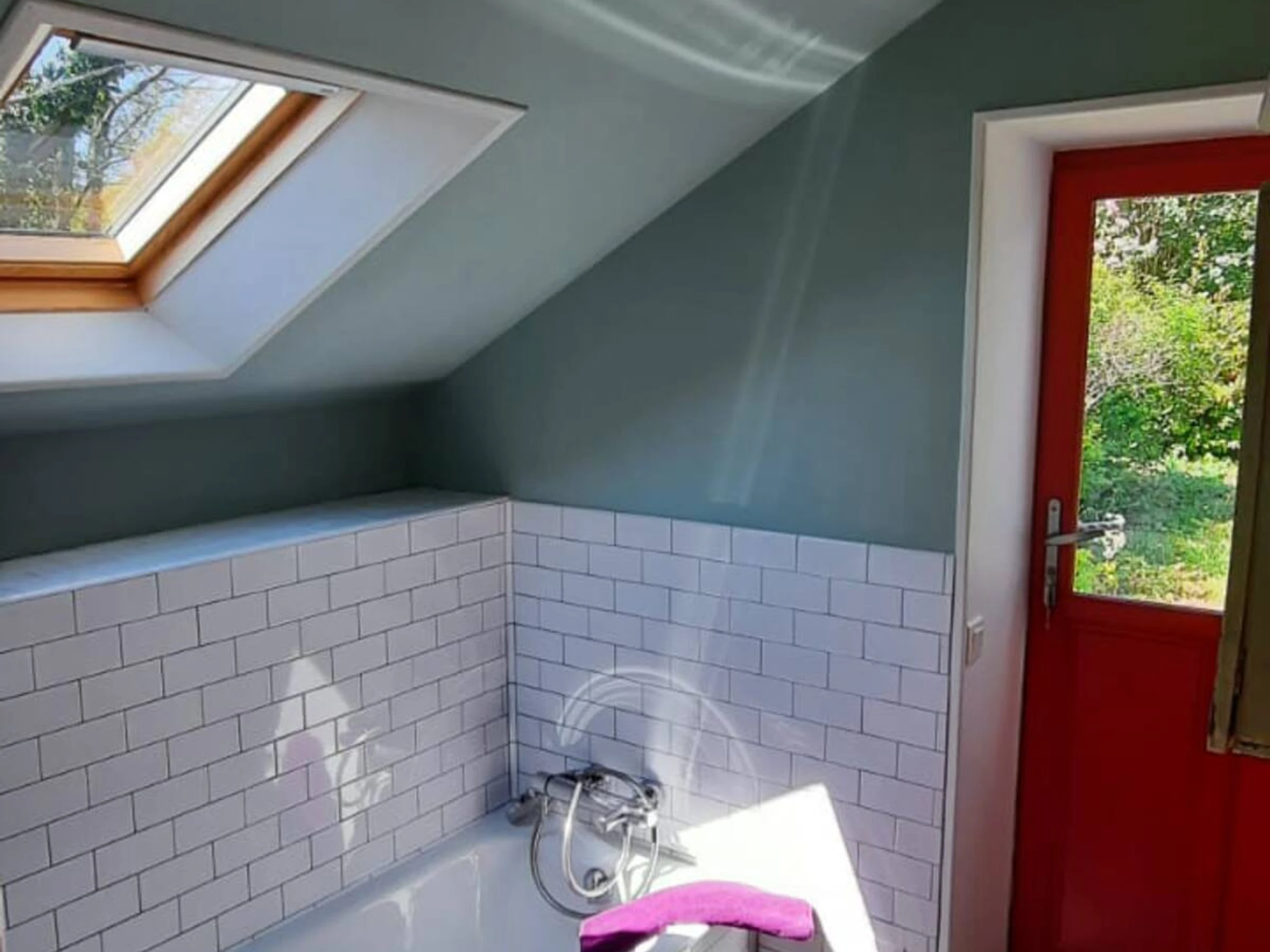 Großer umzäunter Garten von 700 m², schönes helles Wohnzimmer, 2 angrenzende Schlafzimmer mit Zugang zu einer Außentreppe.
