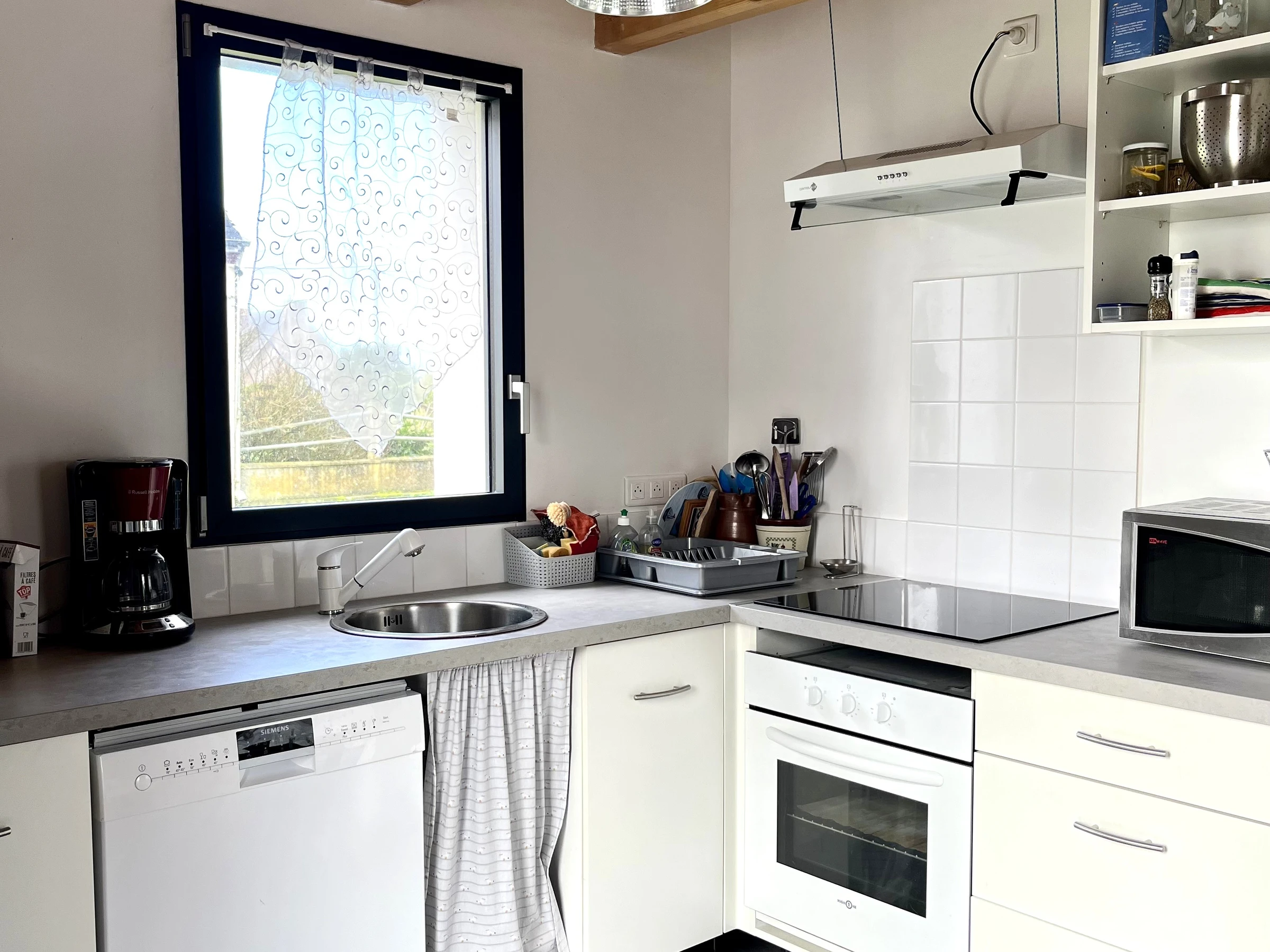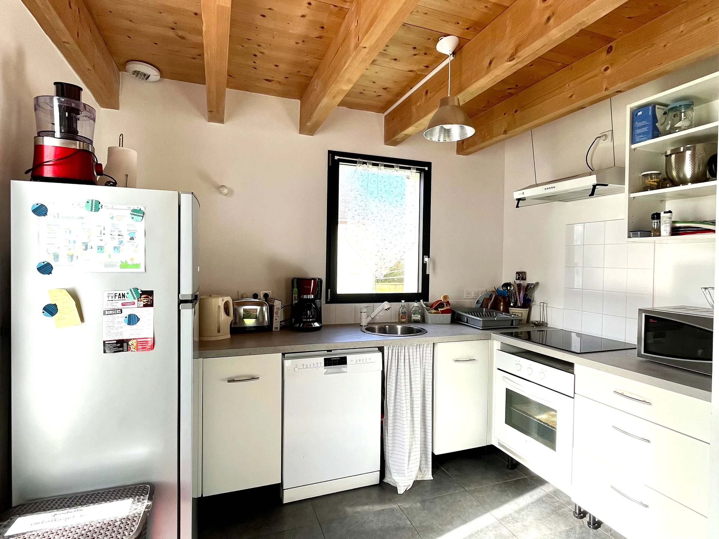 Die Küche ist bestens ausgestattet: Backofen, Dunstabzugshaube, Spüle, Gefrierschrank, Geschirrspüler, Kaffeemaschine, Wasserkocher und Toaster sind vorhanden. Im Wohnzimmer finden Sie einen Fernseher, und zur weiteren Ausstattung gehören eine Waschmaschine und ein Staubsauger.