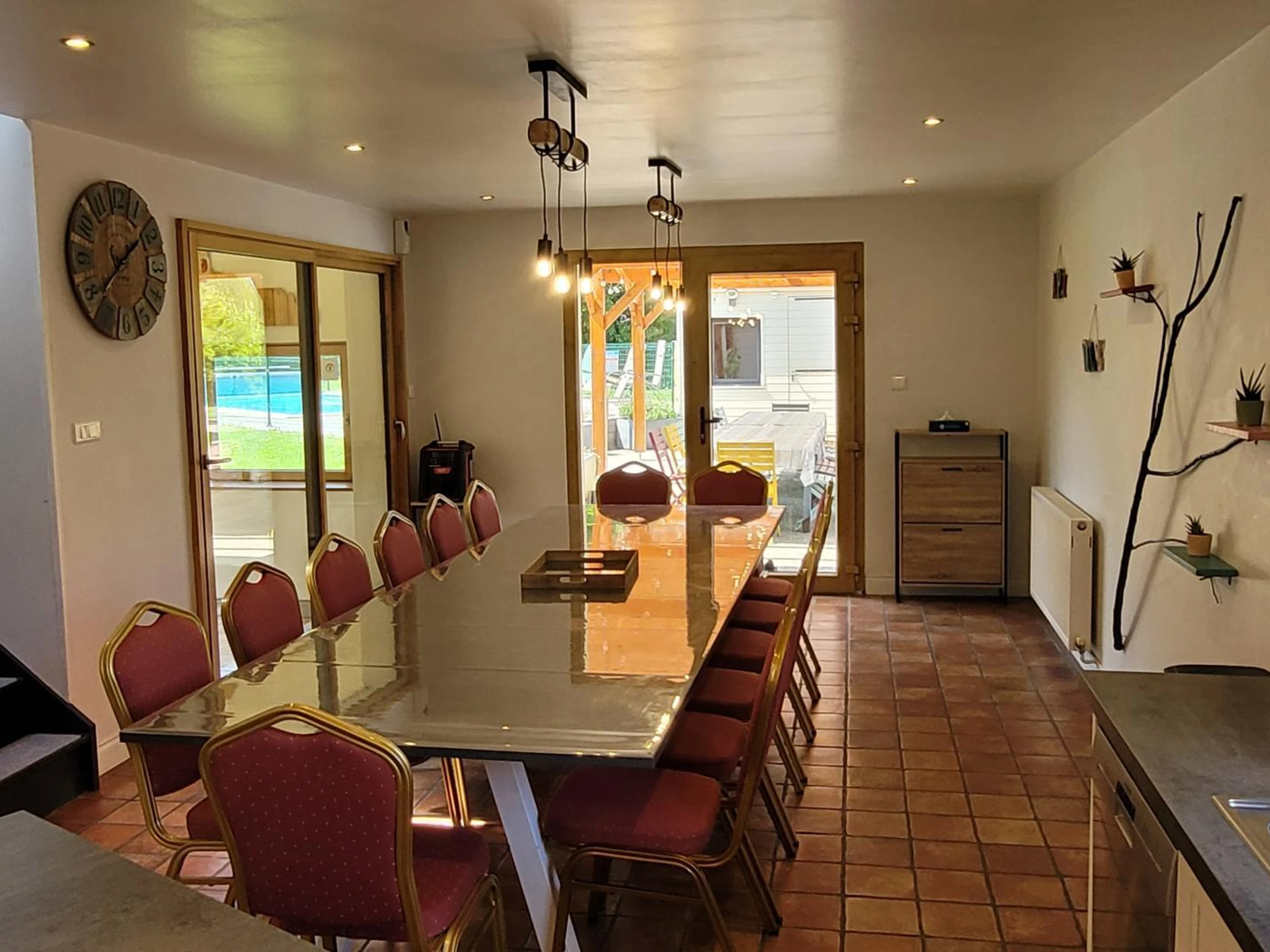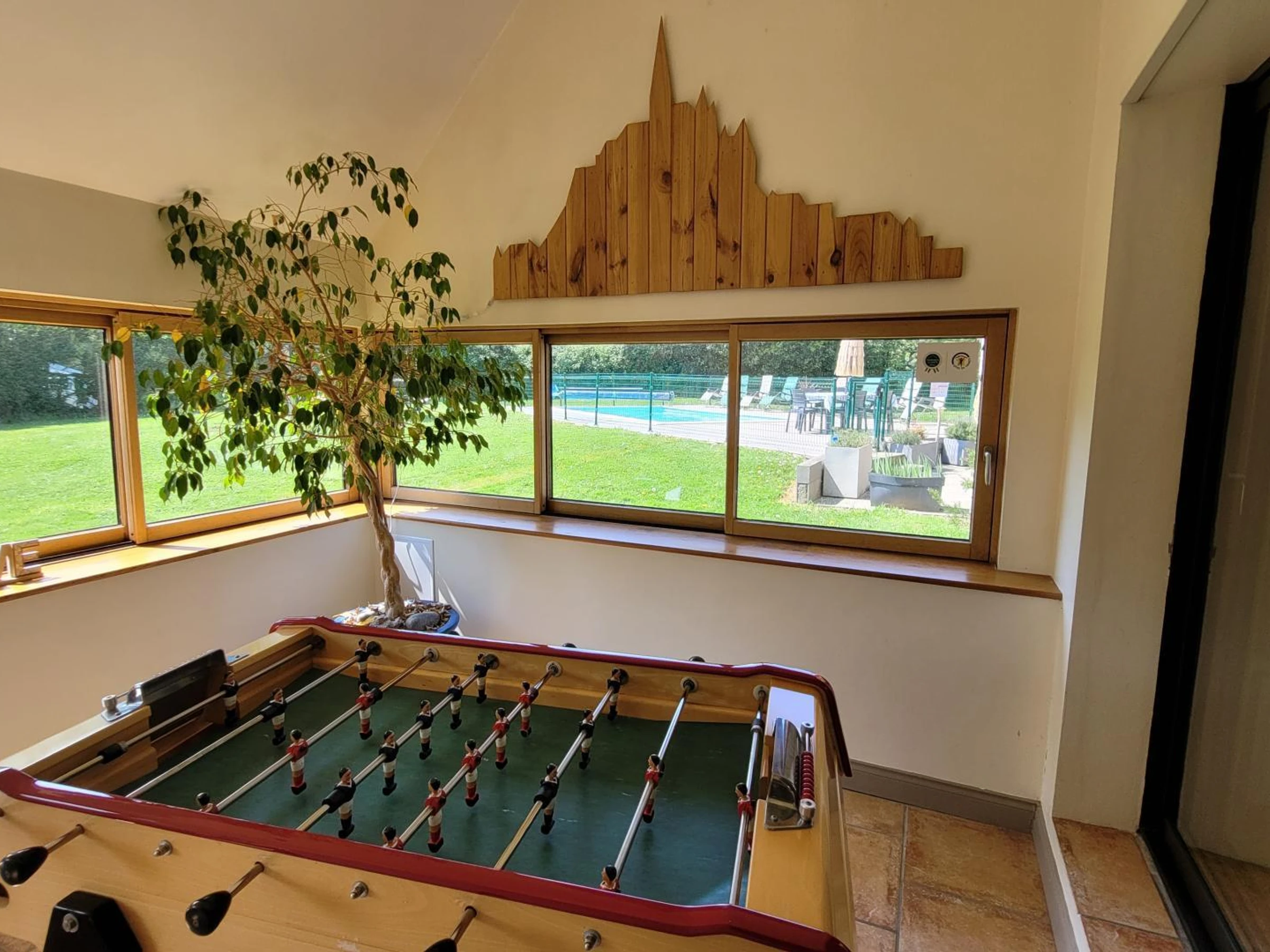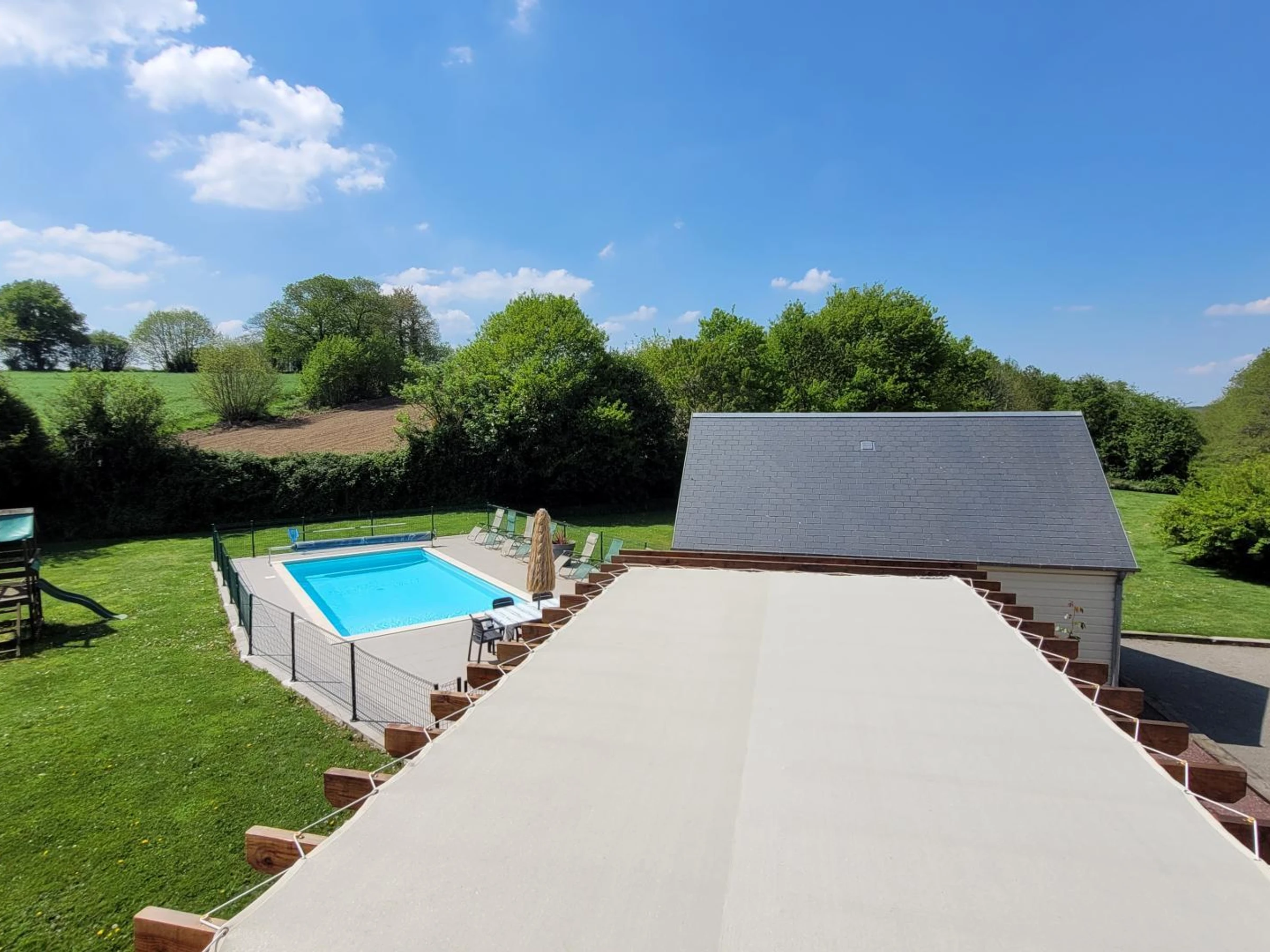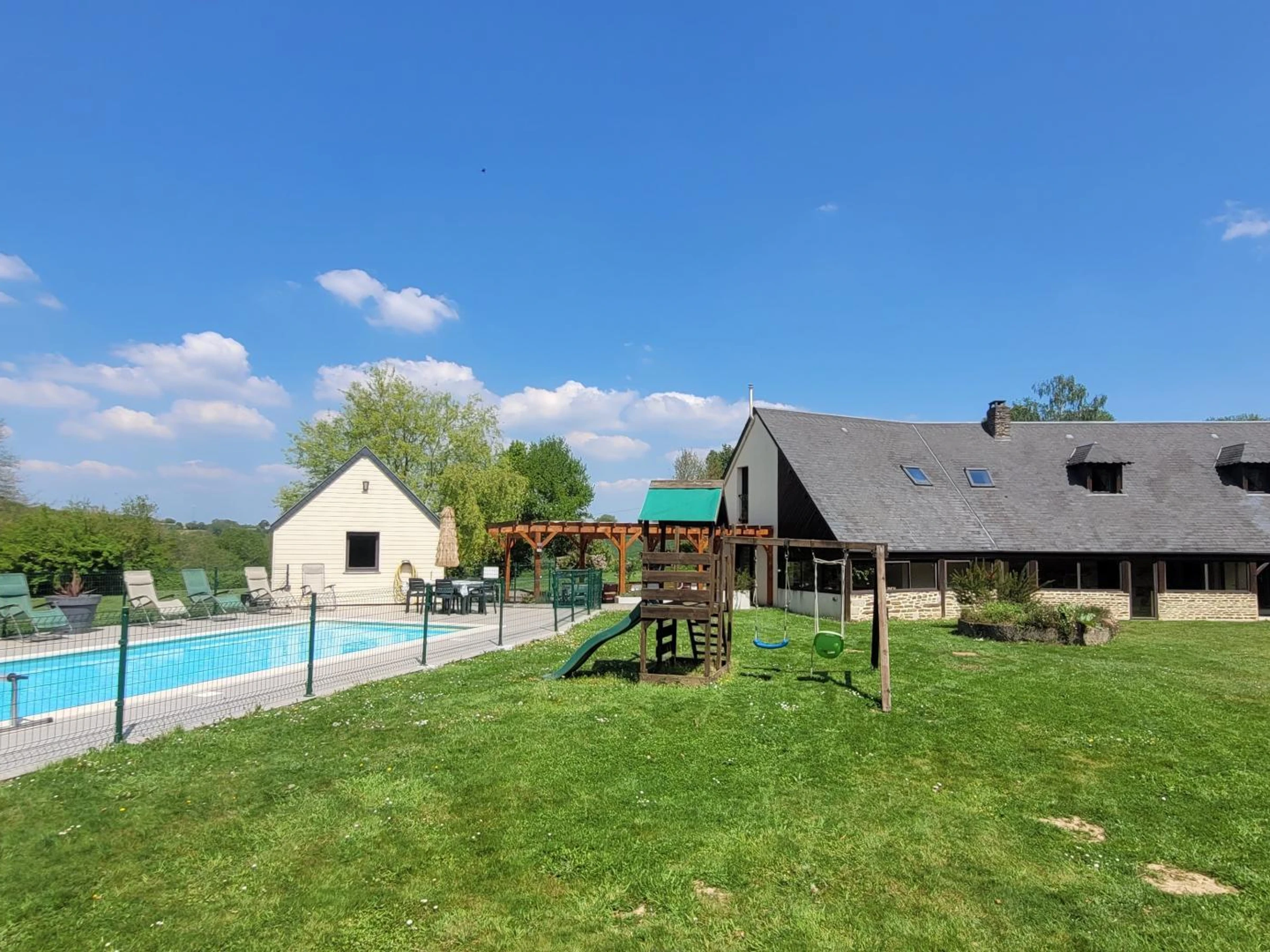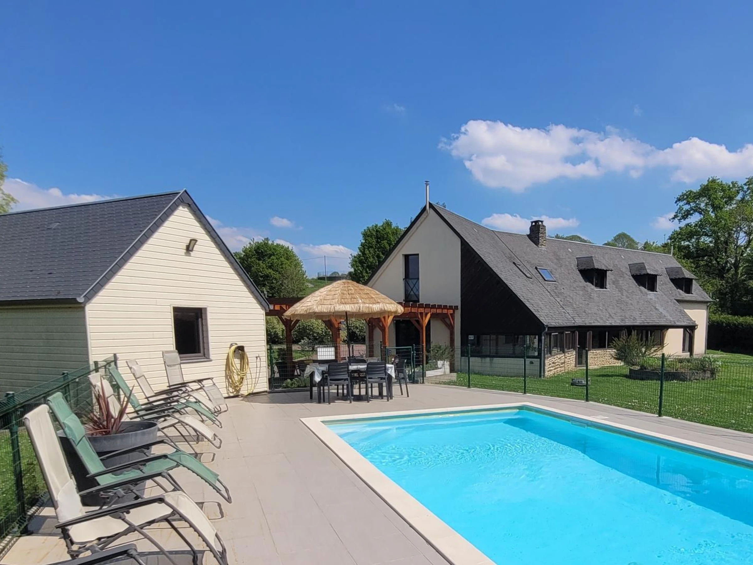 Freistehendes Haus. Erdgeschoss: Offene Küche mit Essbereich und Esstisch (Herd, Mikrowelle, Espressomaschine, Geschirrspüler, Gefrierfach). Tischfußballzimmer. Billardzimmer. Wohnzimmer (Smart-TV, ADSL-Internet, Mini-Stereoanlage und Smart Speaker, Dartscheibe). Wintergarten. Waschküche (Waschmaschine und Trockner). WC. Schlafzimmer 1 (zwei Betten à 90 x 190 cm) mit eigenem Duschbad und WC. Obergeschoss: Schlafzimmer 2 (ein Bett à 140 x 190 cm) mit eigenem Duschbad und WC. Schlafzimmer 3 (ein Bett à 140 x 190 cm). Schlafzimmer 4 (ein Bett à 160 x 200 cm). Schlafzimmer 5 (ein Bett à 160 cm und ein Bett à 90 x 190 cm) mit eigenem Duschbad und WC. Schlafzimmer 6 (vier Betten à 90 x 190 cm). Badezimmer mit Dusche und WC. Privater, umzäunter Garten. Innenhof mit Tor. Terrasse mit Pergola. Gartenmöbel, Sonnenliegen. Bouleplatz. Spielplatz. Grill. Beheizter Pool (8,5 x 4 m), geöffnet von Mai bis September. Überdachter Pavillon. Parkplatz. Babyausstattung (2 Stück). Gaszentralheizung (gegen Gebühr). Bettwäsche und Handtücher können gemietet werden. Reinigungsservice inklusive. Fernab vom Trubel der Stadt besticht dieses große Ferienhaus durch seine großzügige Raumaufteilung. Mit mehreren Aufenthaltsräumen und dem schönen privaten Pool ist es ideal für einen Familienurlaub! (Billard, Tischfußball, Boule, Spiele etc.). Am großen, modernen Esstisch lässt es sich gemütlich versammeln, und die Schlaf- und Badezimmer sind so angeordnet, dass sich jeder in diesem geräumigen Haus wohlfühlt. Und all das weniger als 30 km vom Mont Saint-Michel entfernt! Der Fluss Sélune, bekannt für seine Angelmöglichkeiten, hält in seinem Unterlauf wunderbare Überraschungen für Wanderer und Naturliebhaber bereit! Wunderschöne bewaldete Täler erwarten die Urlauber in dieser Gegend!