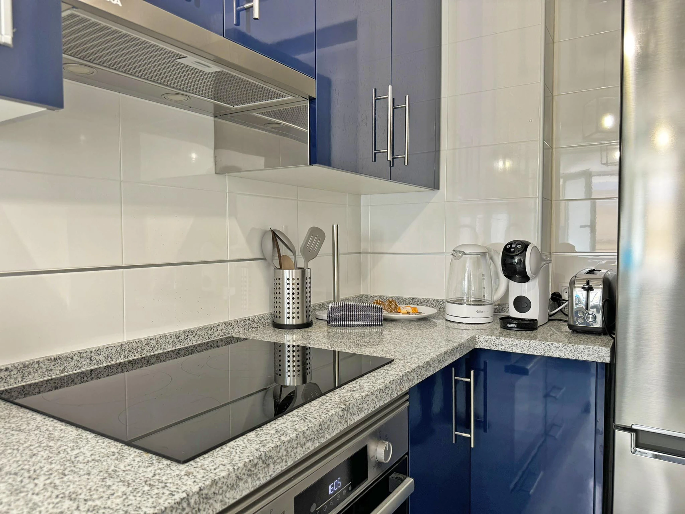 Dieses separate küche, mit ceranfeld, ist ausgestattet in kühlschrank, mikrowelle, backofen, gefrierschrank, geschirr/besteck, kochutensilien, kaffeemaschine, toaster, wasserkocher und herdplatte.