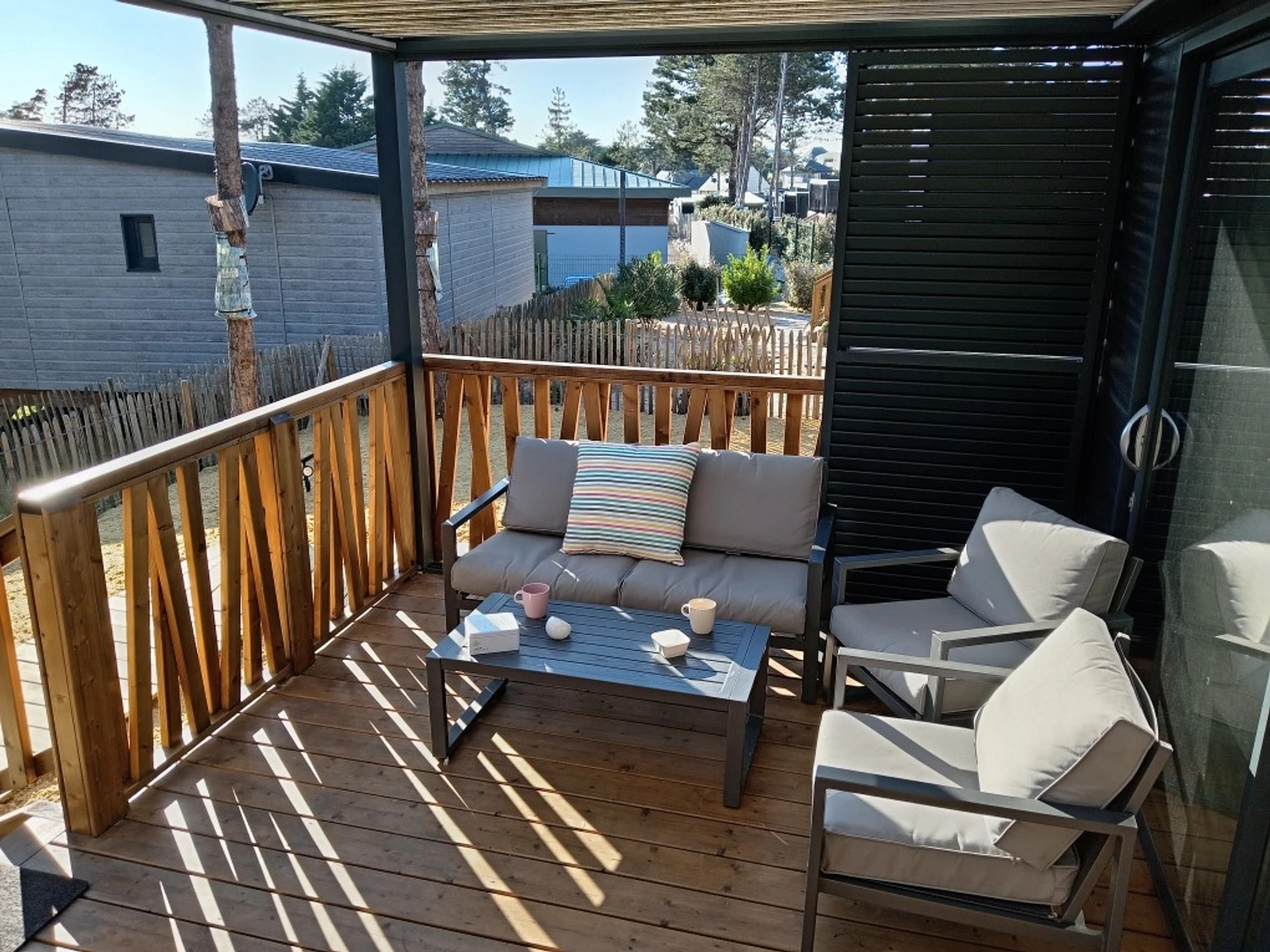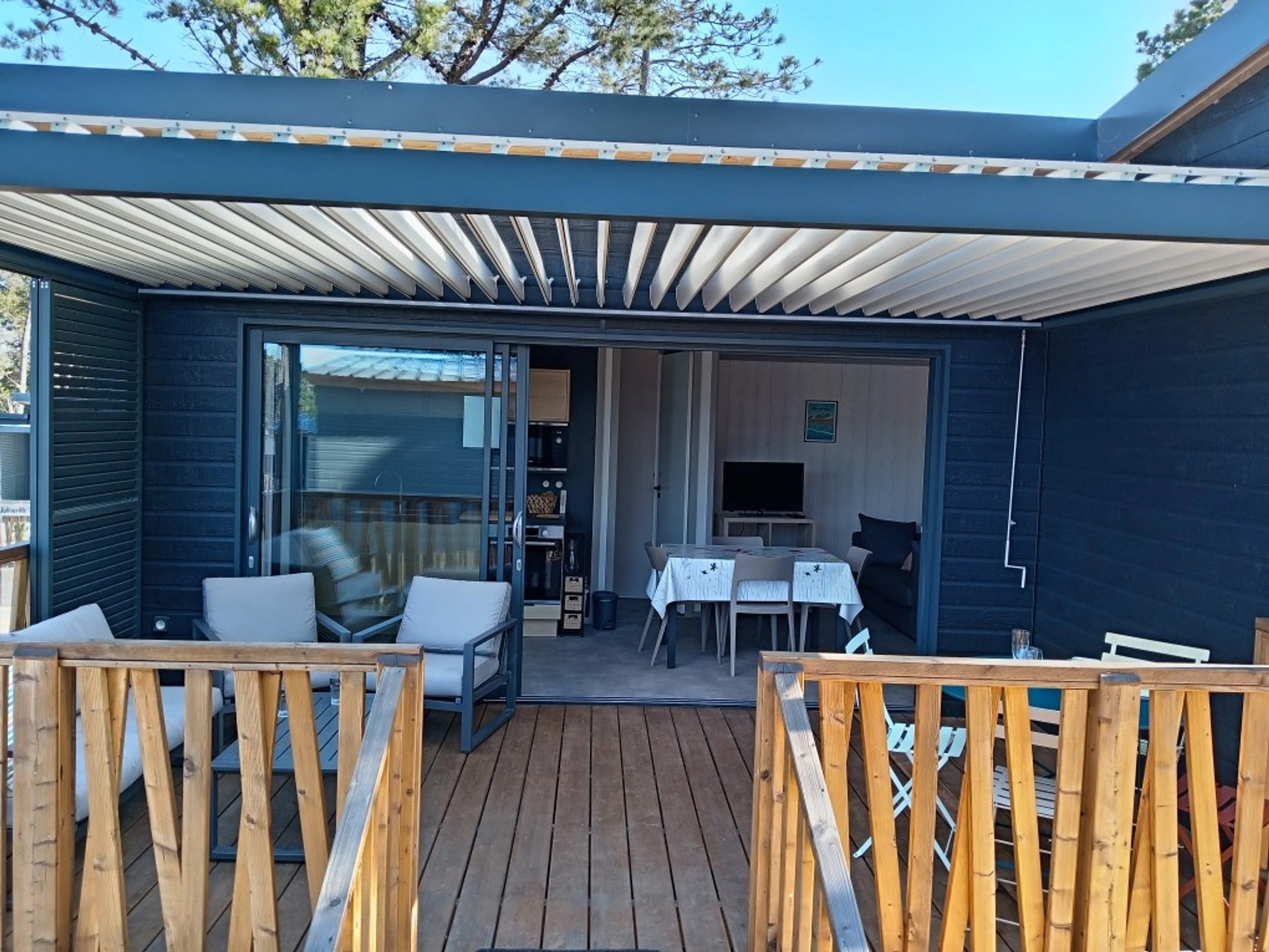 Entspannen Sie sich auf der Terrasse mit bioklimatischer Pergola und Gartenmöbeln sowie im komplett privaten Garten.