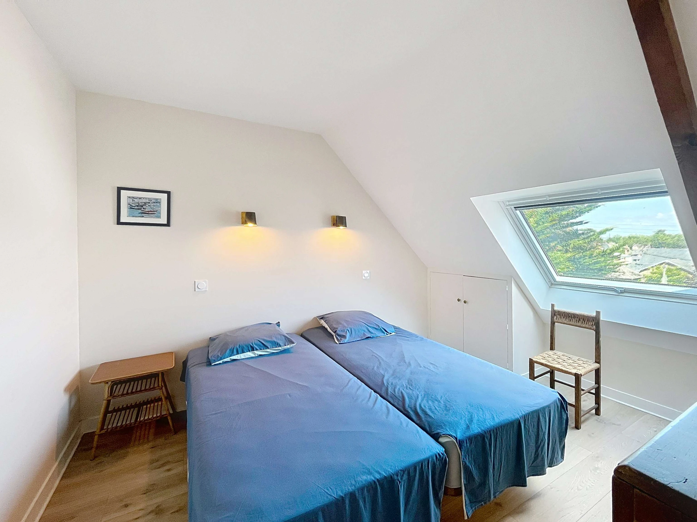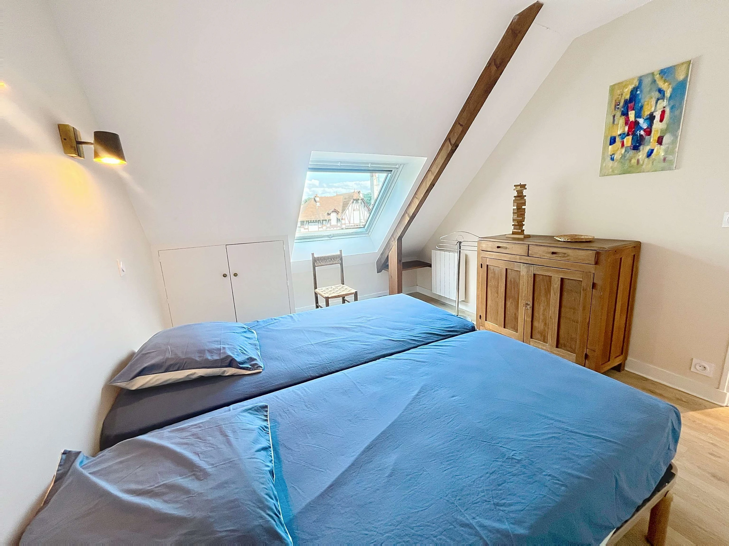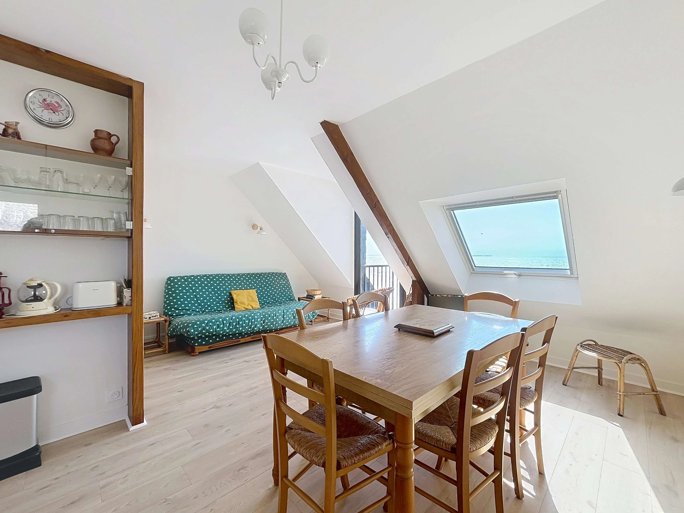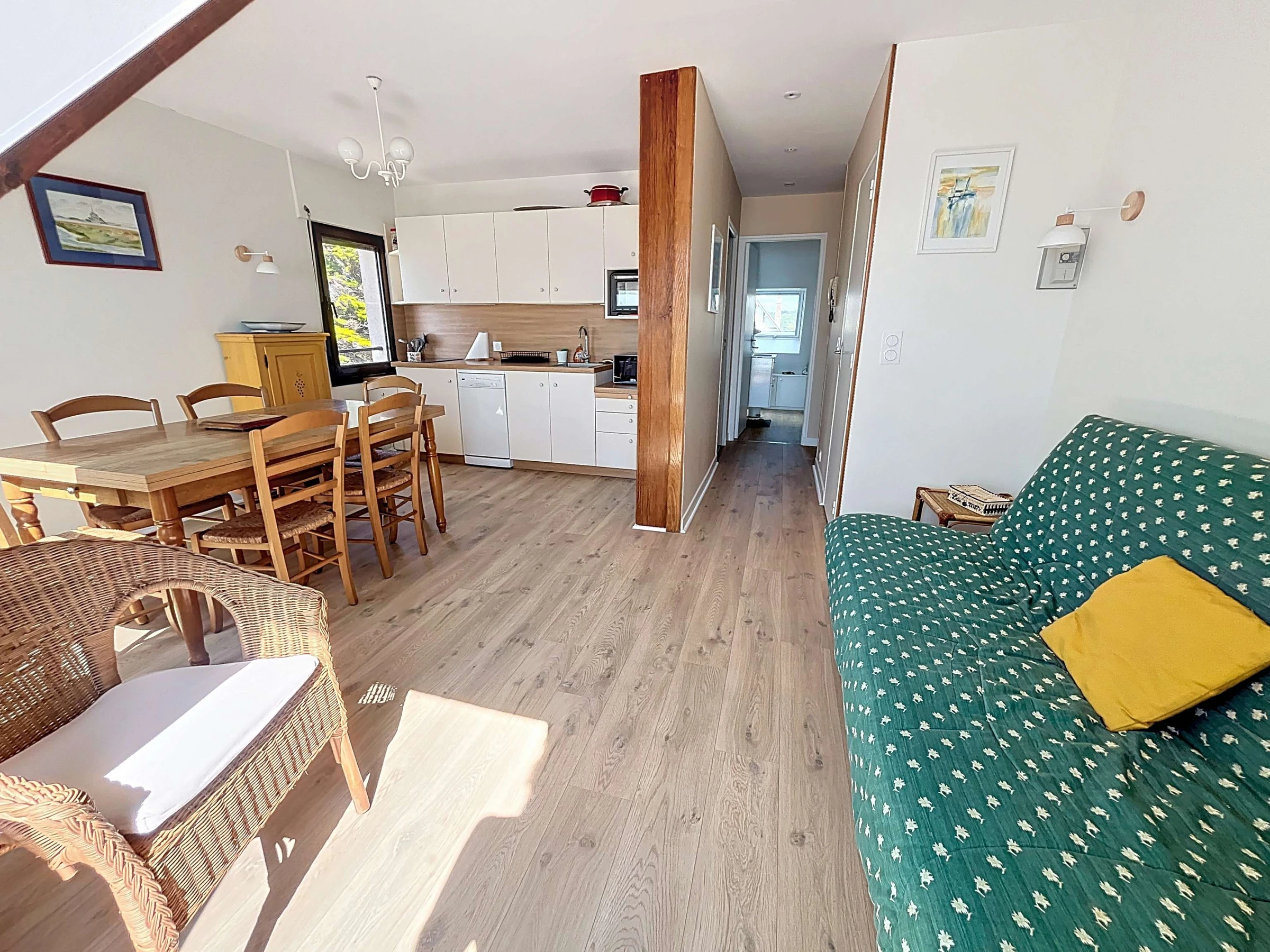 Übernachten Sie in dieser Wohnung im 2. Stock (ohne Aufzug) einer Residenz direkt am Meer im Herzen von Jullouville mit direktem Strandzugang. Diese attraktive und gemütliche Dachgeschosswohnung verfügt über ein Wohn-/Esszimmer mit Meerblick (Doppelschlafcouch, Fernseher) und Zugang zu einem kleinen Balkon, eine voll ausgestattete Einbauküche, ein Schlafzimmer mit zwei 90 cm breiten Einzelbetten, ein Badezimmer und ein separates WC.