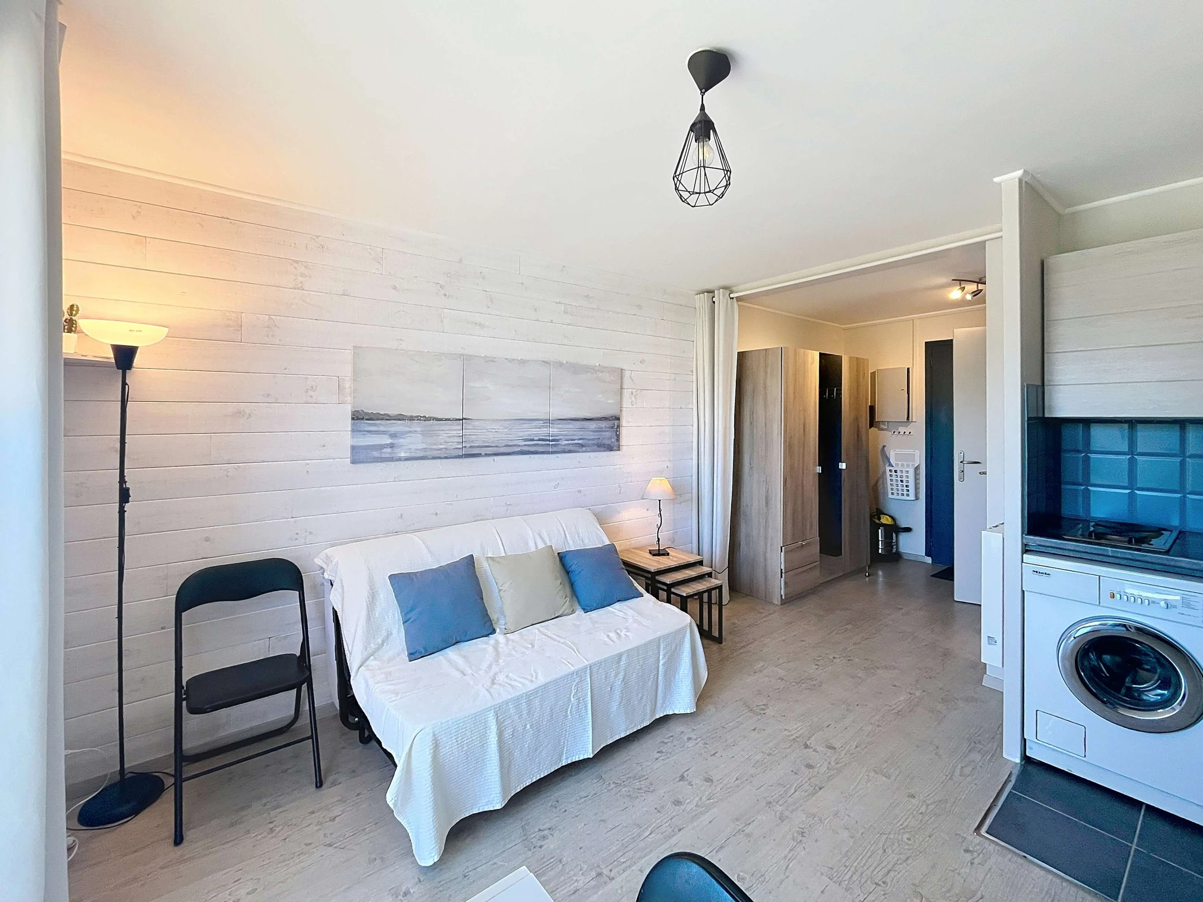 Charmantes 21 m² großes Studio-Apartment, ideal für einen romantischen Kurzurlaub. Das gepflegte Apartment befindet sich im ersten Stock und bietet dank seiner Ostausrichtung wunderschönes Morgenlicht. Es verfügt über einen Schlafbereich mit einem bequemen Schlafsofa für zwei Personen. Die funktionale und komfortable Ausstattung umfasst eine Küchenzeile mit Kühl-/Gefrierschrank, Elektroherd, Backofen, Mikrowelle, Kaffeemaschine, Wasserkocher und komplettem Geschirr. Außerdem finden Sie hier eine Waschmaschine, einen Wäscheständer, einen Staubsauger, ein Bügeleisen und ein Bügelbrett. Badezimmer mit Waschbecken. Separates WC.