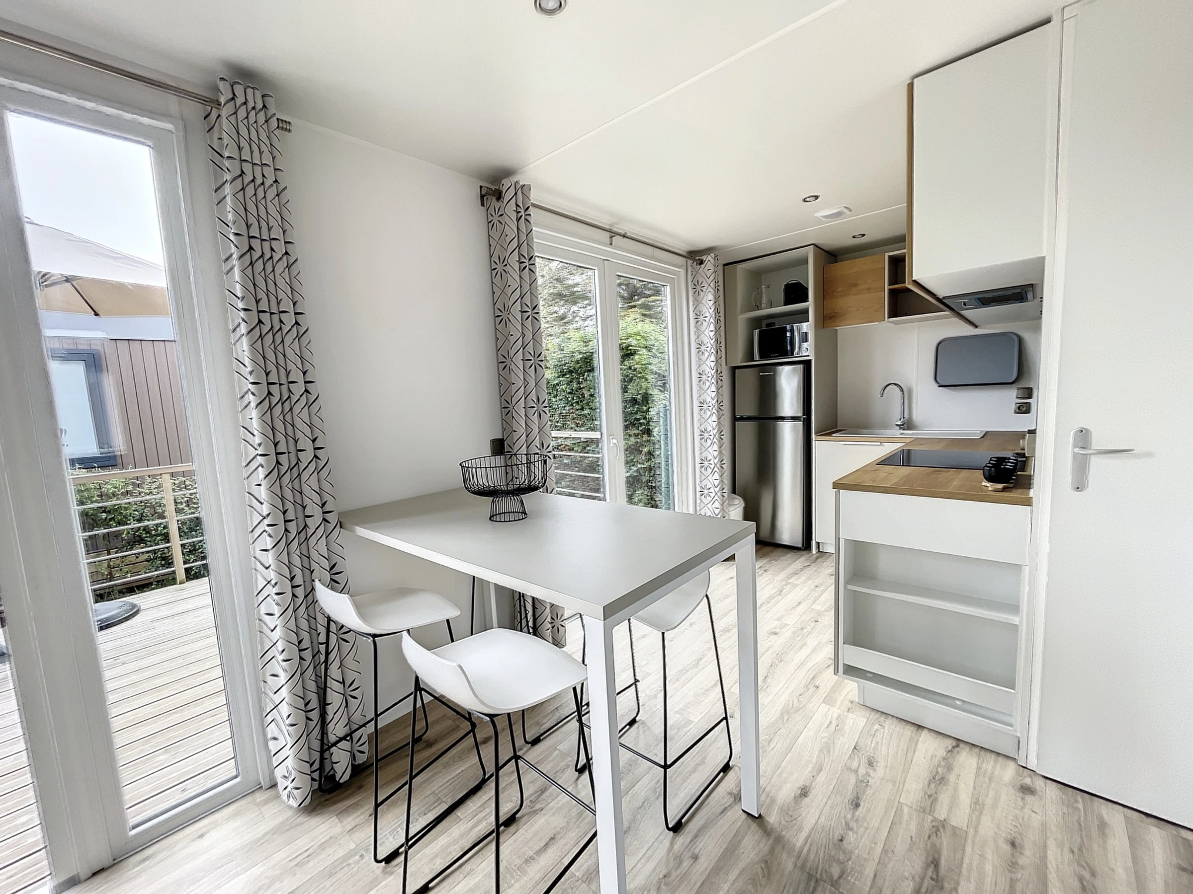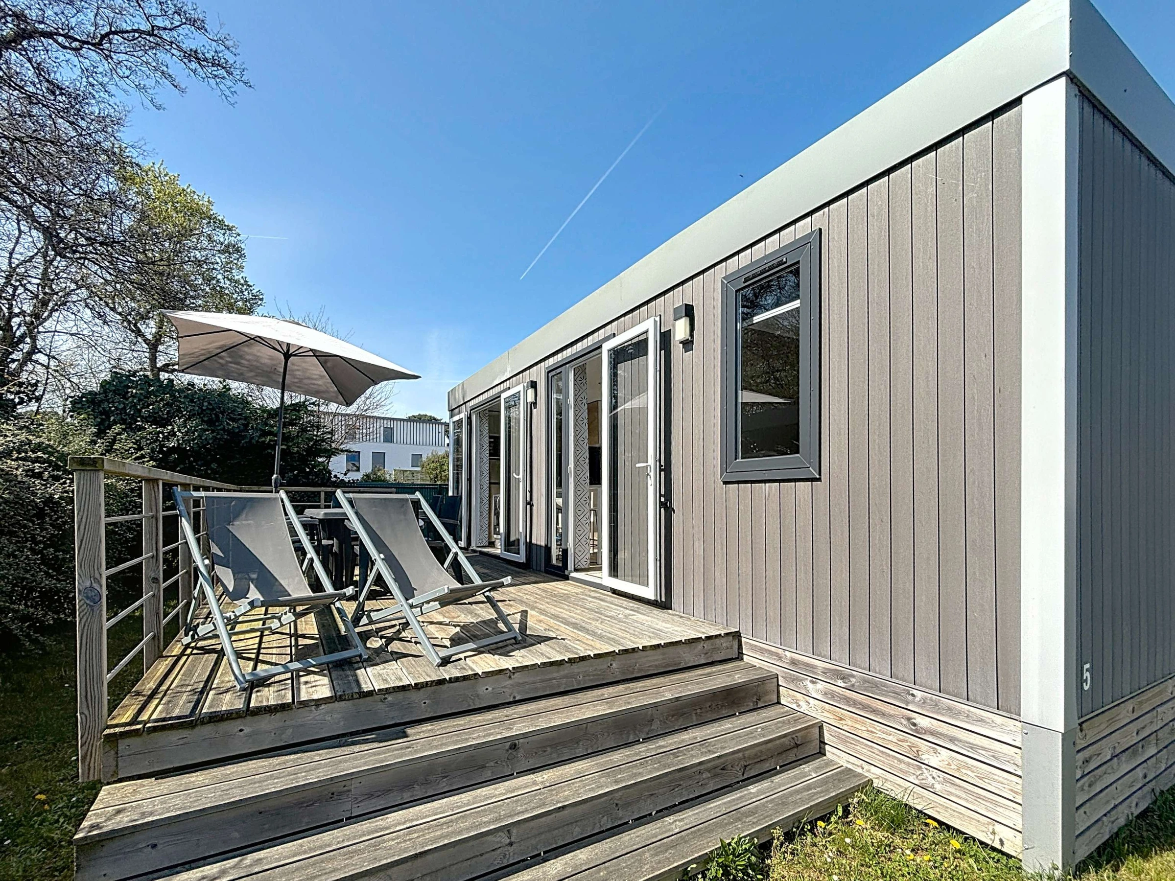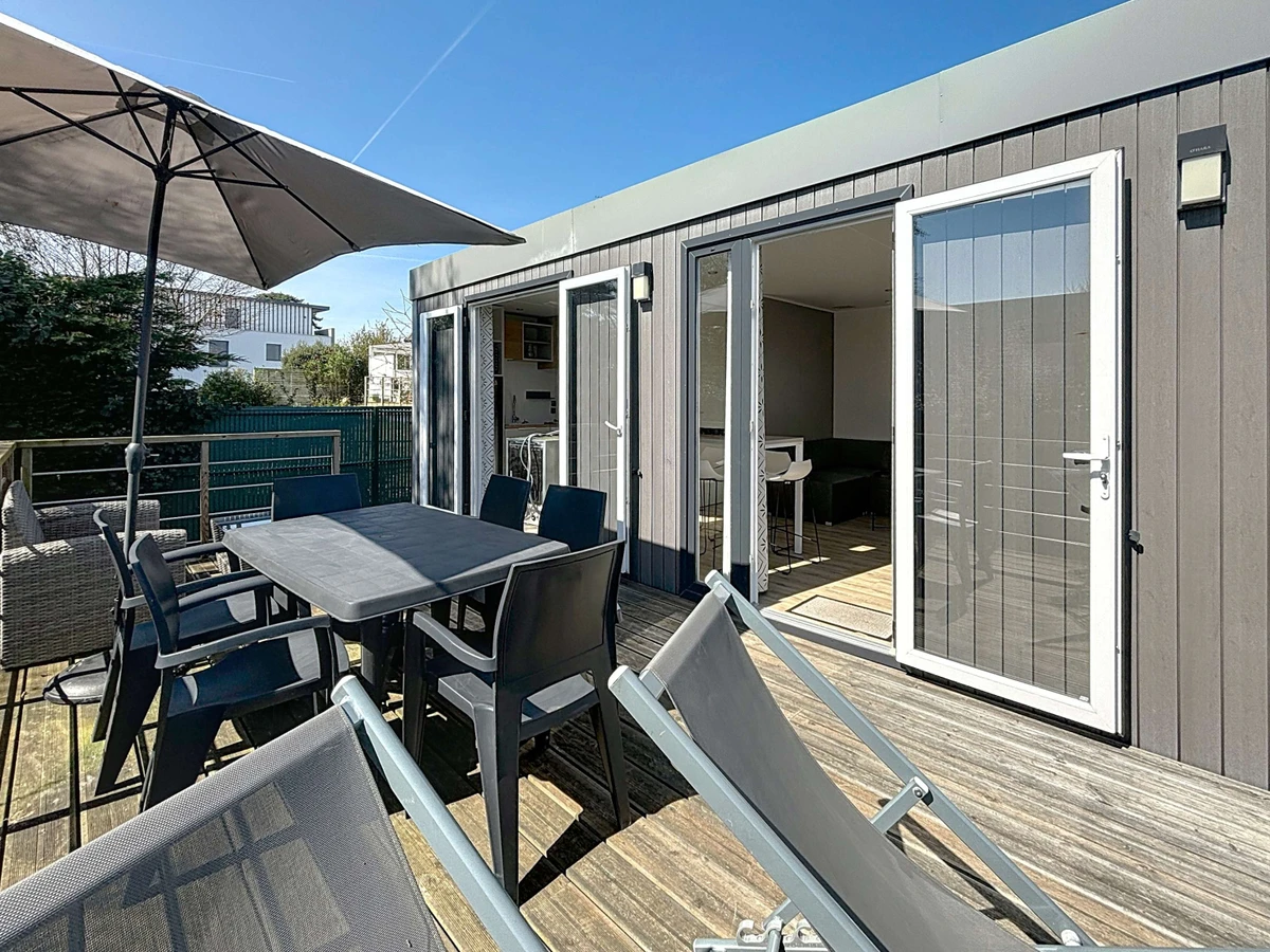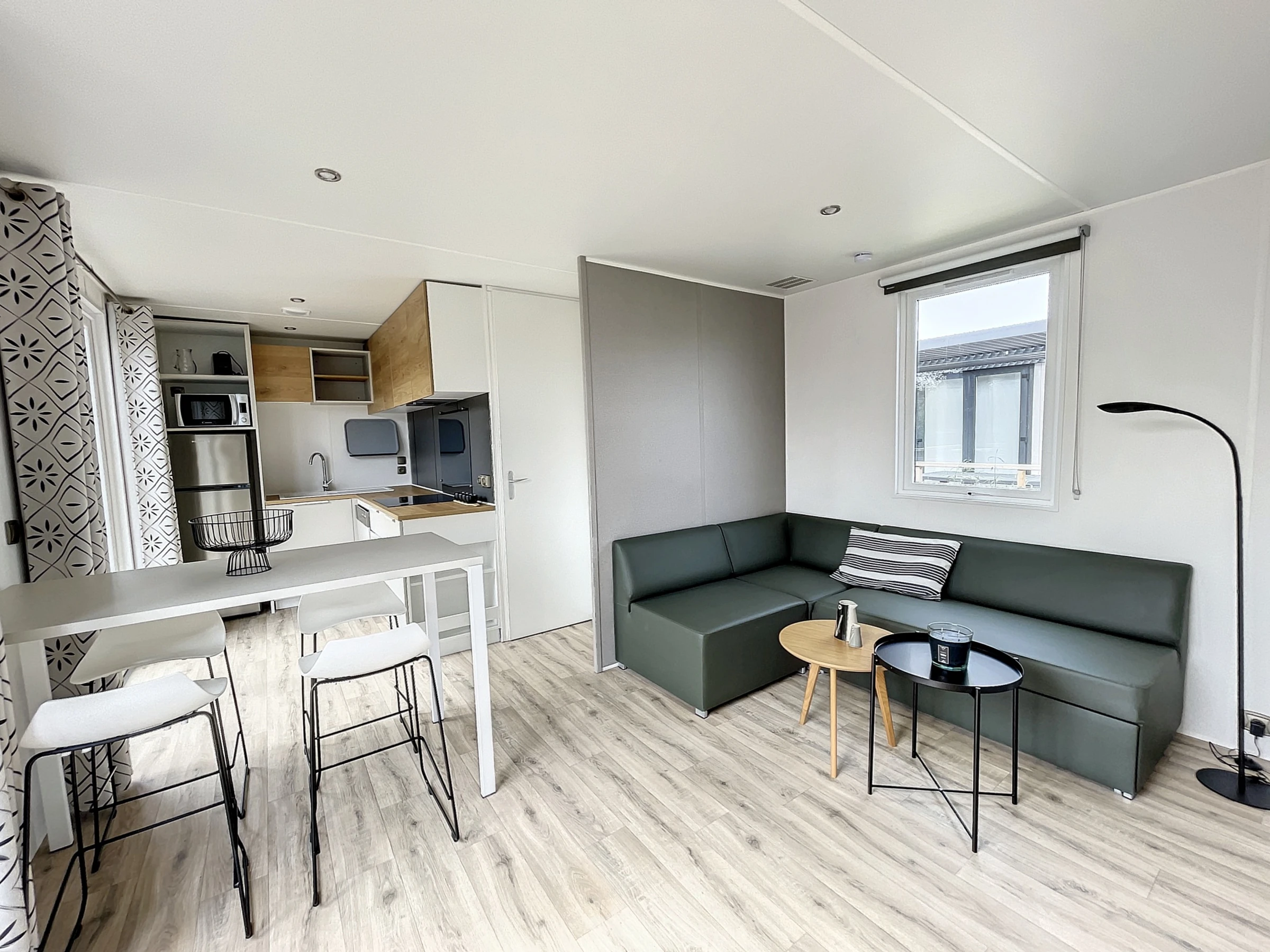 Dieses komfortable Mobilheim mit 2 Schlafzimmern für 4 Personen (31 m²) wird Sie begeistern. Es verfügt über einen Wohnbereich mit voll ausgestatteter Küchenzeile, einen Aufenthaltsraum mit TV und Sofa, ein Schlafzimmer mit Doppelbett (160 x 200 cm), ein zweites Schlafzimmer mit Etagenbett, ein Duschbad und ein separates WC. Die Holzterrasse mit Außenküche lädt zum Verweilen ein. Ein Parkplatz für ein Fahrzeug ist vorhanden. Die Endreinigung und kostenloses WLAN sind inklusive!