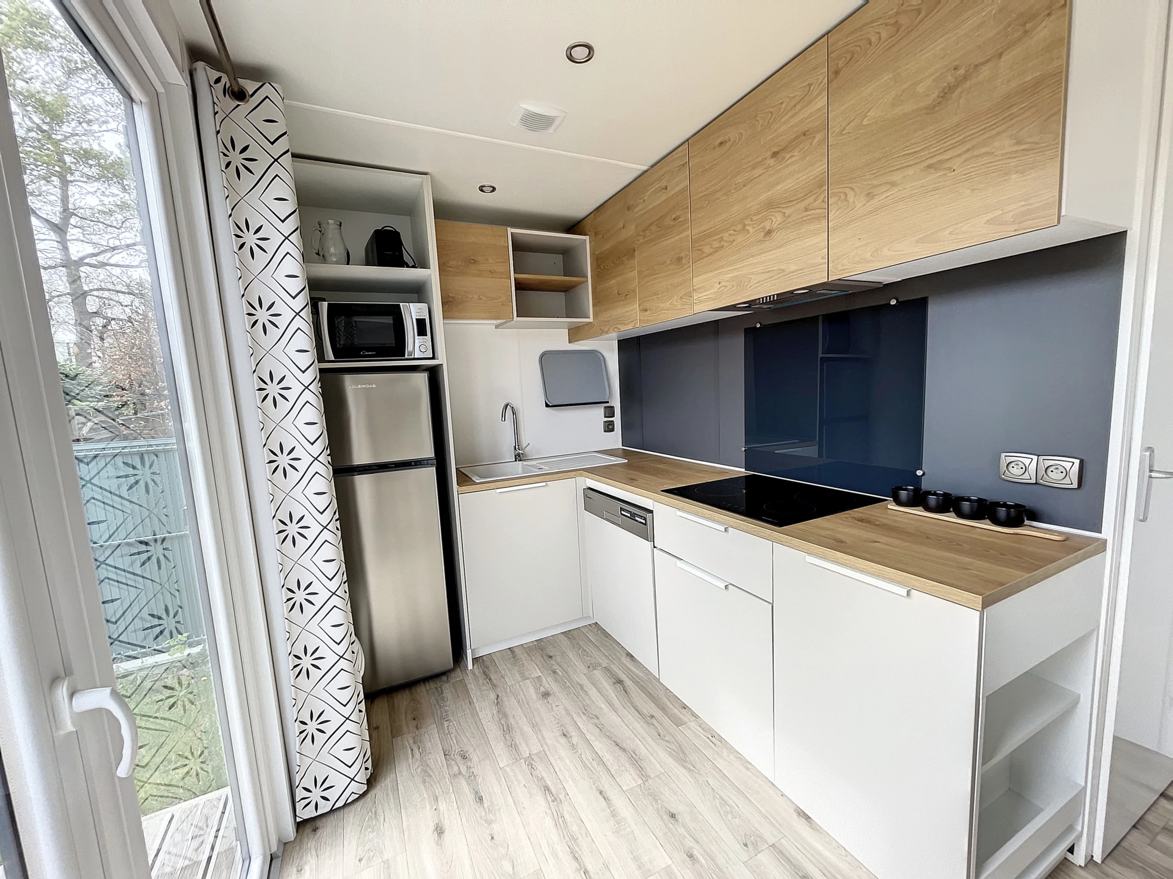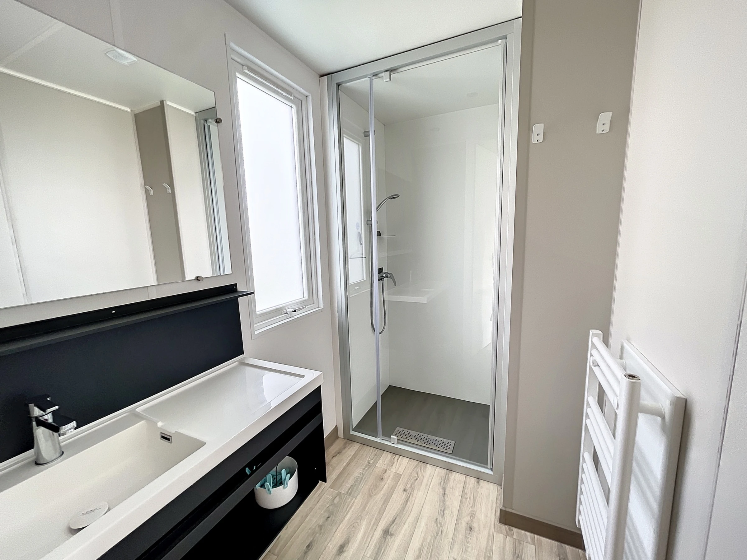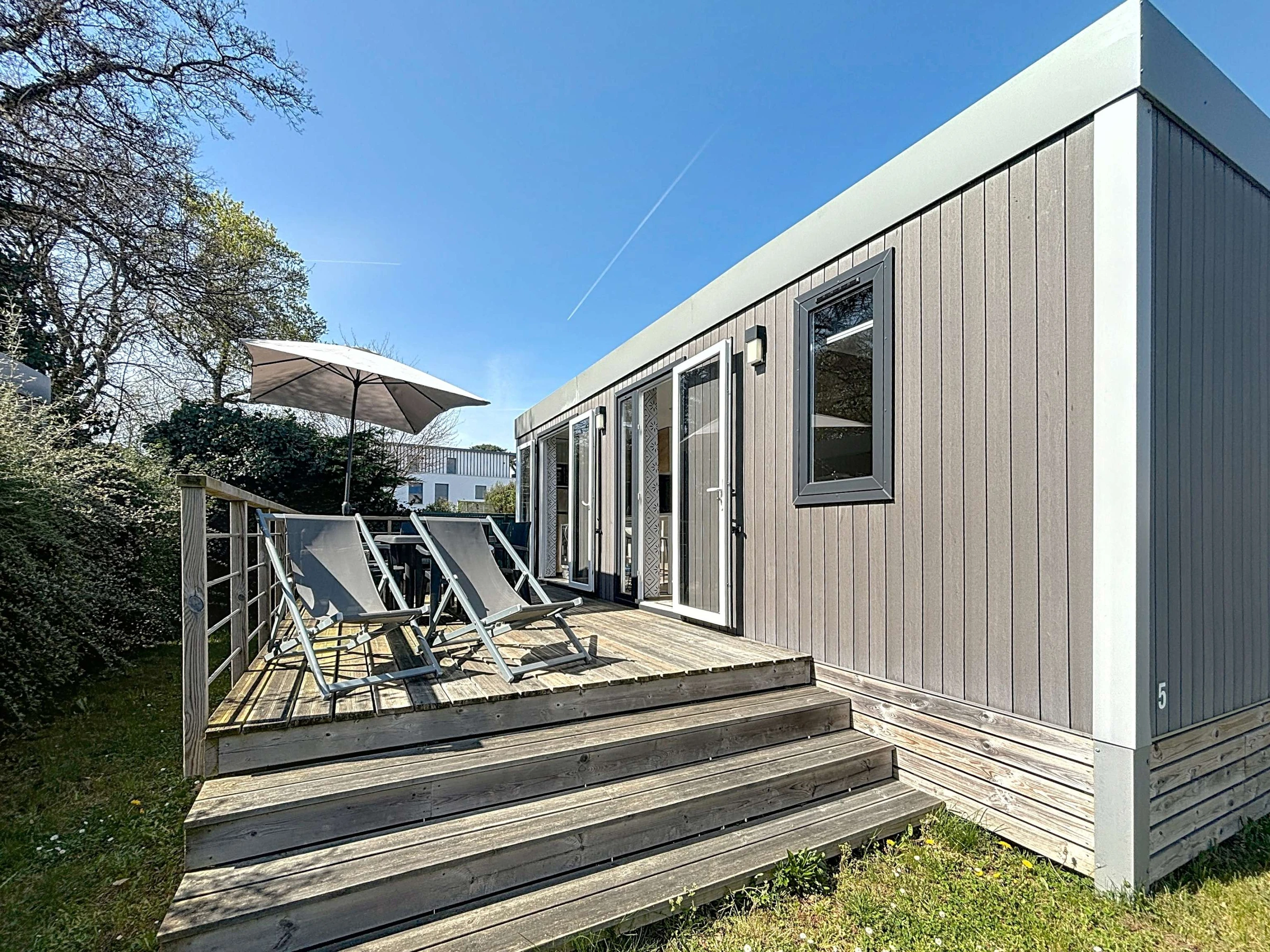 Dieses komfortable Mobilheim mit 2 Schlafzimmern für 4 Personen (31 m²) wird Sie begeistern. Es verfügt über einen Wohnbereich mit voll ausgestatteter Küchenzeile, einen Aufenthaltsraum mit TV und Sofa, ein Schlafzimmer mit Doppelbett (160 x 200 cm), ein zweites Schlafzimmer mit Etagenbett, ein Duschbad und ein separates WC. Die Holzterrasse mit Außenküche lädt zum Verweilen ein. Ein Parkplatz für ein Fahrzeug ist vorhanden. Die Endreinigung und kostenloses WLAN sind inklusive!