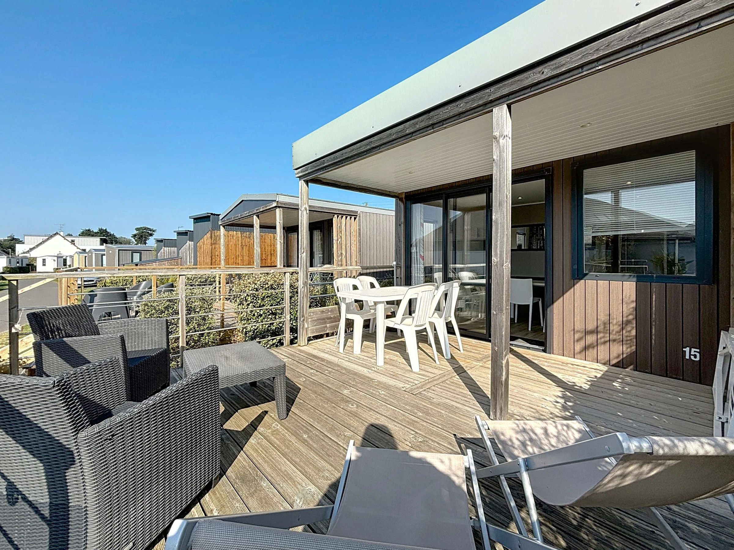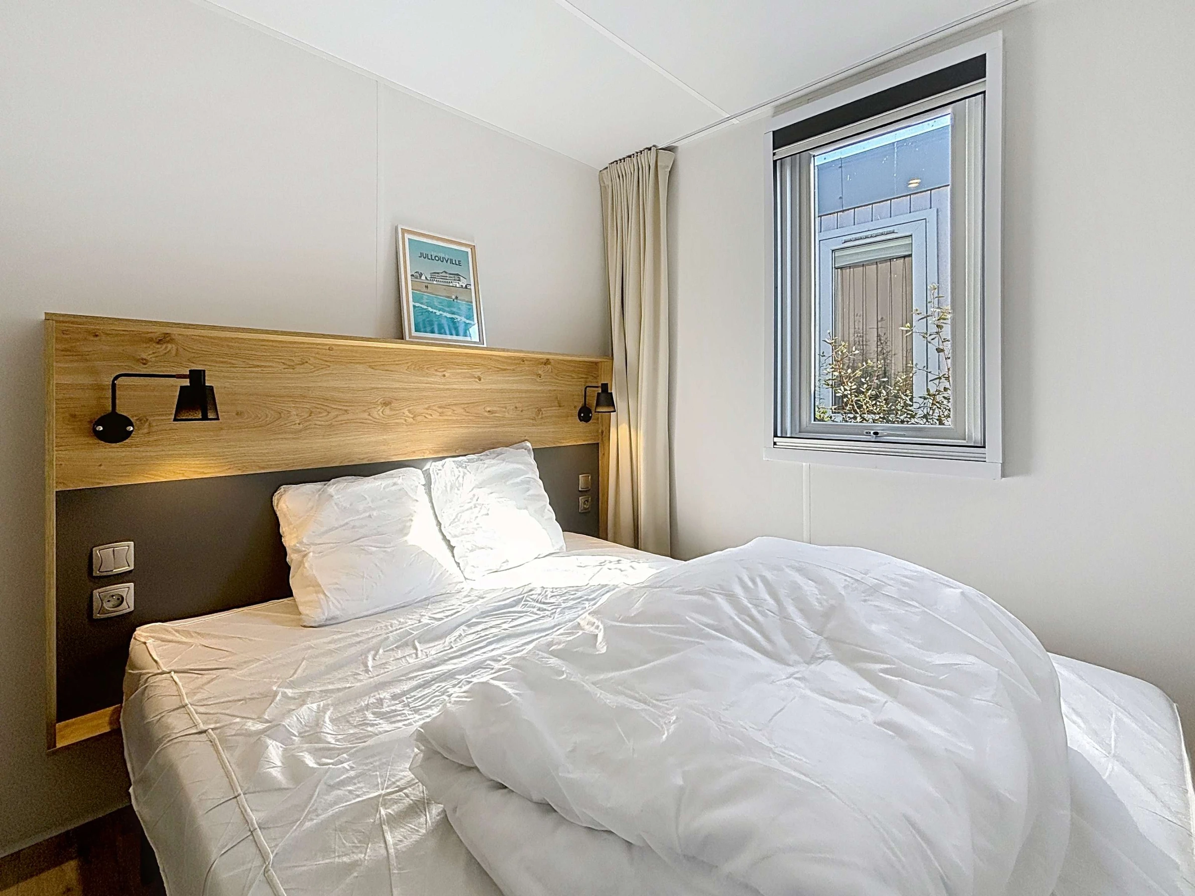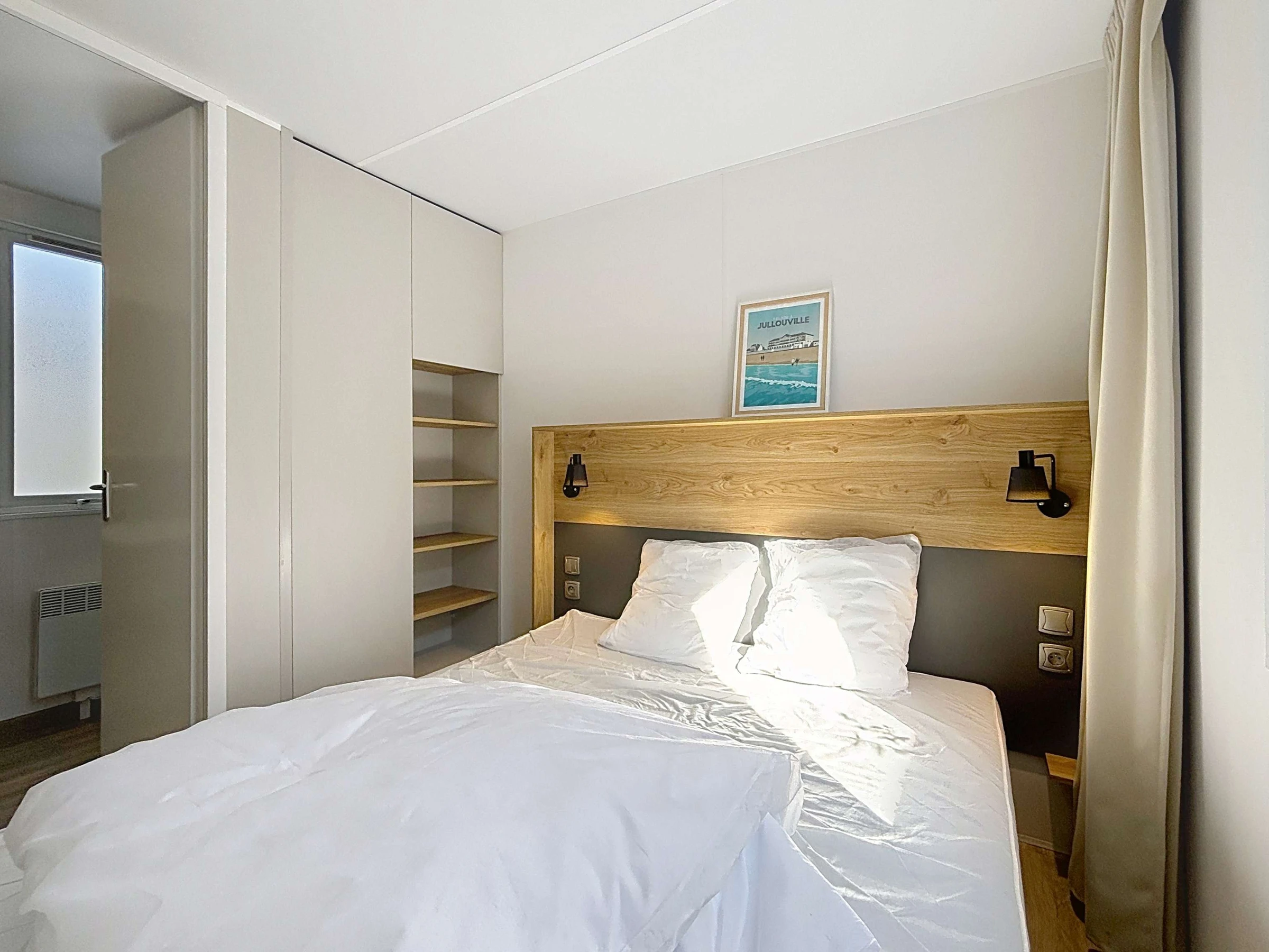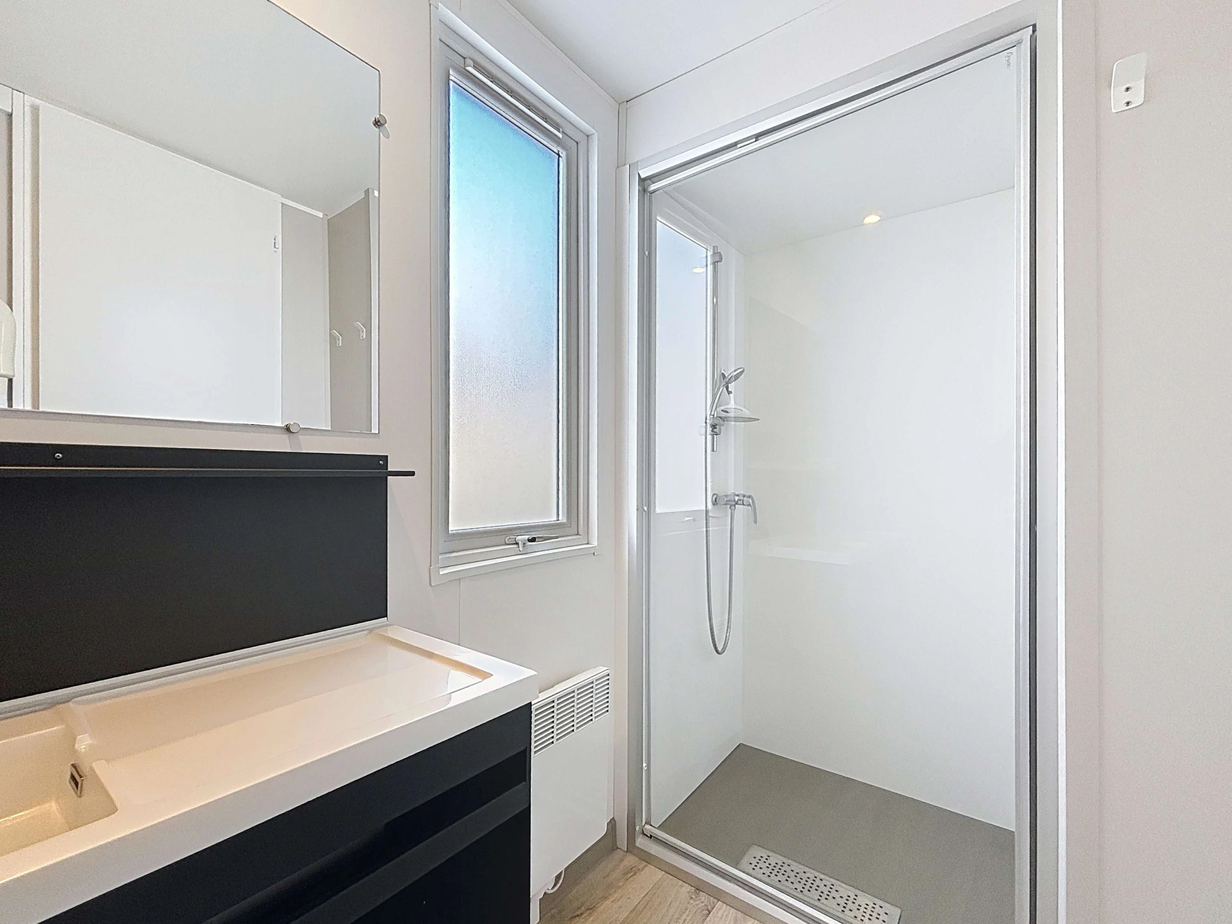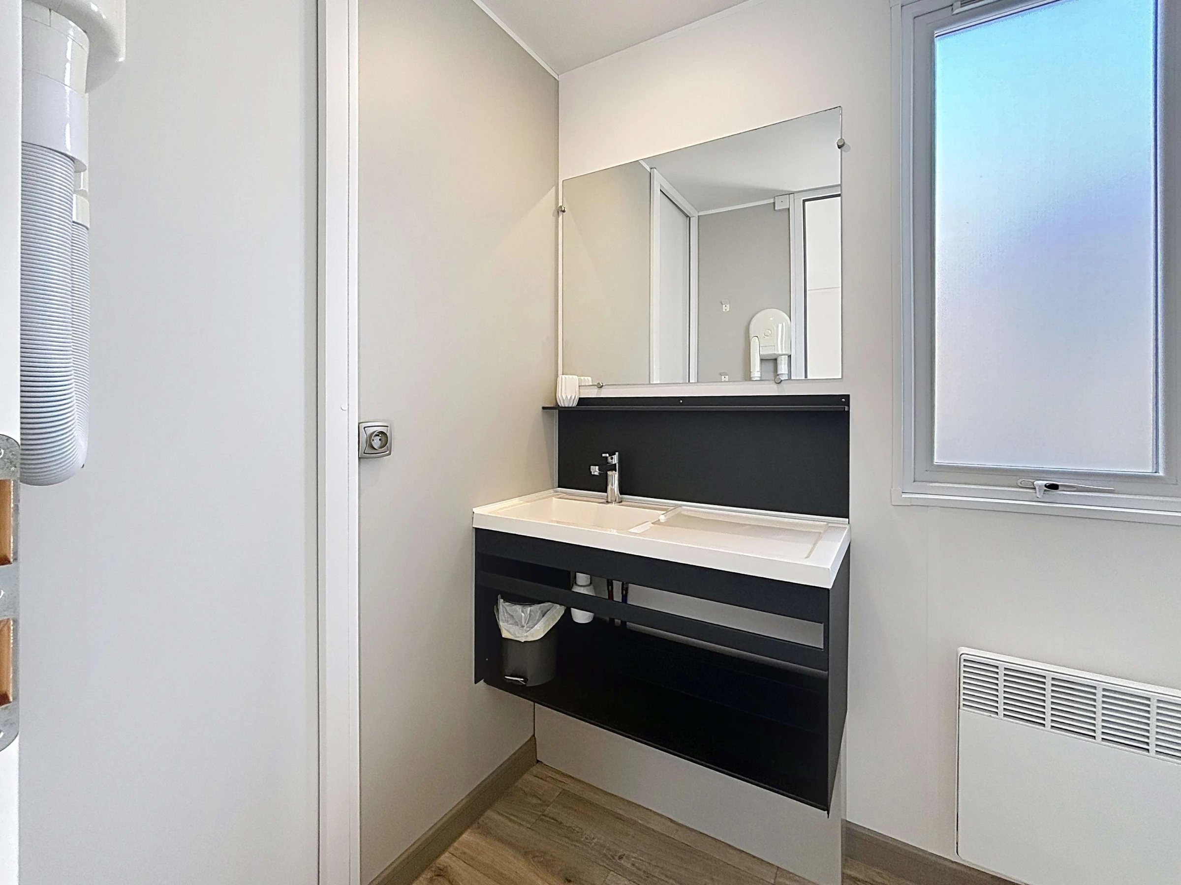 Lassen Sie sich von diesem 28 m² großen, komfortablen Mobilheim mit 2 Schlafzimmern für 4 Personen verführen. Es verfügt über ein Wohnzimmer mit einer ausgestatteten Küchenzeile, einen Wohnbereich mit TV und Sofa, ein Schlafzimmer mit einem Doppelbett (160 x 200 cm), ein zweites Schlafzimmer mit zwei Etagenbetten (90 cm), ein Badezimmer und ein separates WC. Genießen Sie die überdachte und ausgestattete Holzterrasse. Auf dem Gelände steht ein Parkplatz für ein Fahrzeug zur Verfügung.