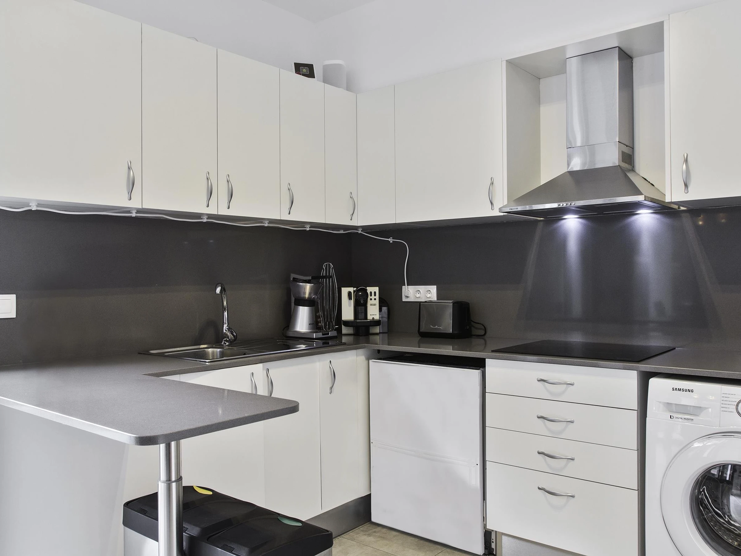 Dieses offene küche, mit ceranfeld, ist ausgestattet in kühlschrank, mikrowelle, backofen, gefrierschrank, spülmaschine, geschirr/besteck, kaffeemaschine, toaster, wasserkocher und saftpresse.