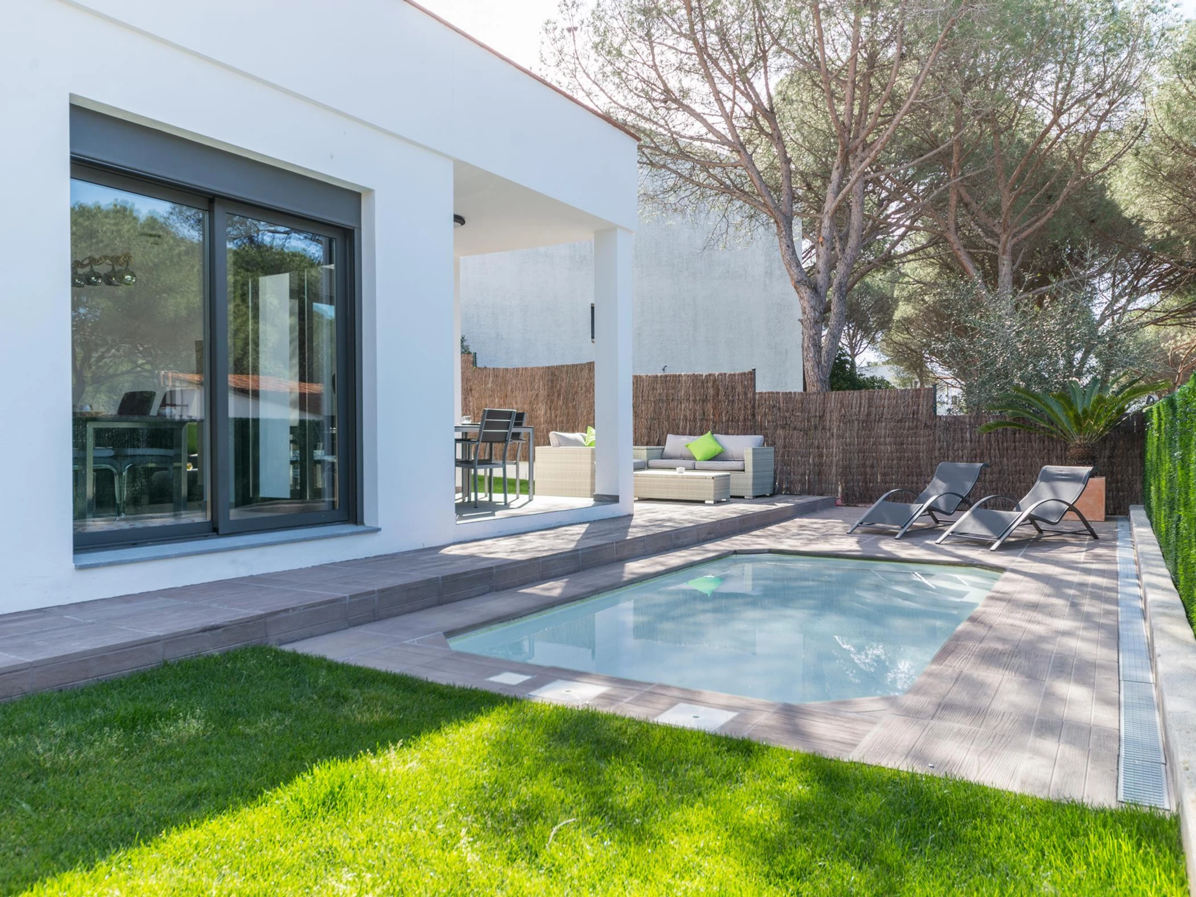 Die Unterkunft verfügt über garten, gartenmöbel, umzäuntes grundstück, terrasse, waschmaschine, trockner, grill, kamin, bügeleisen/-brett, internet (WLAN), haartrockner, heizung, klimaanlage, swimming-pool privater pool, parkplatz im freien in auf dem grundstück, 1 Fernseher.