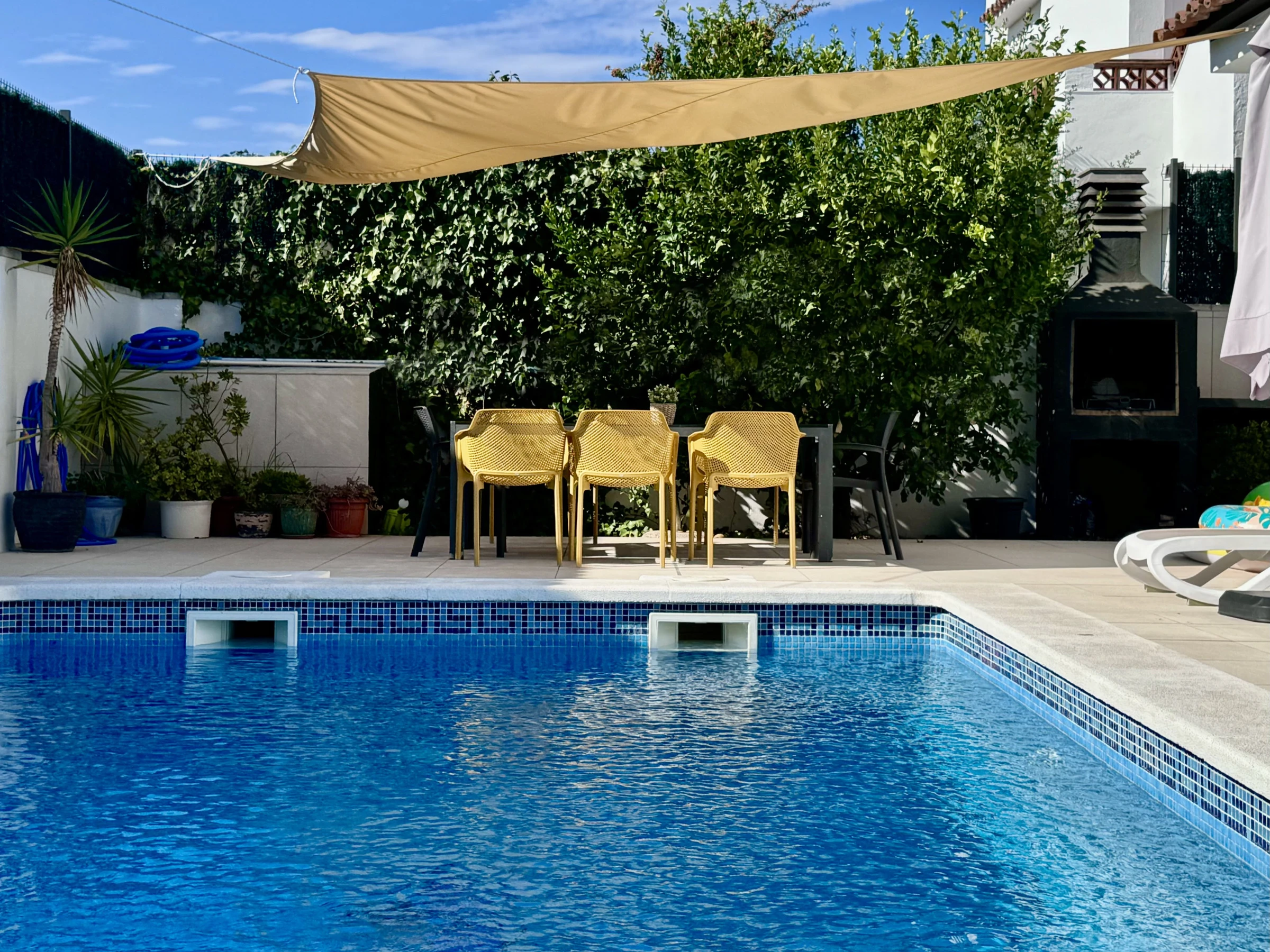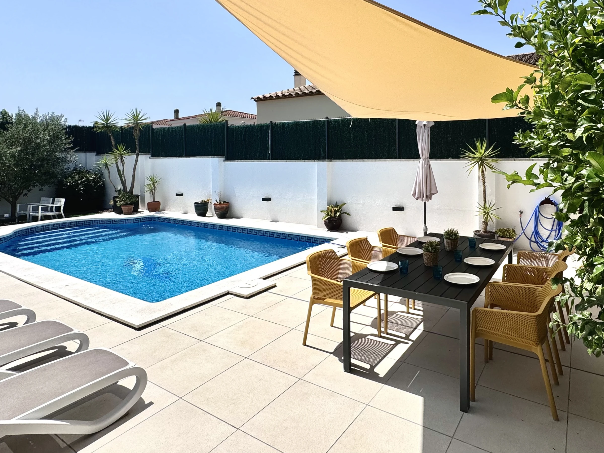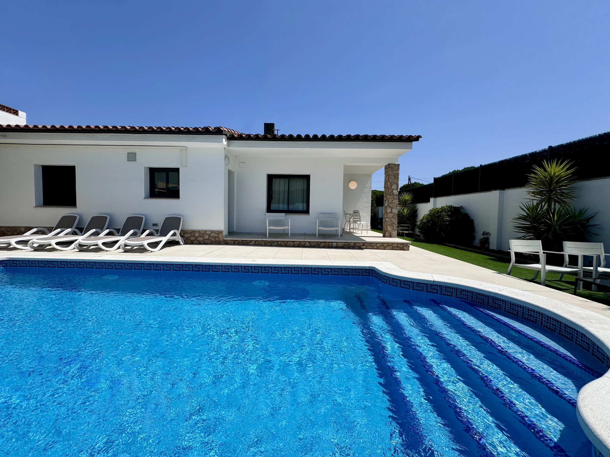 Die Unterkunft verfügt über garten, gartenmöbel, umzäuntes grundstück, terrasse, waschmaschine, grill, bügeleisen/-brett, internet (WLAN), haartrockner, elektroheizung, klimaanlage nur im esszimmer, swimming-pool privater pool, garage in auf dem grundstück, 1 Fernseher.