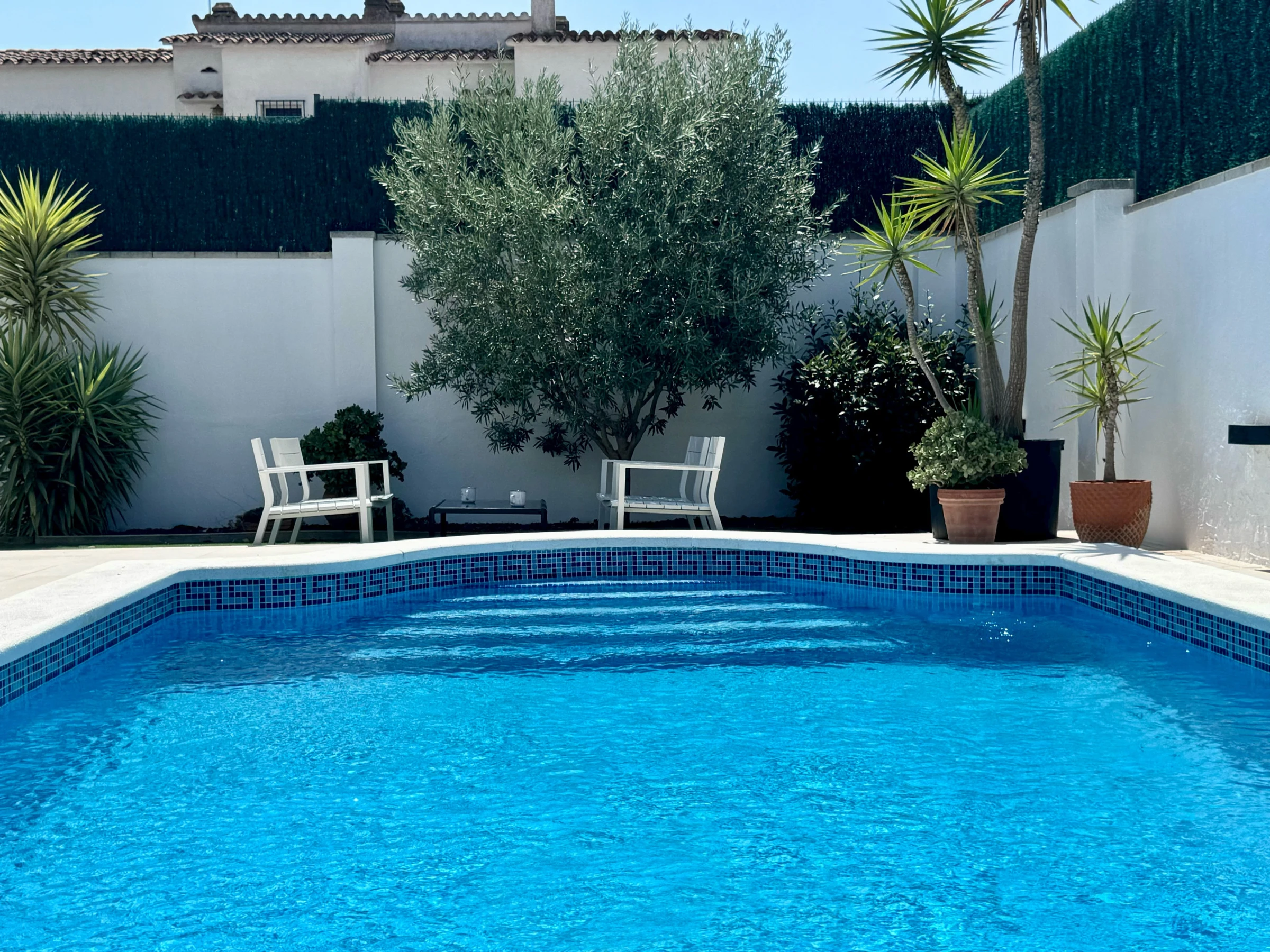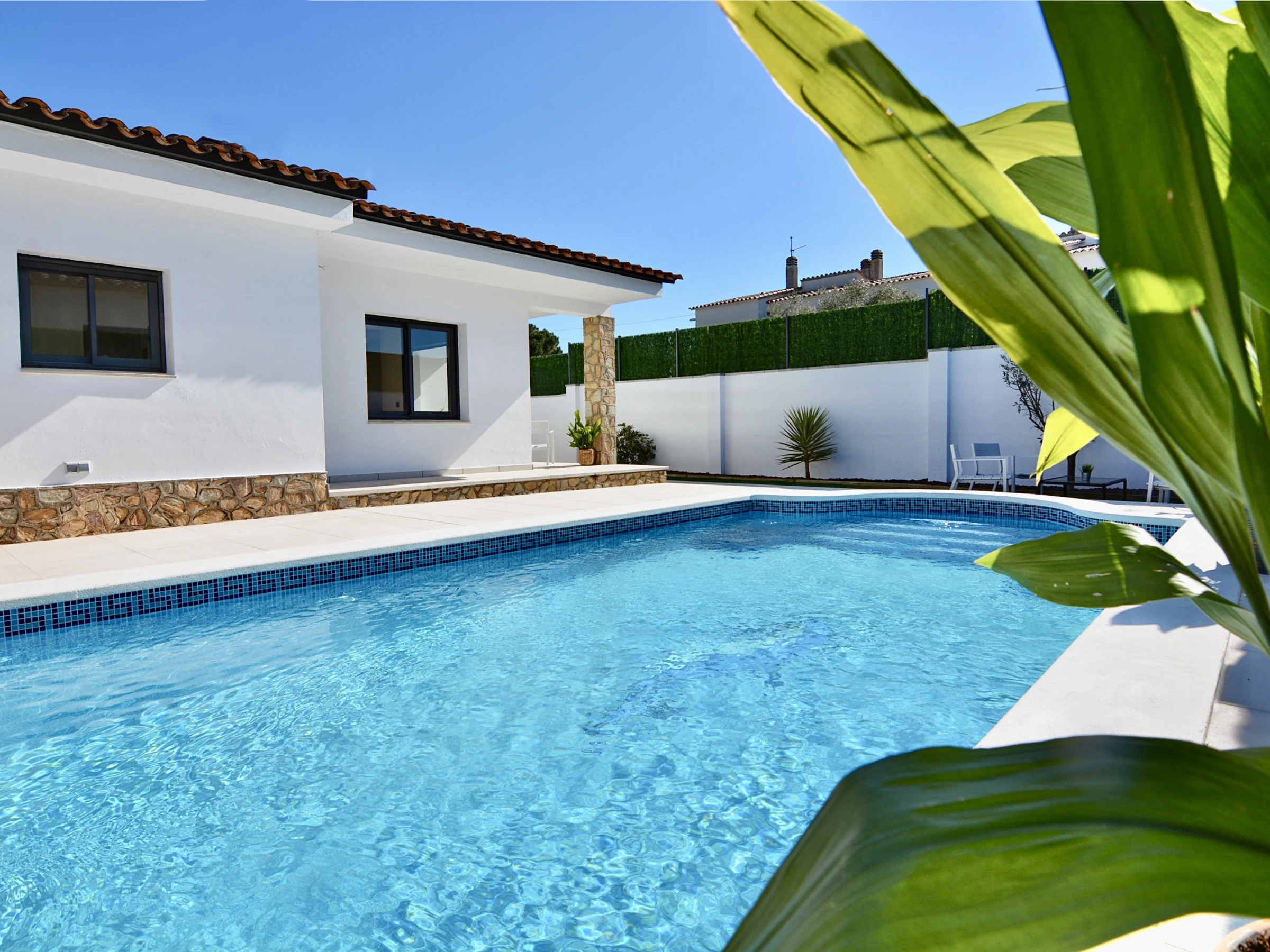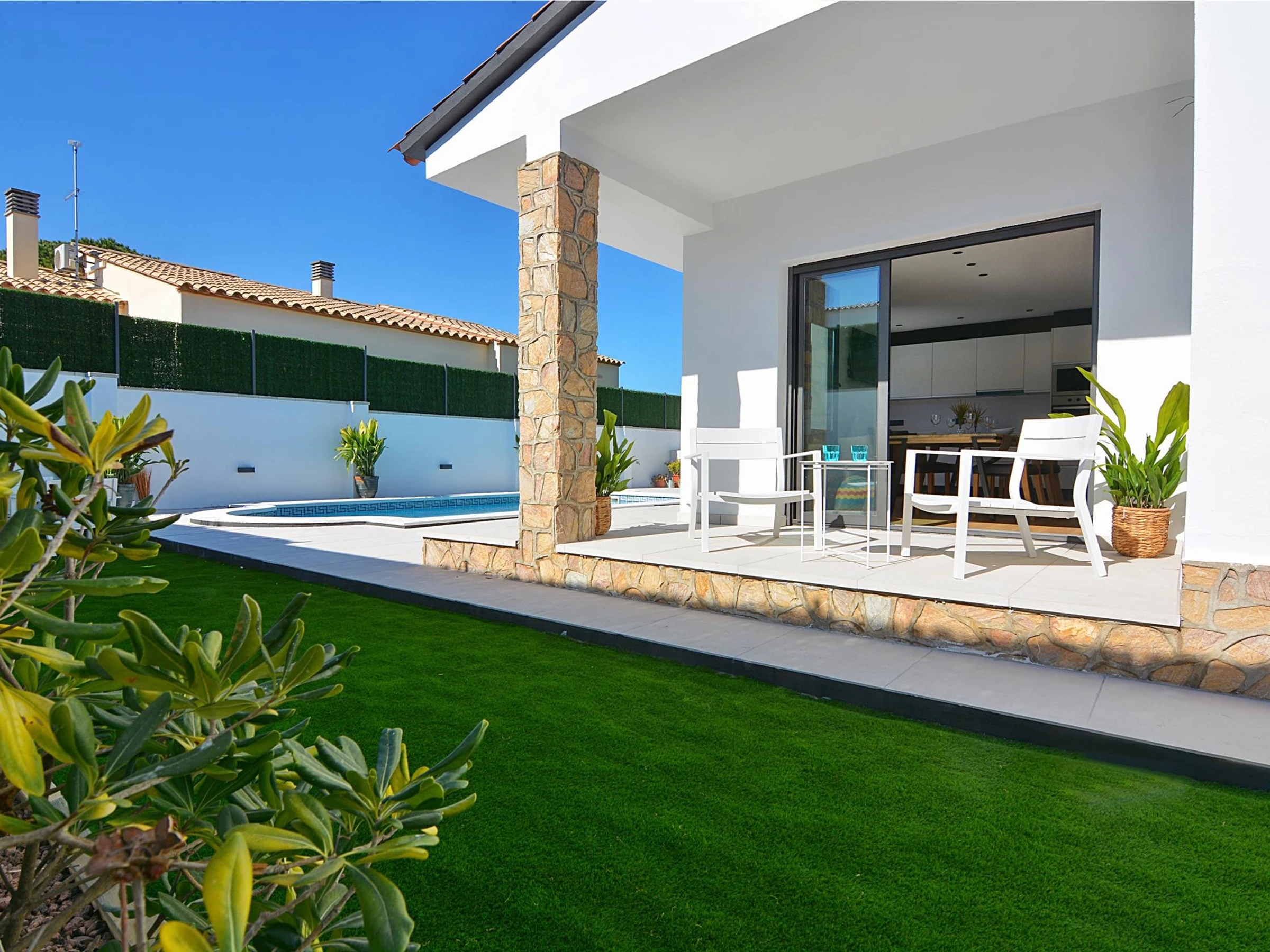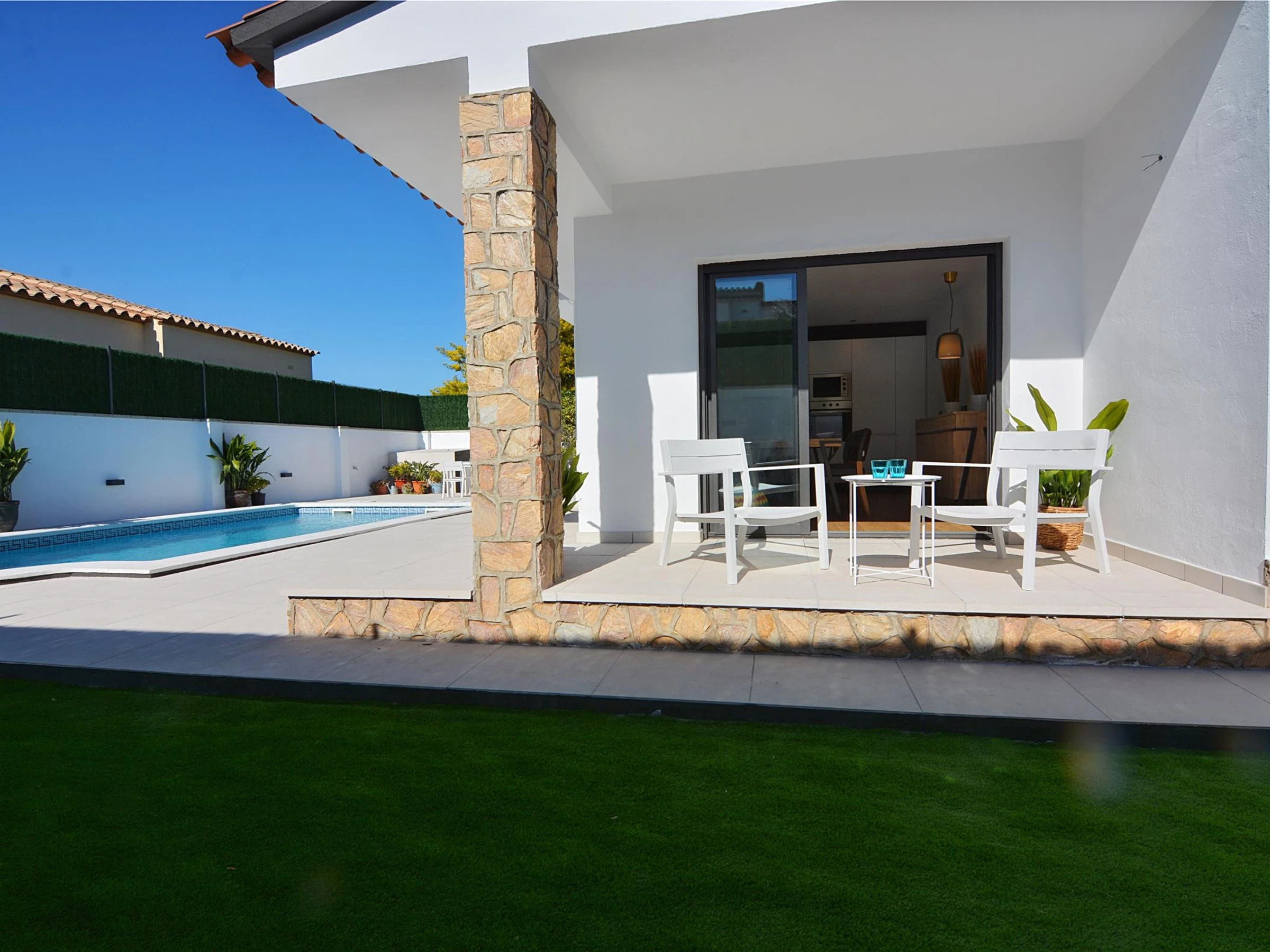 Die Unterkunft verfügt über garten, gartenmöbel, umzäuntes grundstück, terrasse, waschmaschine, grill, bügeleisen/-brett, internet (WLAN), haartrockner, elektroheizung, klimaanlage nur im esszimmer, swimming-pool privater pool, garage in auf dem grundstück, 1 Fernseher.