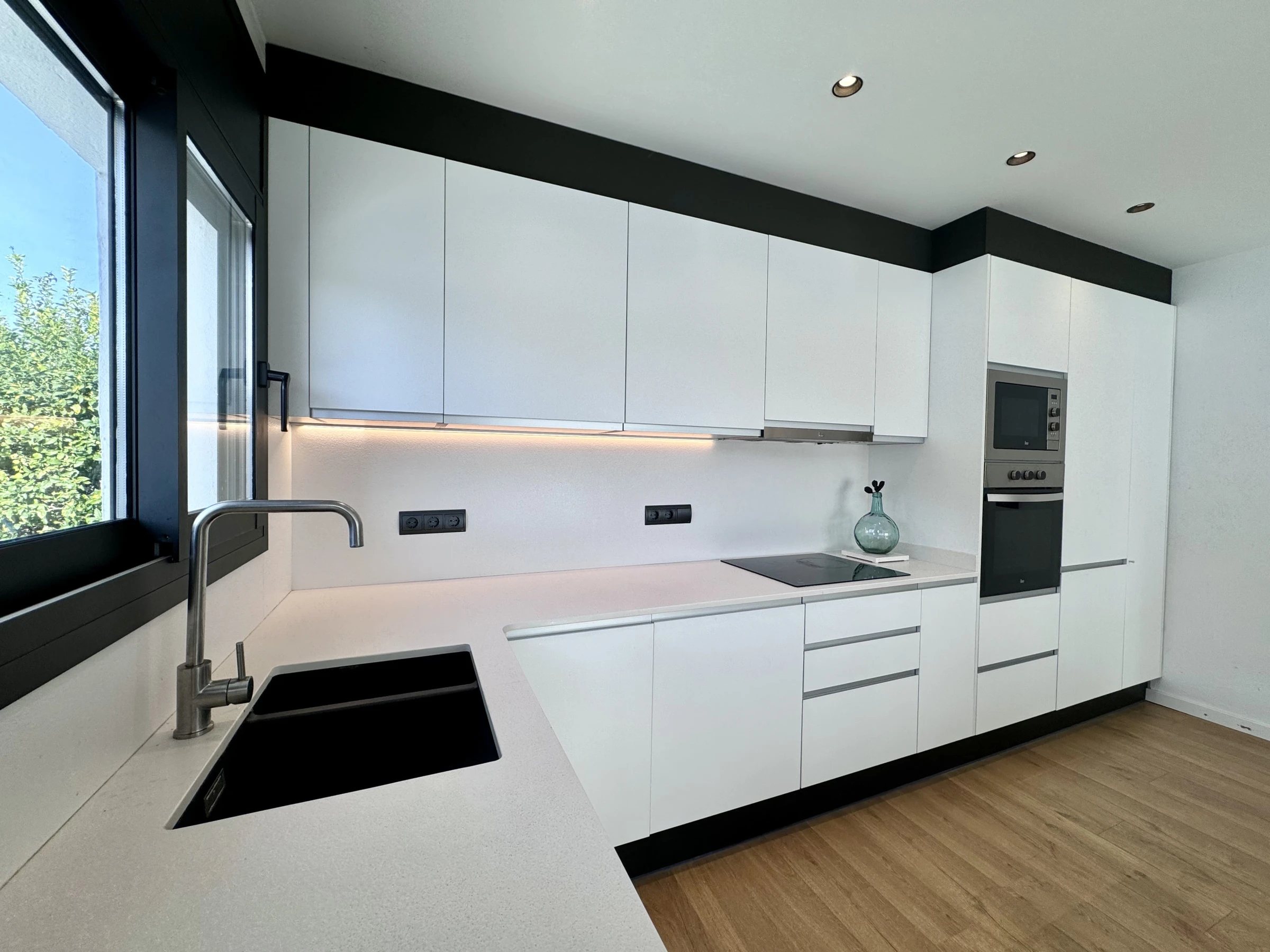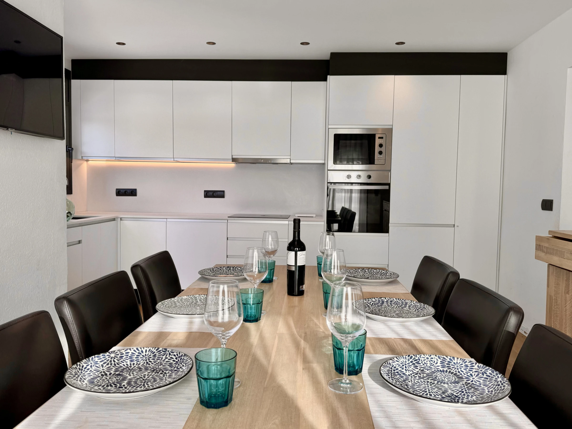 Dieses offene küche, mit induktions-kochfeld, ist ausgestattet in kühlschrank, mikrowelle, backofen, gefrierschrank, spülmaschine, geschirr/besteck, kaffeemaschine, toaster, wasserkocher und saftpresse.