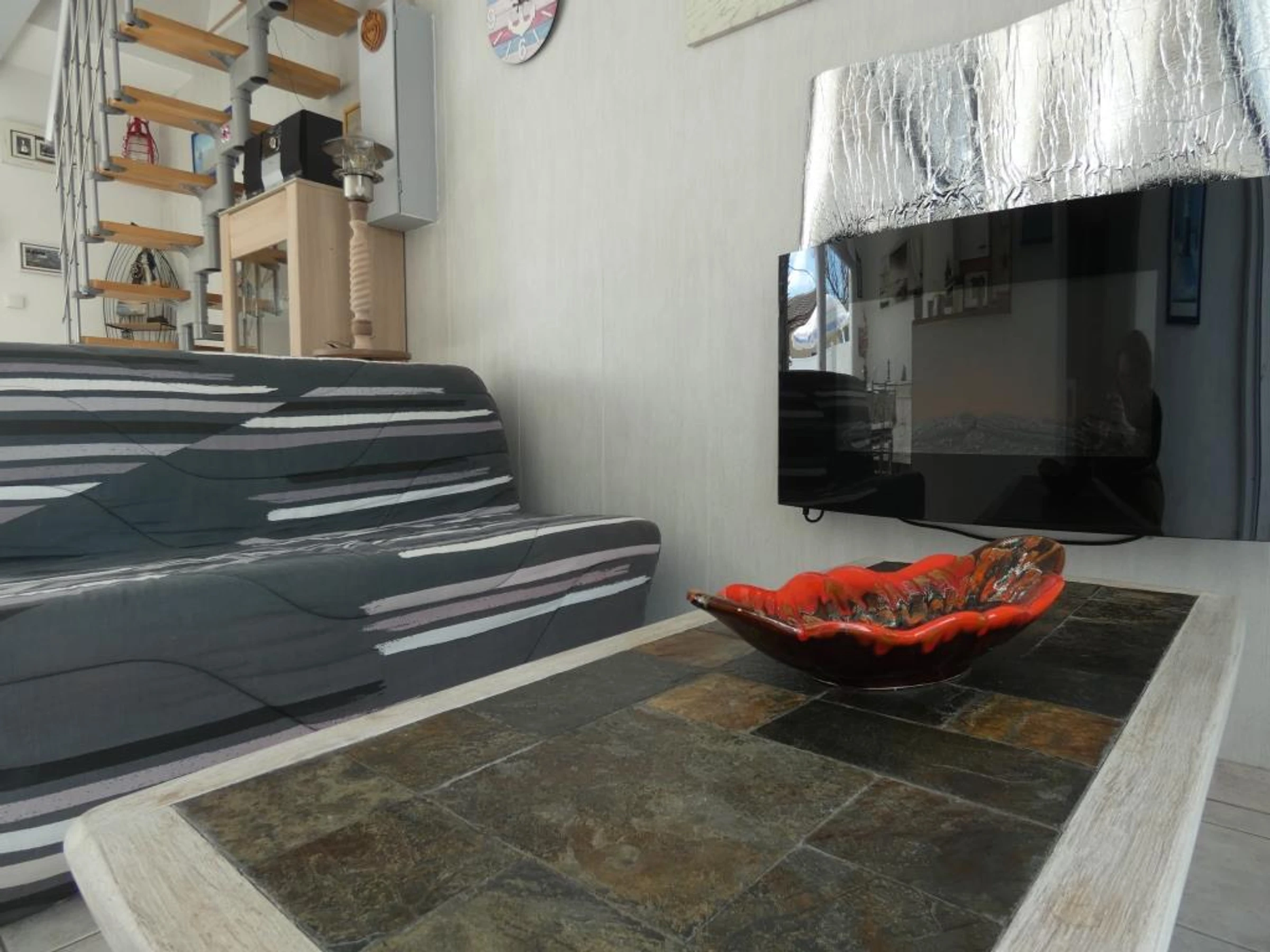 - Ein lichtdurchflutetes Wohnzimmer mit zwei Terrassen, ausgestattet mit einem Sofa, einem Couchtisch, einem großen Fernseher, einer Hi-Fi-Anlage und einer Kochnische.