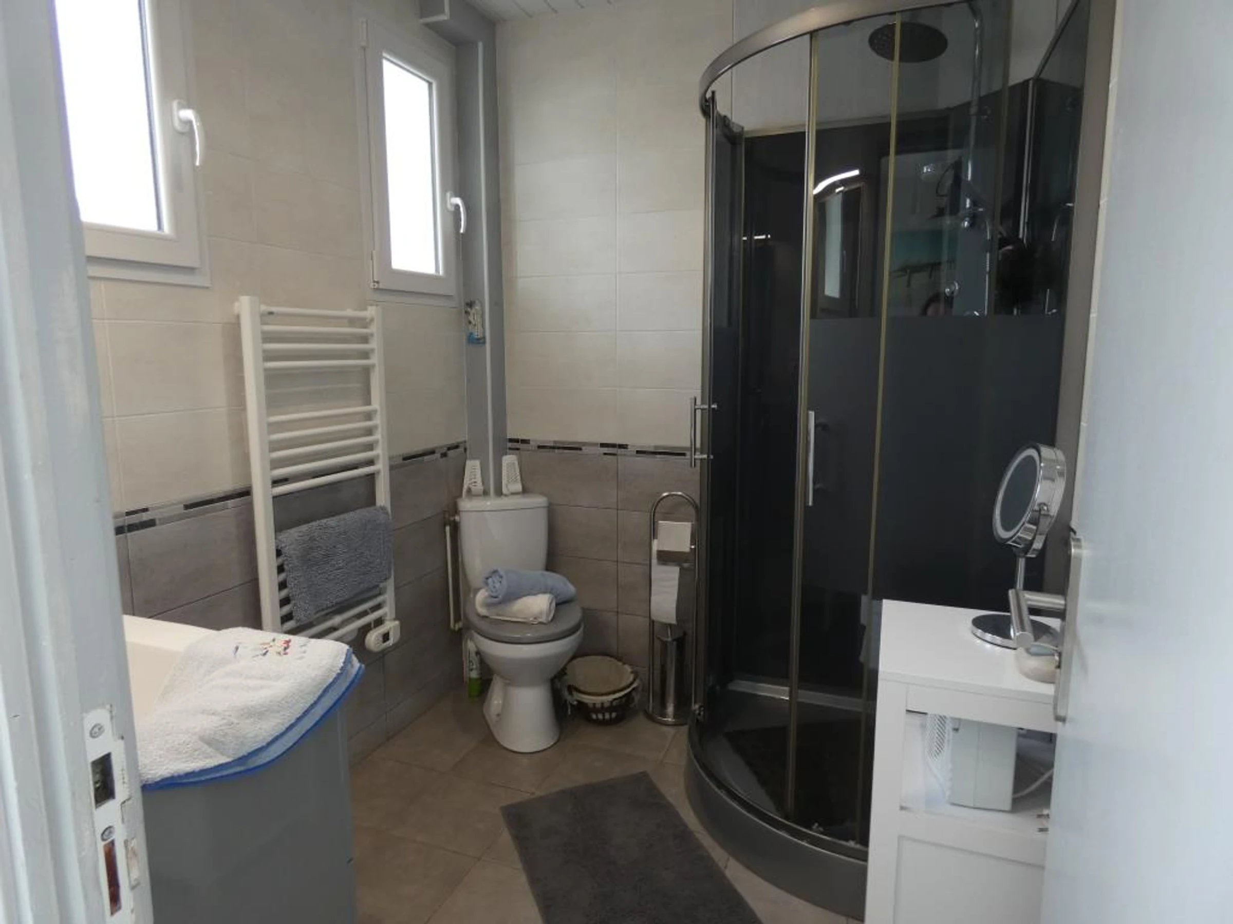 - Neues Bad mit Dusche, WC, Waschbecken, Spiegel und Stauraum.