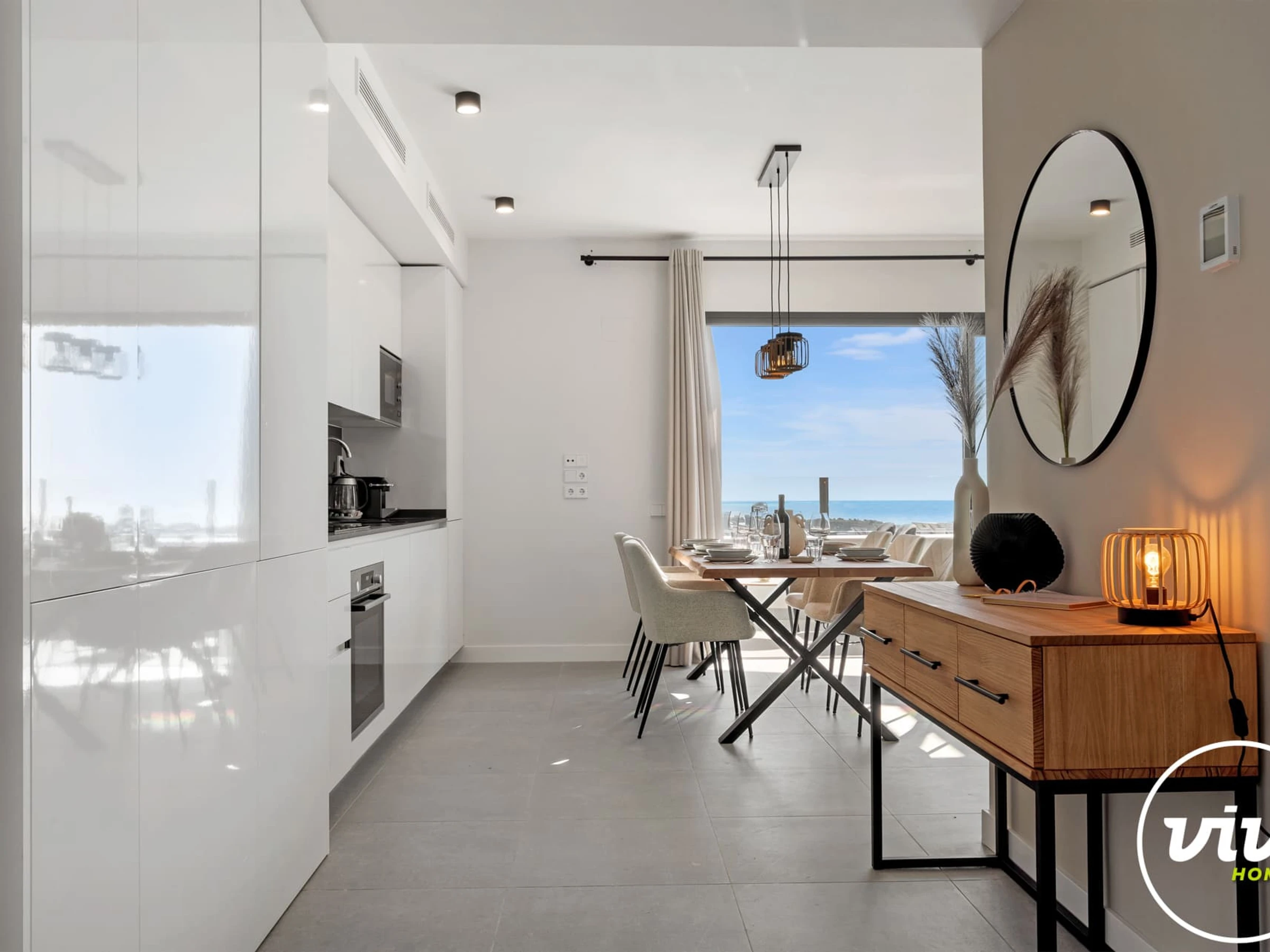Dieses offene küche, mit induktions-kochfeld, ist ausgestattet in kühlschrank, mikrowelle, backofen, gefrierschrank, spülmaschine, geschirr/besteck, kochutensilien, kaffeemaschine, toaster, wasserkocher und saftpresse.