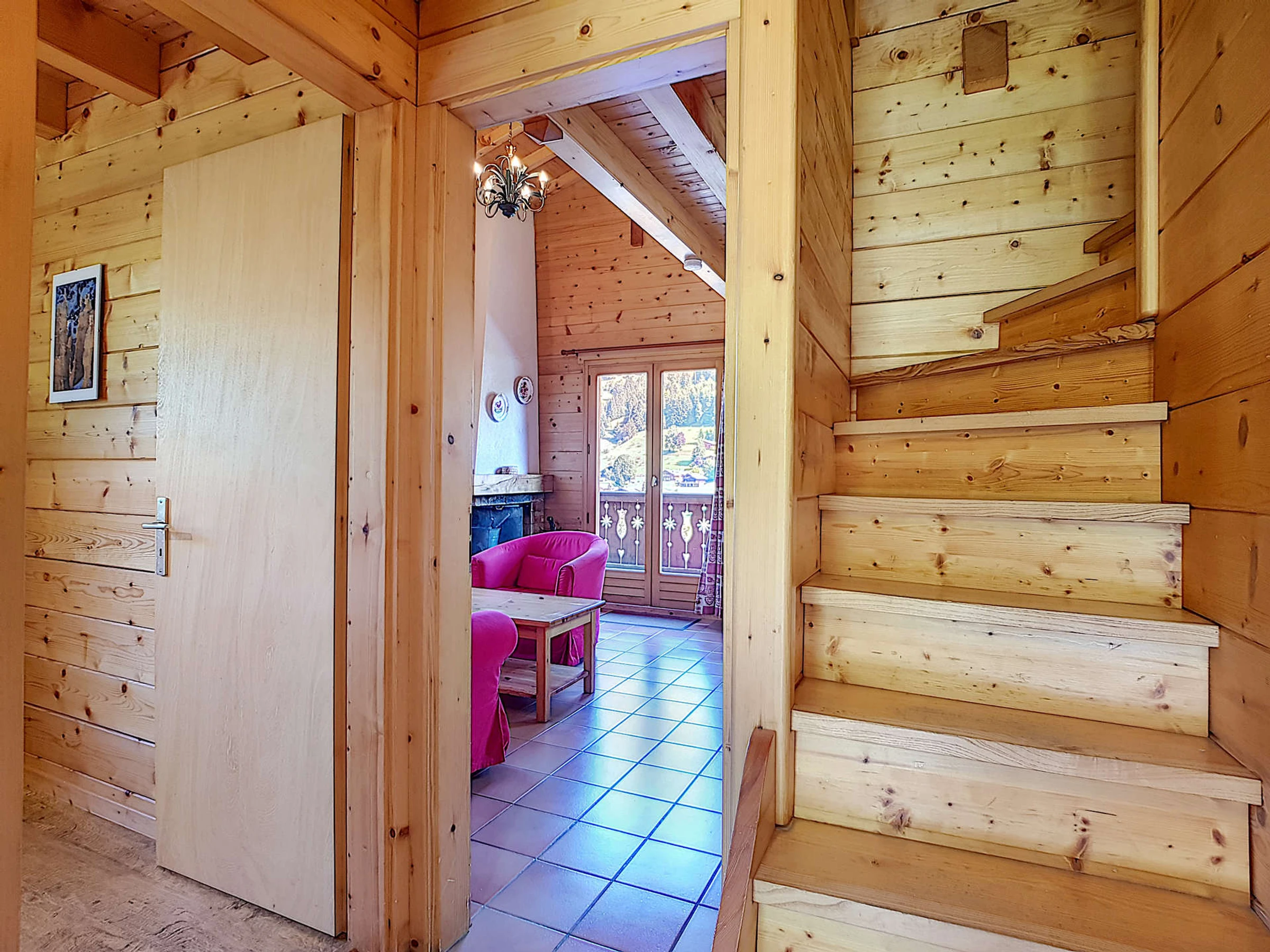 - Wohnzimmer mit Kamin, TV, Fenstertür und Zugang zum Ostbalkon und zur Nordterrasse (21,80 m²)