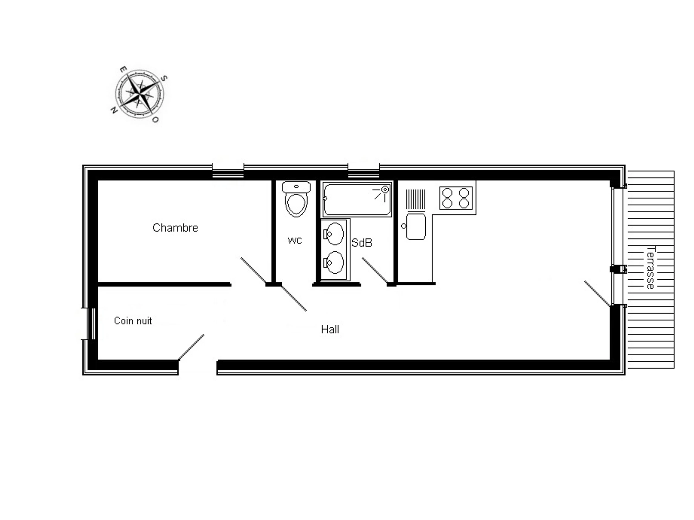 - Badezimmer (Badewanne, Waschbecken) (3,69 m²) (Waschmaschine im Schrank) – WC (1,08 m²) – Wasserkocher / Toaster / Filterkaffeemaschine