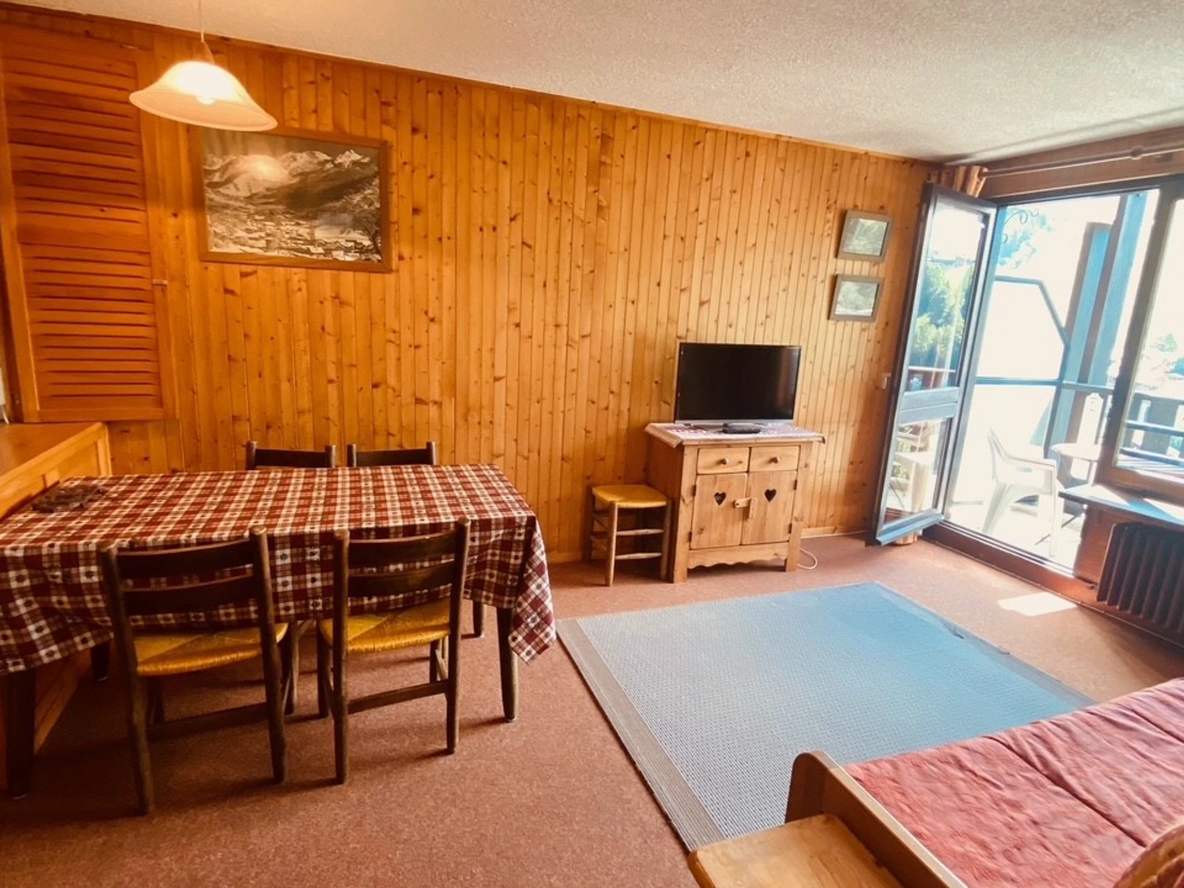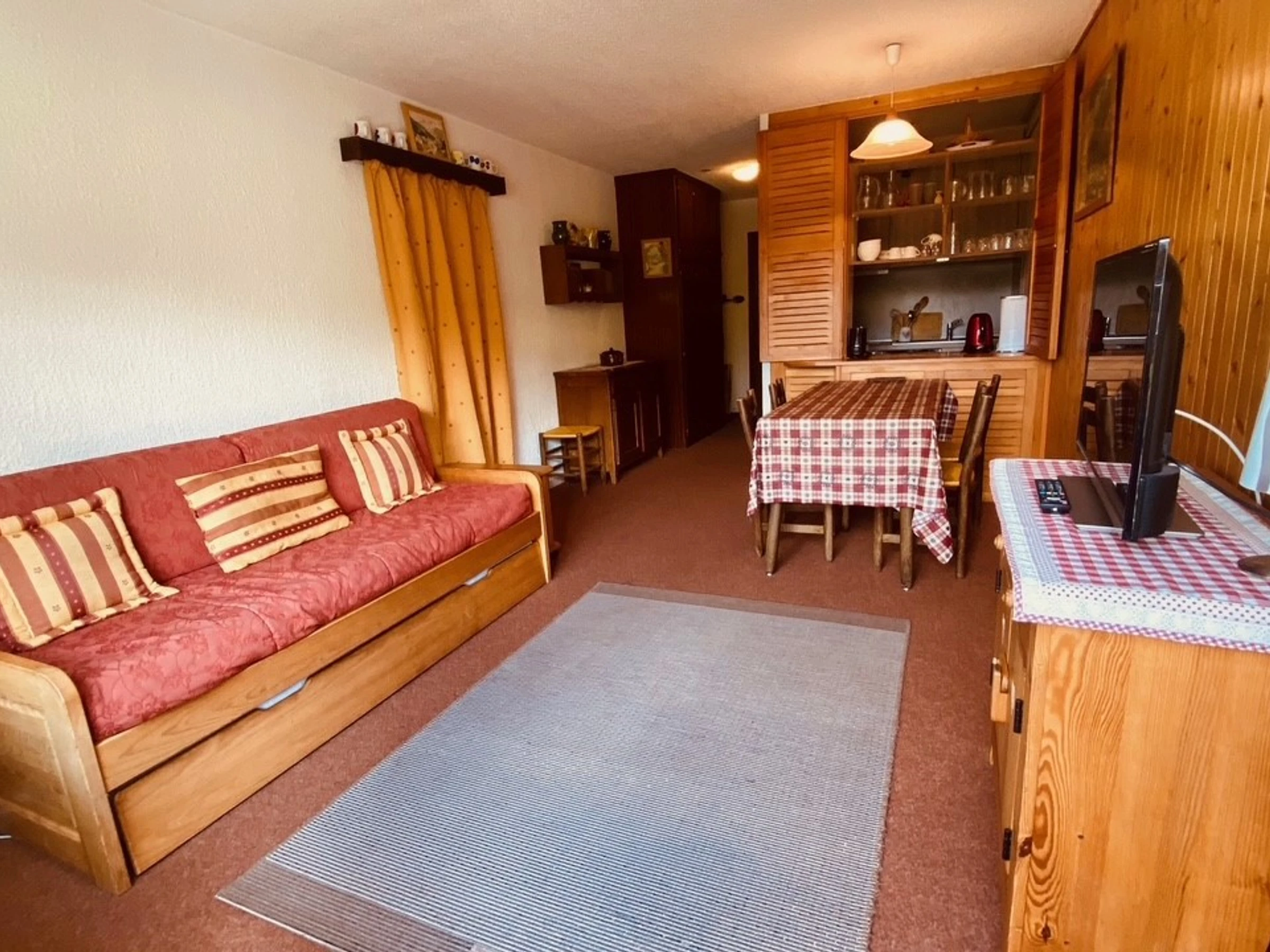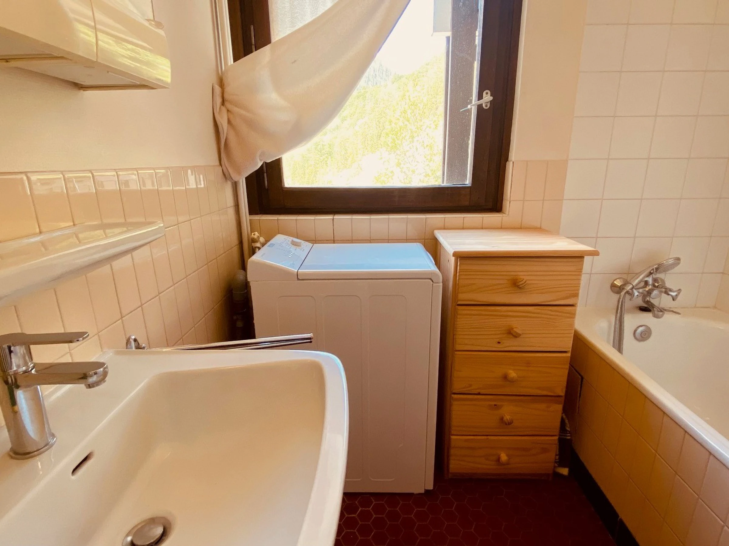 Eingang/Flur (9 m²): Kleiderschrank - Wohnzimmer (15 m²): Sofa, Fernseher, Couchtisch, Panoramafenster mit Zugang zum Südbalkon - Essbereich: Tisch und Stühle - Küchenecke: 4 Elektrokochplatten, Backofen, Mikrowelle, Tassimo-Kaffeemaschine, Kühlschrank (100 l), Geschirrspüler, Schränke - Zimmer (9,56 m²): 1 Bett, Kleiderschrank, Südfenstertür + Fenster mit Blick auf das Dorf - Badezimmer: Badewanne, Waschbecken, Waschmaschine - WC - Schlafecke (4,50 m²): 1 Bett - Kleiderschrank (1,5 m²)