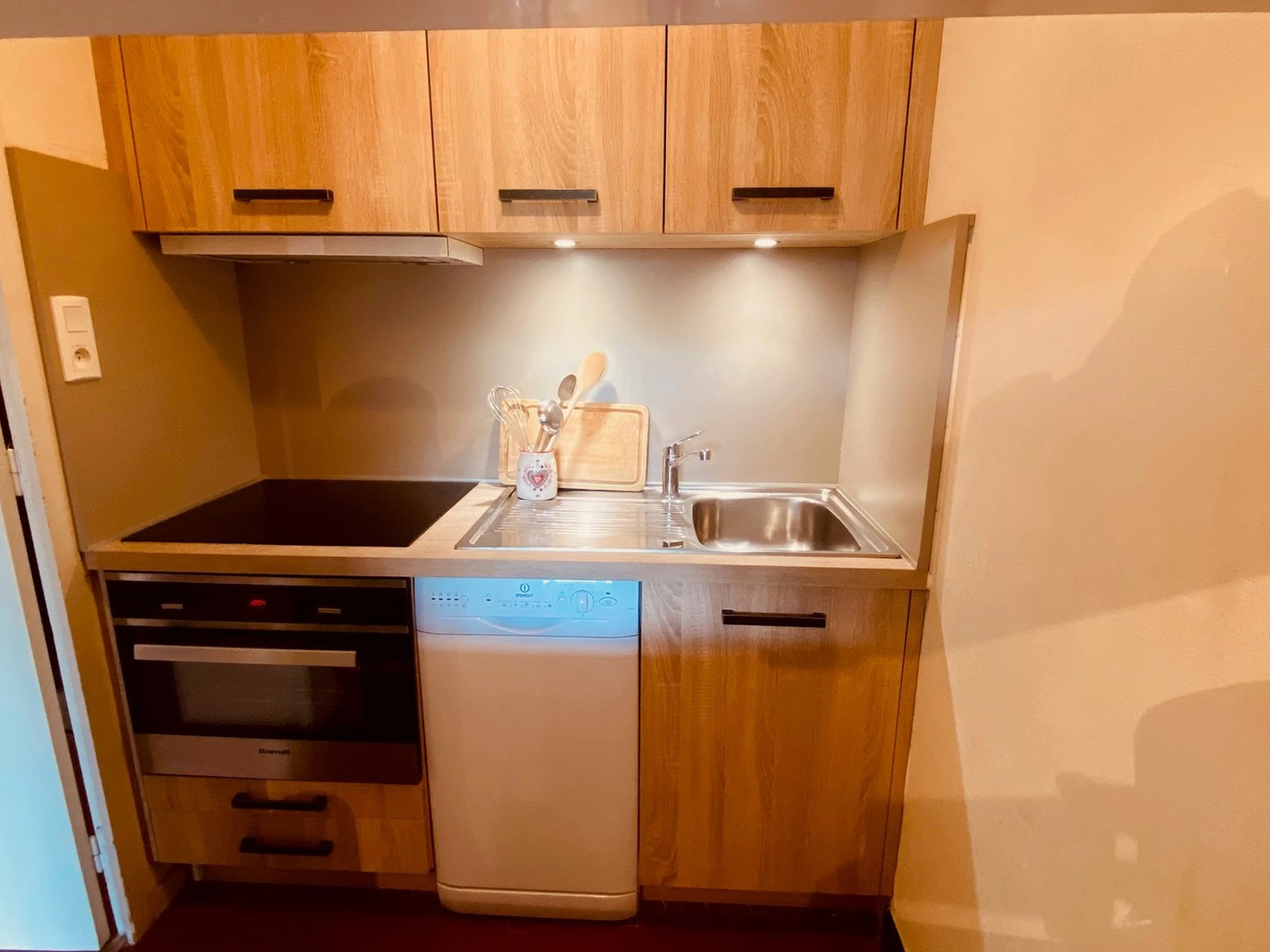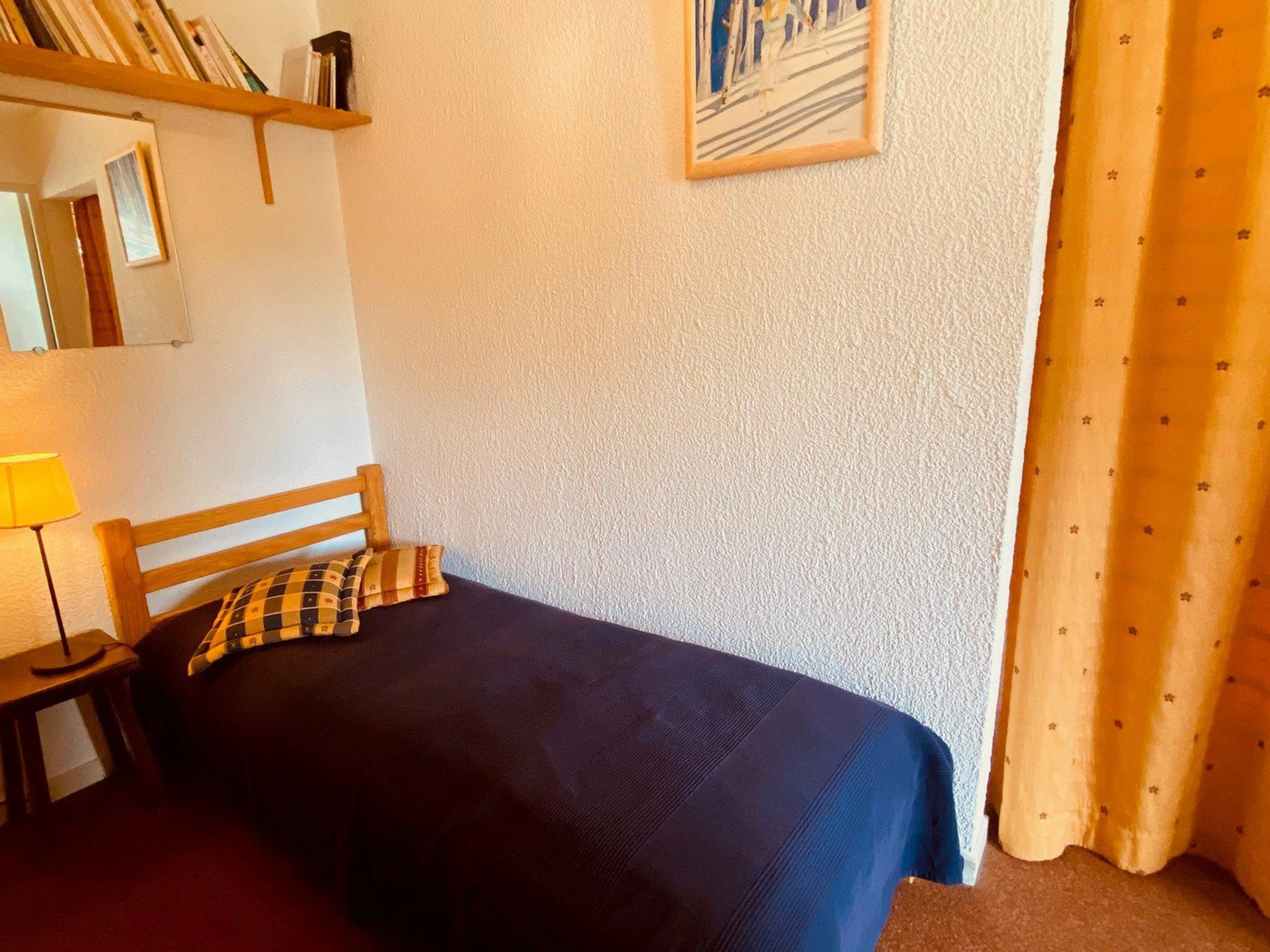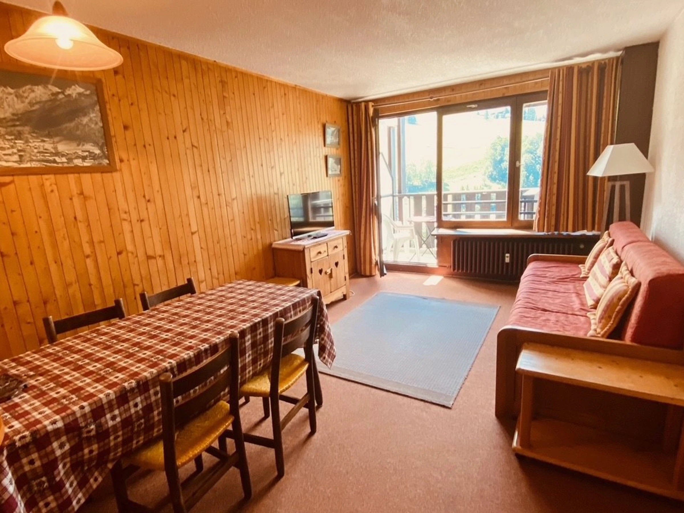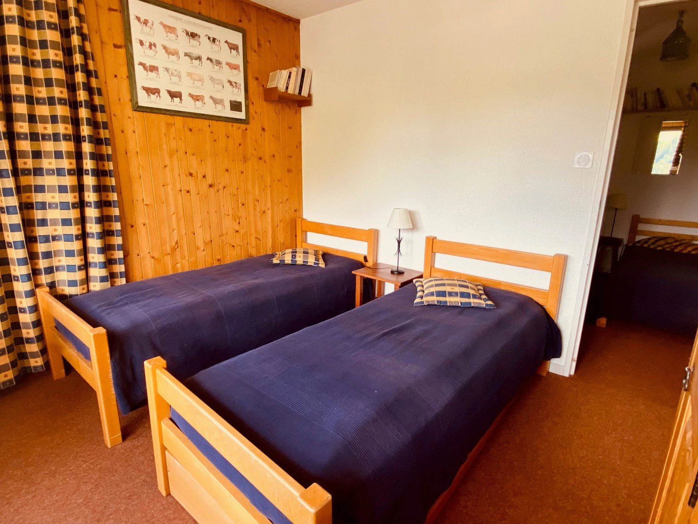 Eingang/Flur (9 m²): Kleiderschrank - Wohnzimmer (15 m²): Sofa, Fernseher, Couchtisch, Panoramafenster mit Zugang zum Südbalkon - Essbereich: Tisch und Stühle - Küchenecke: 4 Elektrokochplatten, Backofen, Mikrowelle, Tassimo-Kaffeemaschine, Kühlschrank (100 l), Geschirrspüler, Schränke - Zimmer (9,56 m²): 1 Bett, Kleiderschrank, Südfenstertür + Fenster mit Blick auf das Dorf - Badezimmer: Badewanne, Waschbecken, Waschmaschine - WC - Schlafecke (4,50 m²): 1 Bett - Kleiderschrank (1,5 m²)